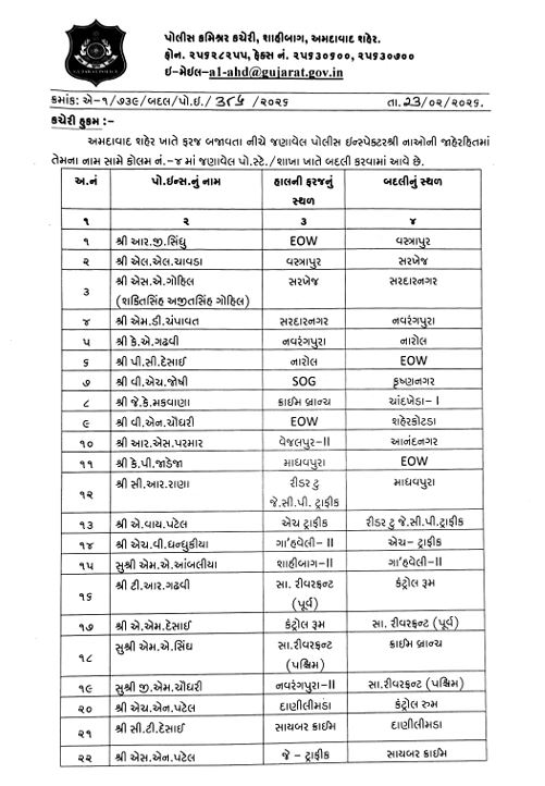 અમદાવાદ શહેર પોલીસ વિભાગમાં મોટાપાયે ફેરબદલી કરવામાં આવી છે. શહેરમાં કુલ 27 પોલીસ ઇન્સ્પેક્ટર (PI)ની બદલી કરવામાં આવી છે. સાથે જ લિવ રિઝર્વમાં 8 PIની નિમણૂંક કરવામાં આવી છે. લાંબા સમયથી ઇન્ચાર્જના આધારે ચાલતા અનેક પોલીસ સ્ટેશનોને હવે નિયમિત PI મળતા કામગીરીમાં ઝડપ અને સુવ્યવસ્થા આવવાની આશા વ્યક્ત થઈ રહી છે.