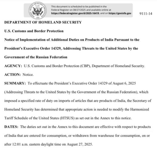 અમેરિકાના રાષ્ટ્રપતિ ડોનાલ્ડ ટ્રમ્પે ભારત પર 50 ટકા ટેરિફ લાદવાની નોટિસ જાહેર કરી છે. નવો ટેરિફ નિયમ 27 ઑગસ્ટની મધરાતે 12:01 વાગ્યાથી અમલમાં આવશે. ટ્રમ્પે આ નિર્ણય ભારત દ્વારા રશિયા પાસેથી સતત તેલની ખરીદી સામેના વિરોધ સ્વરૂપ લીધો છે.