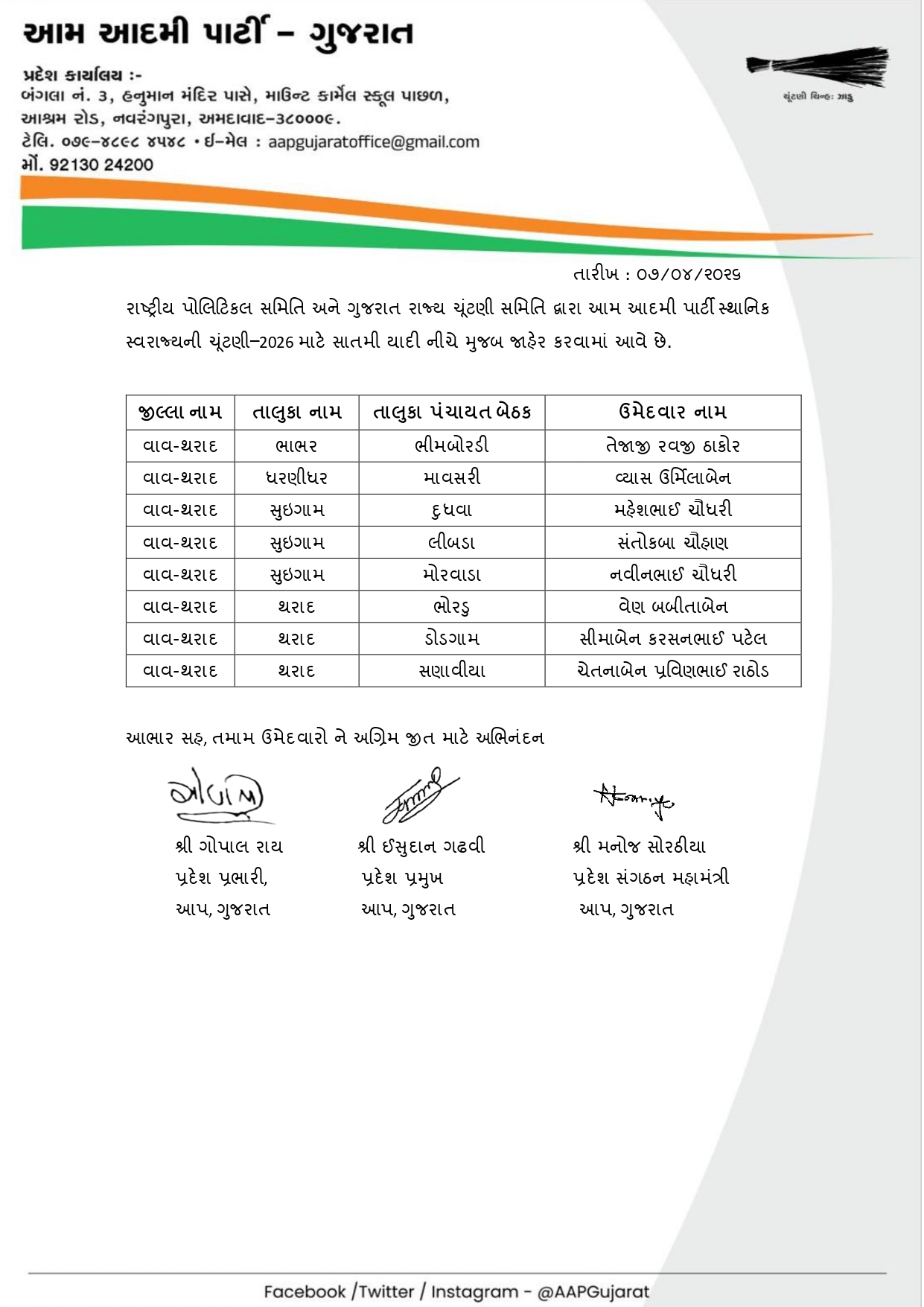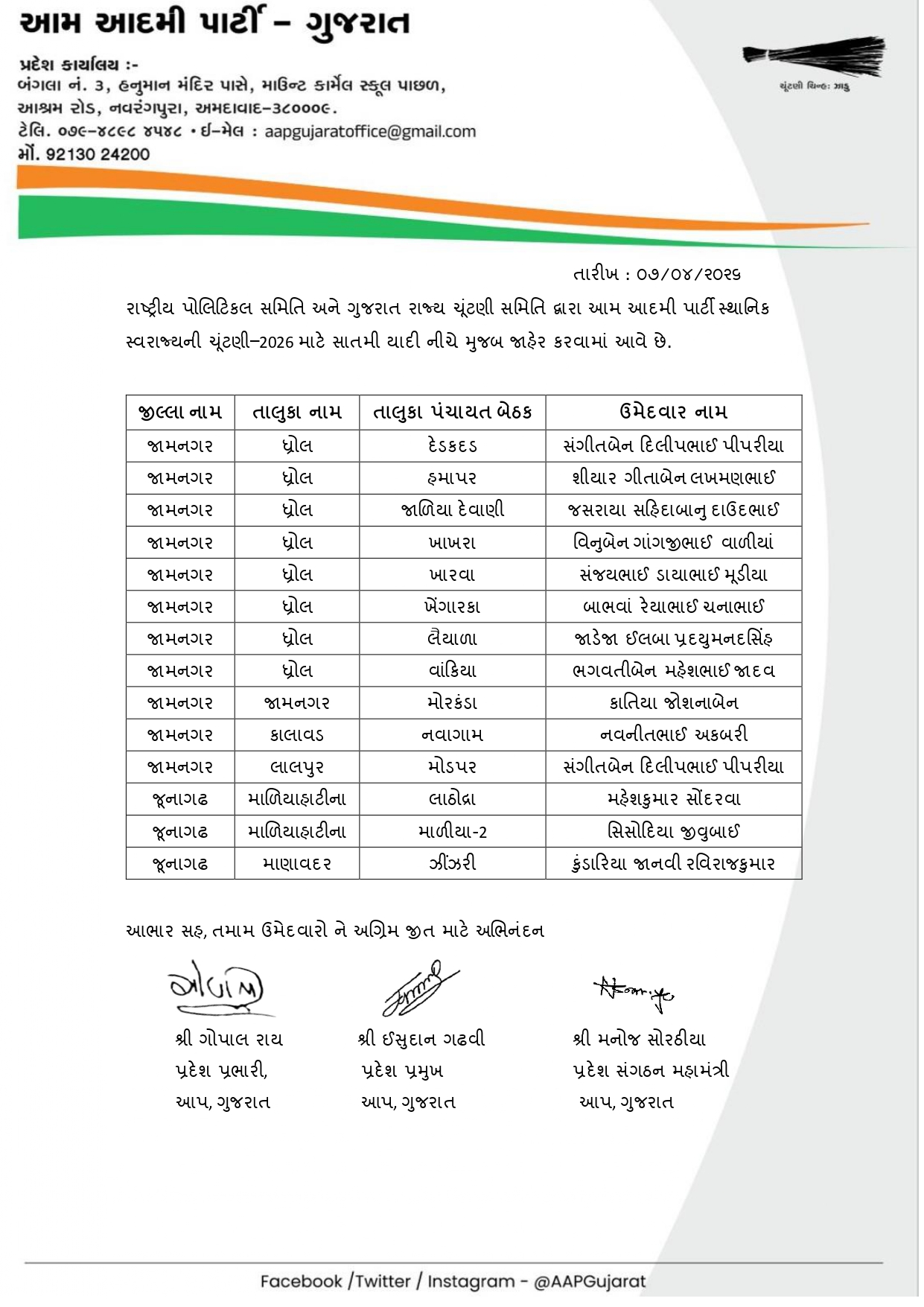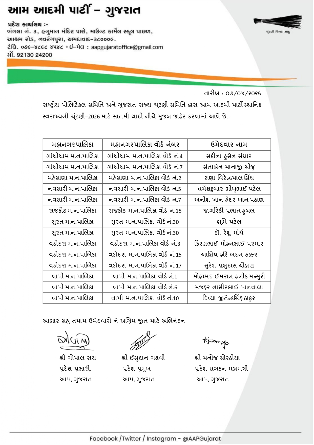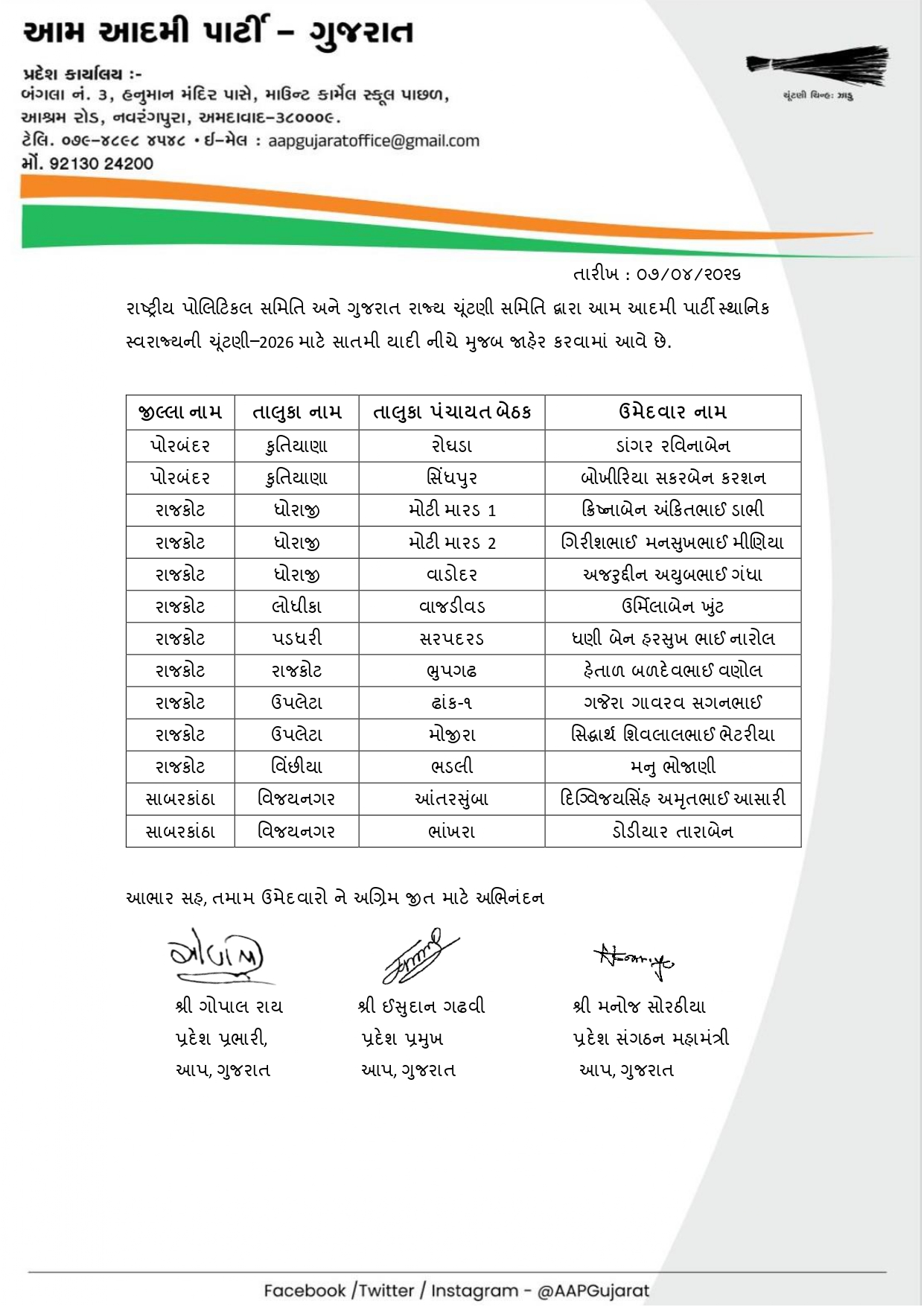 આ દરમિયાન AAP દ્વારા આજે 8 એપ્રિલે ઉમેદવારોની સાતમી યાદી જાહેર કરવામાં આવી છે. અગાઉની યાદીઓ બાદ હવે વધુ બેઠકો માટે ઉમેદવારોના નામ જાહેર થતા ચૂંટણીનો માહોલ વધુ ગરમાયો છે. પાર્ટી દ્વારા વિવિધ નગરપાલિકા અને પંચાયત વિસ્તારોમાં મજબૂત દાવેદારોને મેદાનમાં ઉતારવાનો પ્રયાસ કરવામાં આવી રહ્યો છે.