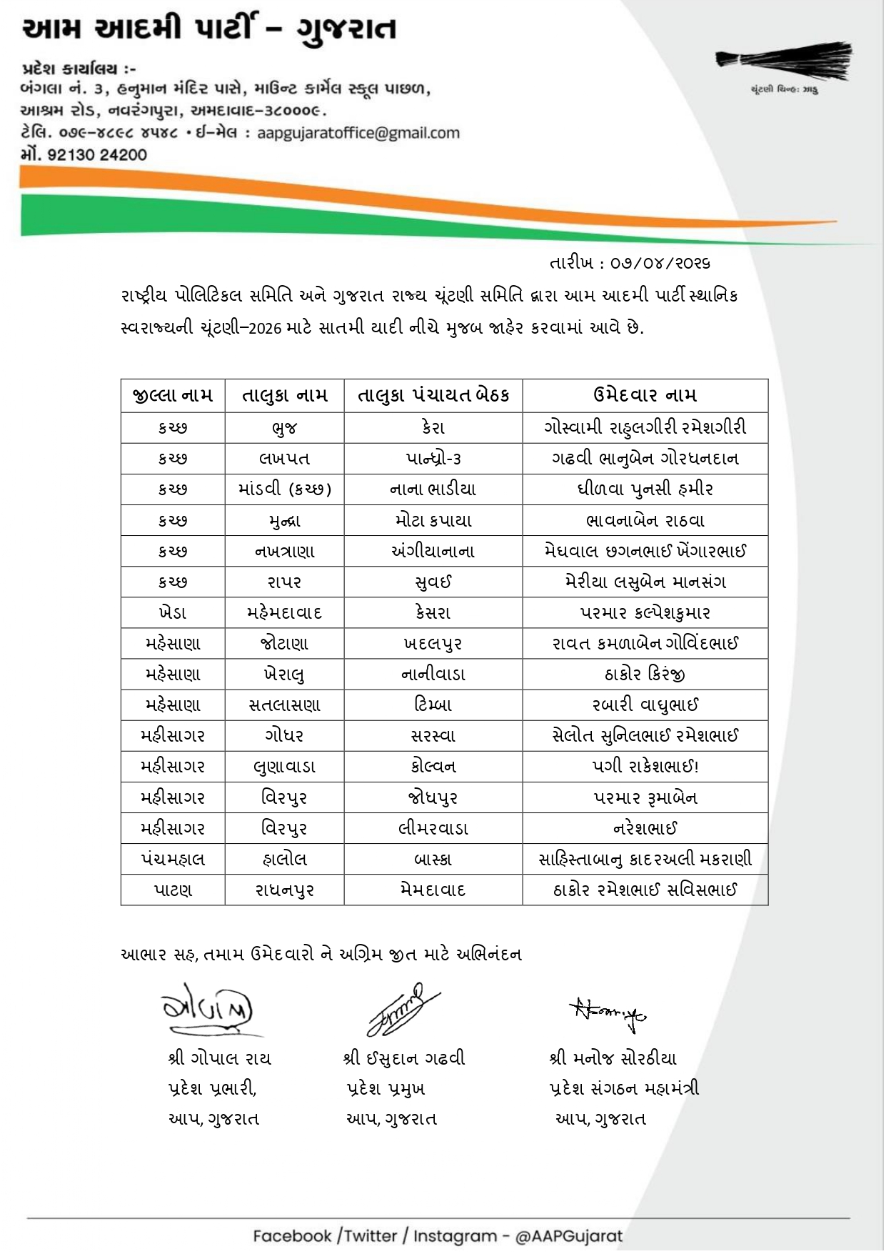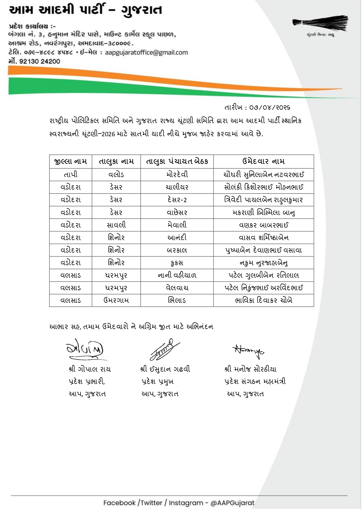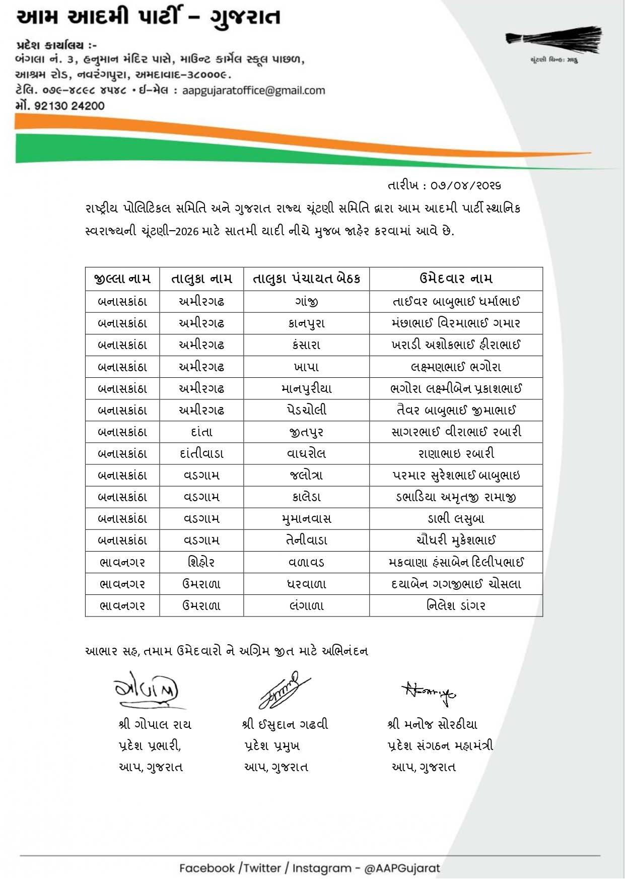 આ દરમિયાન AAP દ્વારા આજે 8 એપ્રિલે ઉમેદવારોની સાતમી યાદી જાહેર કરવામાં આવી છે. અગાઉની યાદીઓ બાદ હવે વધુ બેઠકો માટે ઉમેદવારોના નામ જાહેર થતા ચૂંટણીનો માહોલ વધુ ગરમાયો છે. પાર્ટી દ્વારા વિવિધ નગરપાલિકા અને પંચાયત વિસ્તારોમાં મજબૂત દાવેદારોને મેદાનમાં ઉતારવાનો પ્રયાસ કરવામાં આવી રહ્યો છે.
