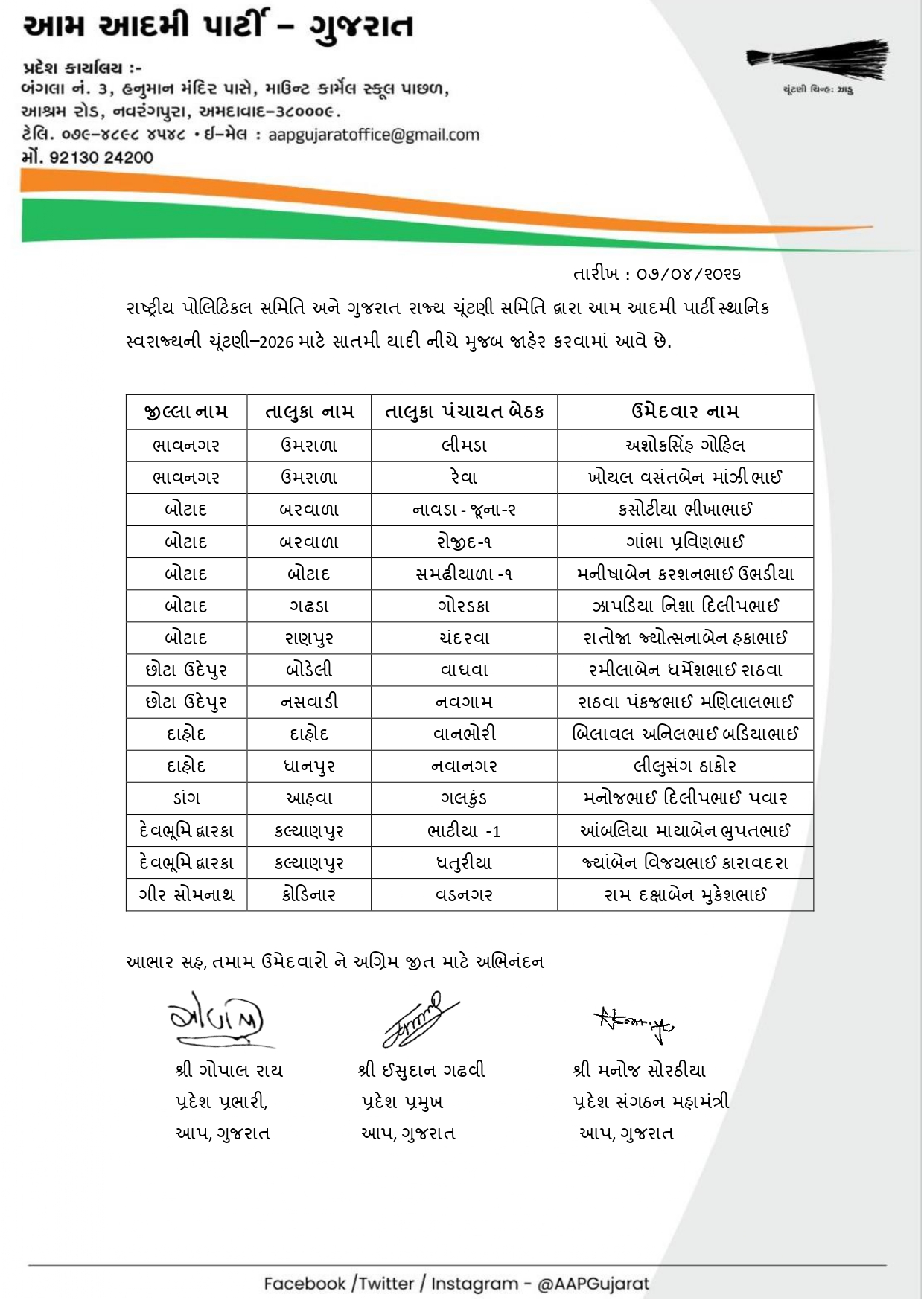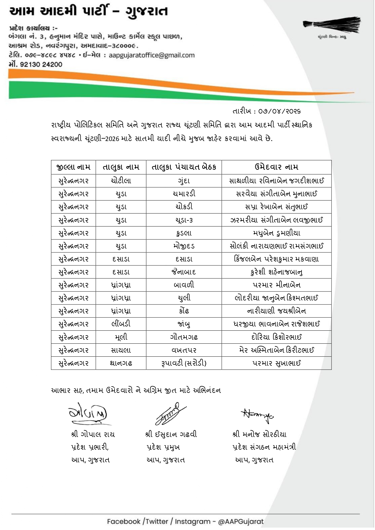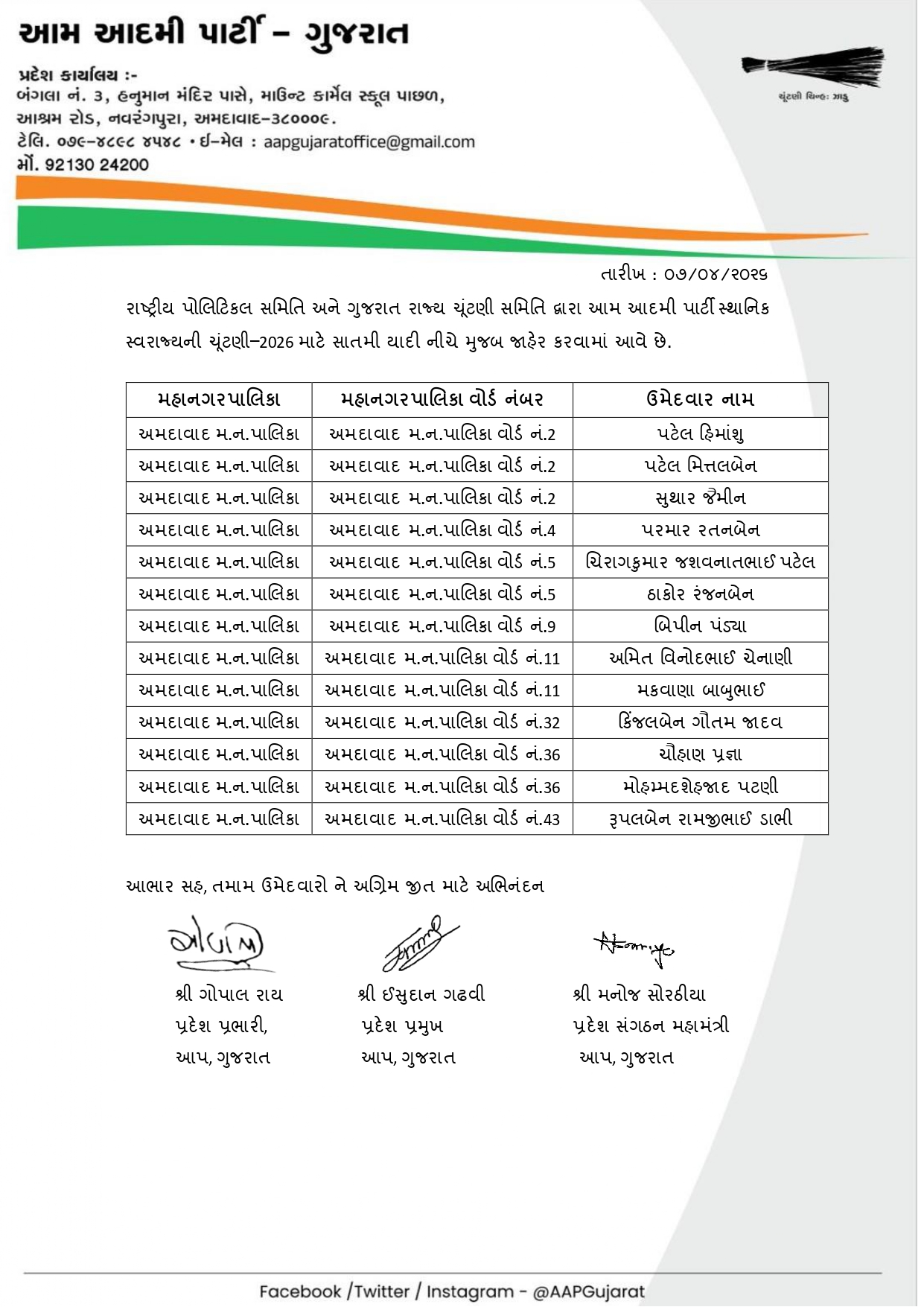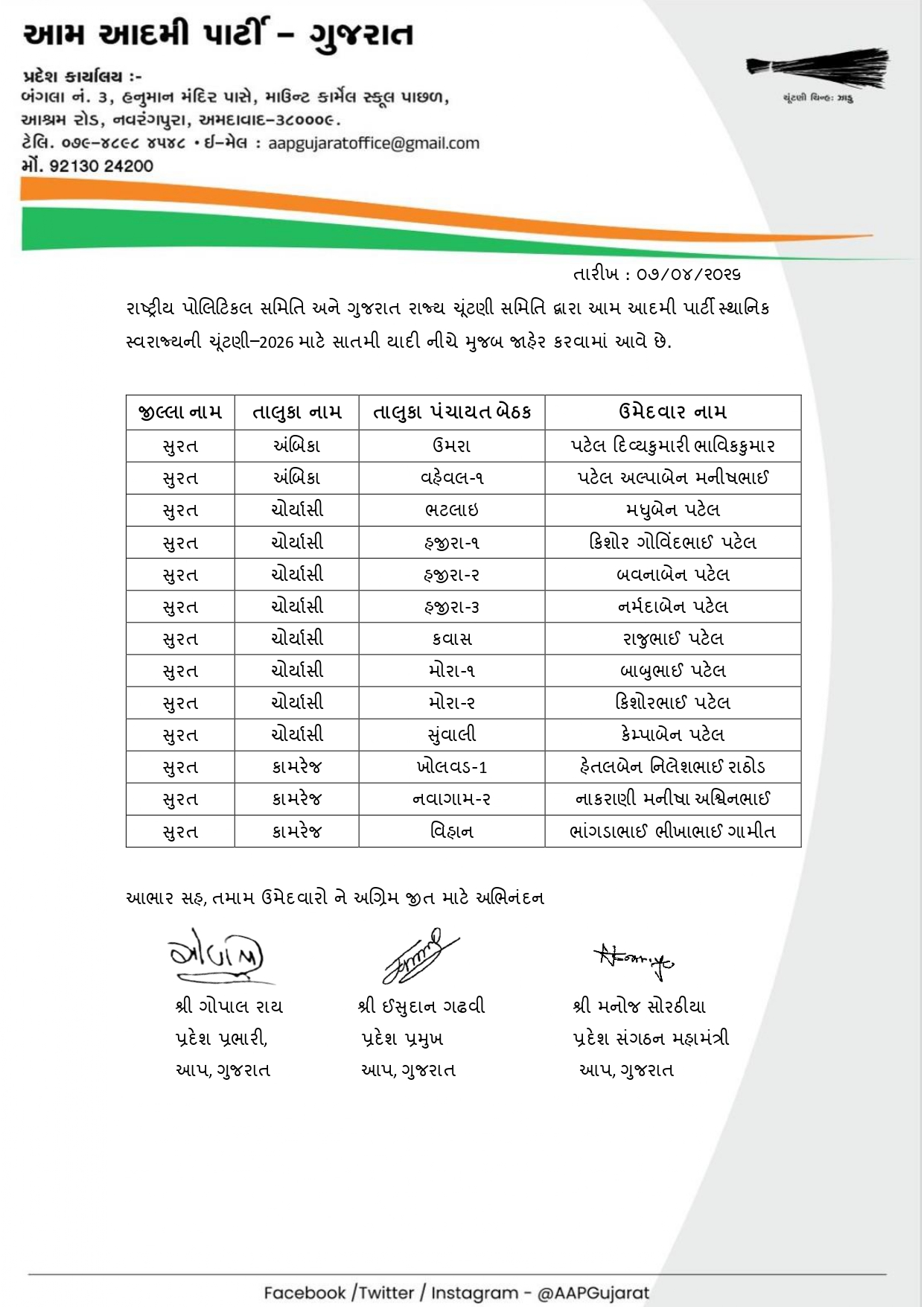 આ દરમિયાન AAP દ્વારા આજે 8 એપ્રિલે ઉમેદવારોની સાતમી યાદી જાહેર કરવામાં આવી છે. અગાઉની યાદીઓ બાદ હવે વધુ બેઠકો માટે ઉમેદવારોના નામ જાહેર થતા ચૂંટણીનો માહોલ વધુ ગરમાયો છે. પાર્ટી દ્વારા વિવિધ નગરપાલિકા અને પંચાયત વિસ્તારોમાં મજબૂત દાવેદારોને મેદાનમાં ઉતારવાનો પ્રયાસ કરવામાં આવી રહ્યો છે.