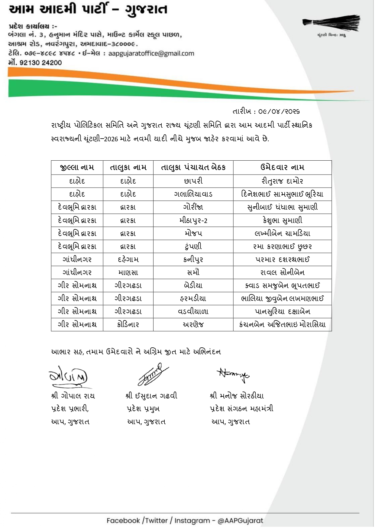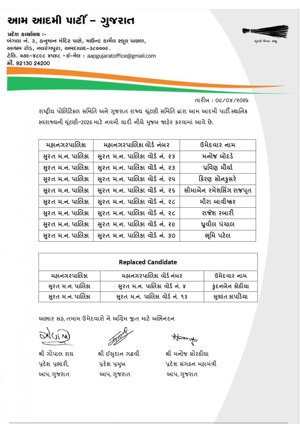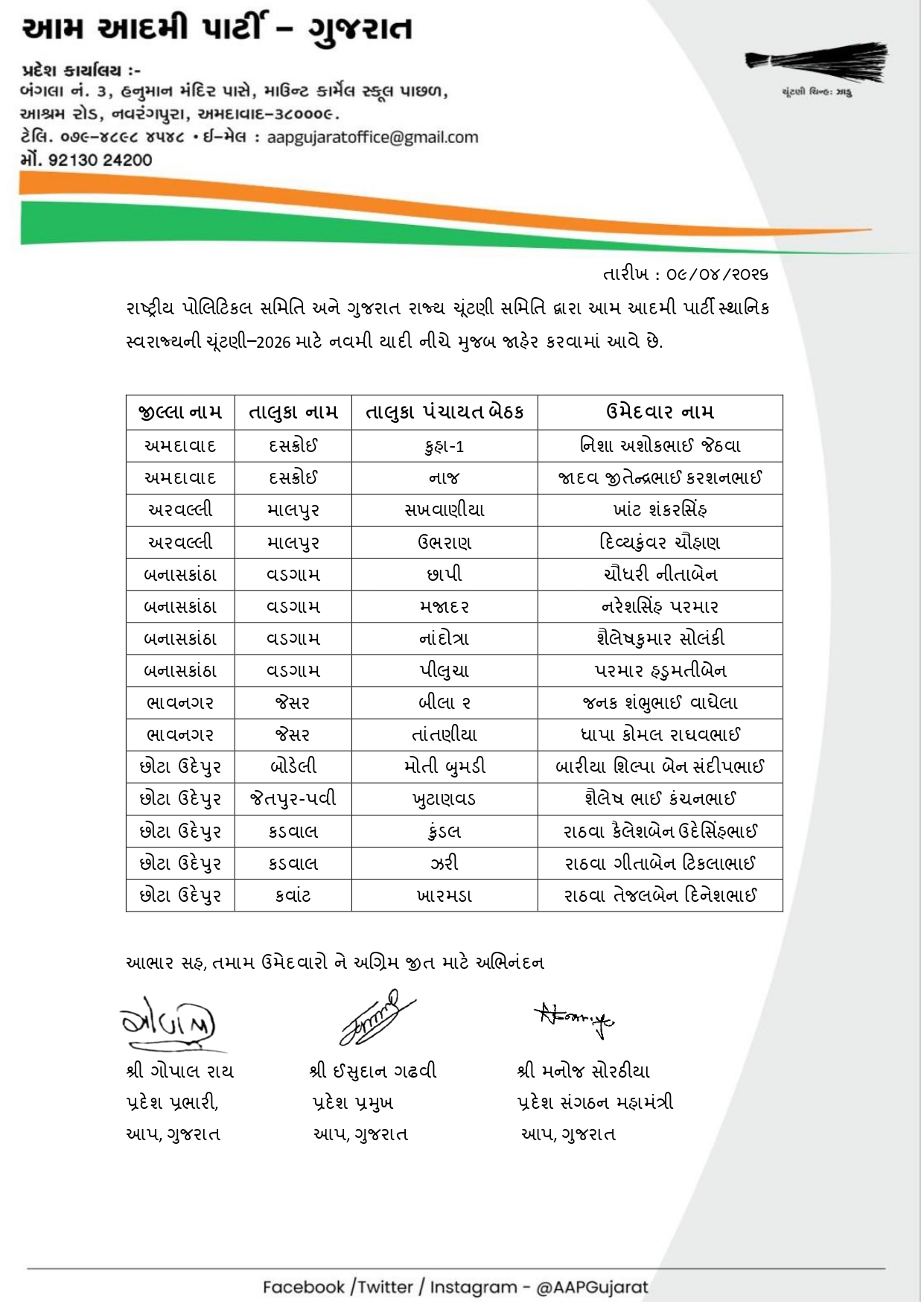 આ દરમિયાન AAP દ્વારા આજે 9 એપ્રિલે ઉમેદવારોની નવમી યાદી જાહેર કરવામાં આવી છે. અગાઉની યાદીઓ બાદ હવે વધુ બેઠકો માટે ઉમેદવારોના નામ જાહેર થતા ચૂંટણીનો માહોલ વધુ ગરમાયો છે. પાર્ટી દ્વારા વિવિધ નગરપાલિકા અને પંચાયત વિસ્તારોમાં મજબૂત દાવેદારોને મેદાનમાં ઉતારવાનો પ્રયાસ કરવામાં આવી રહ્યો છે.