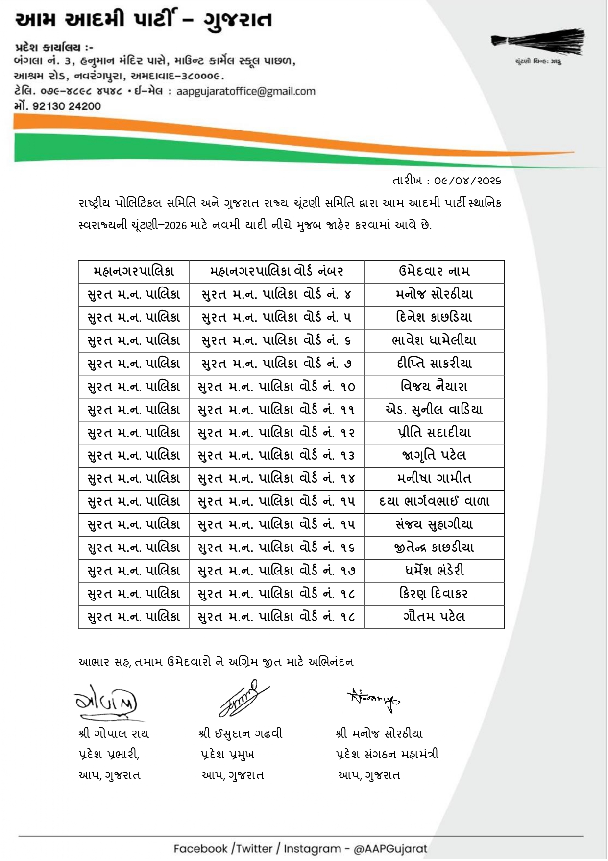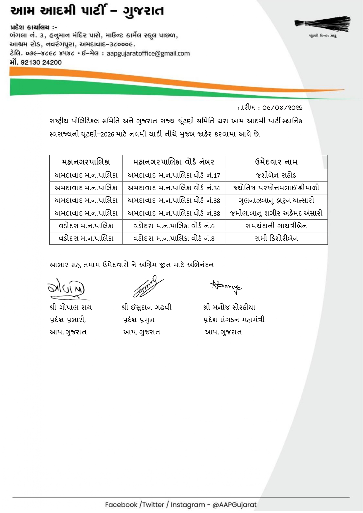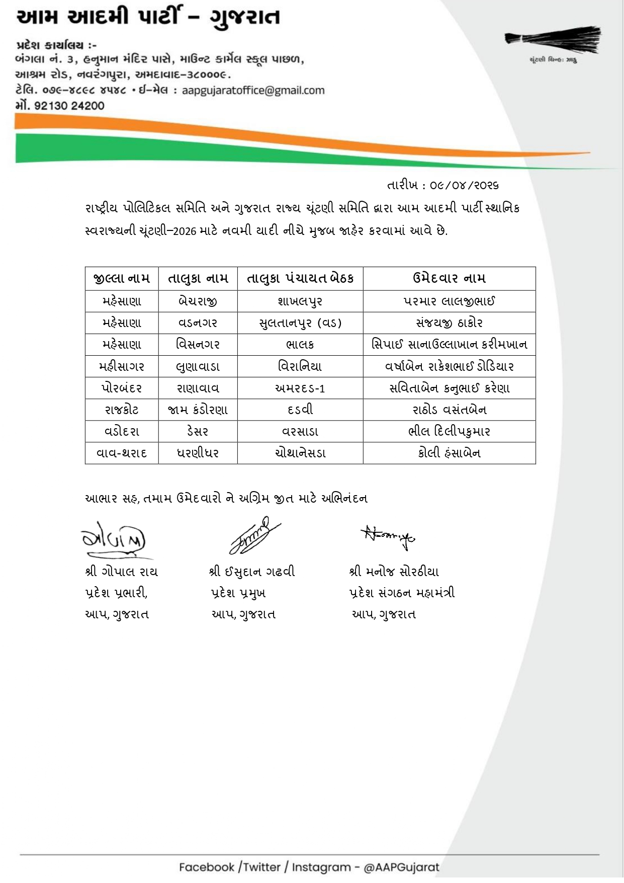 આ દરમિયાન AAP દ્વારા આજે 9 એપ્રિલે ઉમેદવારોની નવમી યાદી જાહેર કરવામાં આવી છે. અગાઉની યાદીઓ બાદ હવે વધુ બેઠકો માટે ઉમેદવારોના નામ જાહેર થતા ચૂંટણીનો માહોલ વધુ ગરમાયો છે. પાર્ટી દ્વારા વિવિધ નગરપાલિકા અને પંચાયત વિસ્તારોમાં મજબૂત દાવેદારોને મેદાનમાં ઉતારવાનો પ્રયાસ કરવામાં આવી રહ્યો છે.