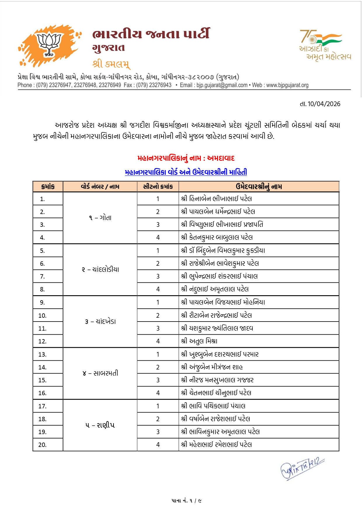ગોતા (વોર્ડ-1): અહીંથી હિનાબેન પટેલ, પાયલબેન પટેલ, વિષ્ણુભાઈ પ્રજાપતિ અને કેતનકુમાર પટેલને મેદાનમાં ઉતારાયા છે.