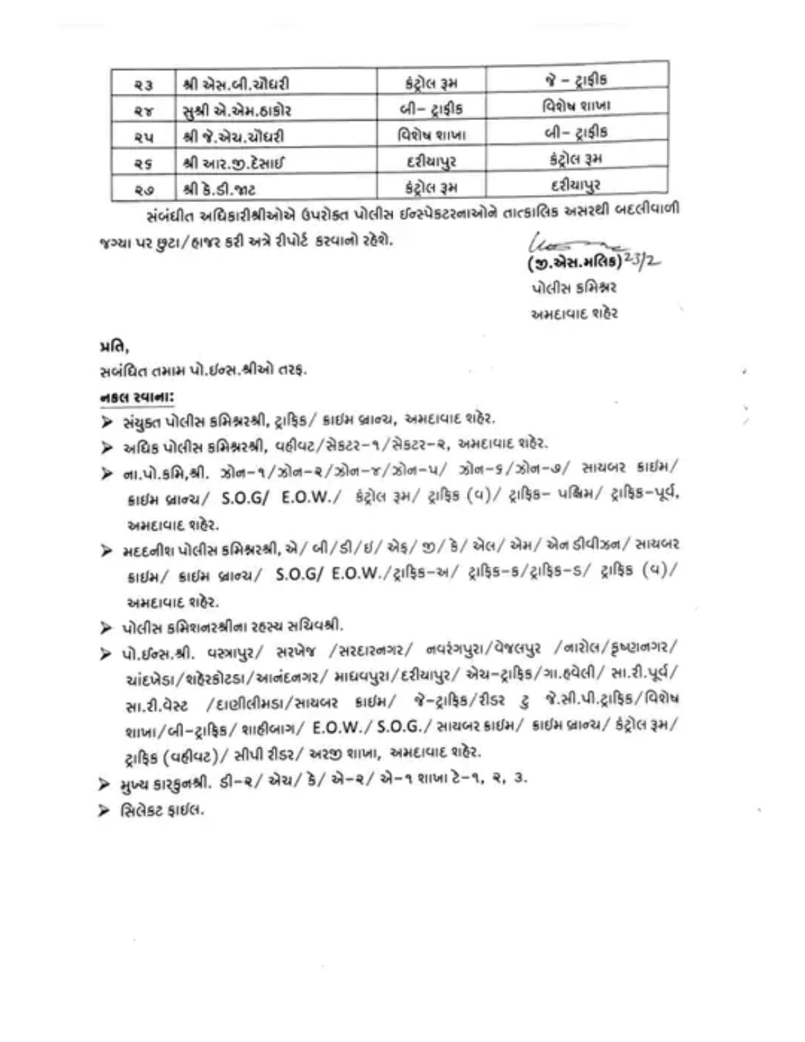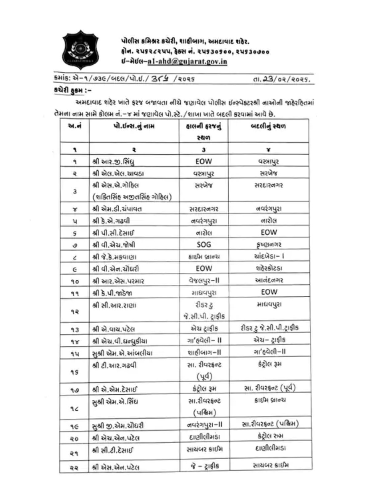 શહેરના કેટલાક મહત્વના પોલીસ સ્ટેશન જેવા કે કૃષ્ણનગર, ચાંદખેડા, શહેરકોટડા, આનંદનગર અને માધવપુરા છેલ્લા ઘણા સમયથી કાયમી અધિકારી વગર ઇન્ચાર્જથી ચાલતા હતા. પોલીસ કમિશનરે હવે આ વિસ્તારોમાં નિયમિત પીઆઈની નિમણૂક કરી દીધી છે. માધવપુરામાં લાંબી માંદગી ભોગવી રહેલા કેપી જાડેજાના સ્થાને સીઆર રાણાને જવાબદારી સોંપવામાં આવી છે. આ ઉપરાંત નારોલ વિસ્તારમાં પણ સતત થતા ગુનાખોરીના બનાવો અને સ્ટેટ એજન્સીઓના વારંવારના દરોડા બાદ ત્યાંના પીઆઈની પણ બદલી કરી દેવાઈ છે.