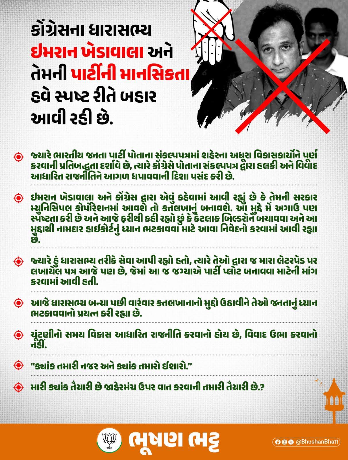 અમદાવાદ મ્યુનિસિપલ કોર્પોરેશન (AMC) ના વર્ષ 2026-27 ના બજેટ દરમિયાન રાજકીય ગરમાવો જોવા મળી રહ્યો છે. ખાસ કરીને જમાલપુર-ખાડિયા વિસ્તારના ધારાસભ્ય ઈમરાન ખેડાવાલા દ્વારા કતલખાનાના મુદ્દે કરવામાં આવેલા નિવેદન બાદ ભાજપના પૂર્વ ધારાસભ્ય ભૂષણ ભટ્ટે મોરચો સંભાળ્યો છે. ભૂષણ ભટ્ટે પોસ્ટર દ્વારા આક્ષેપ કર્યો છે કે કોંગ્રેસ શહેરના વિકાસના બદલે વિવાદની રાજનીતિ કરી રહી છે.