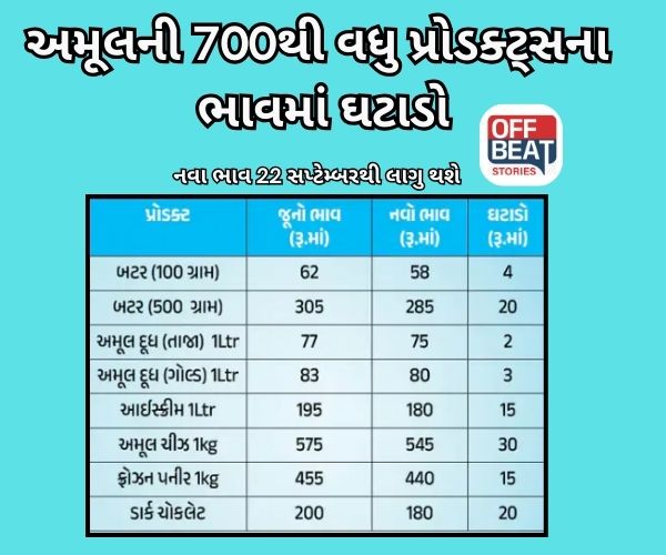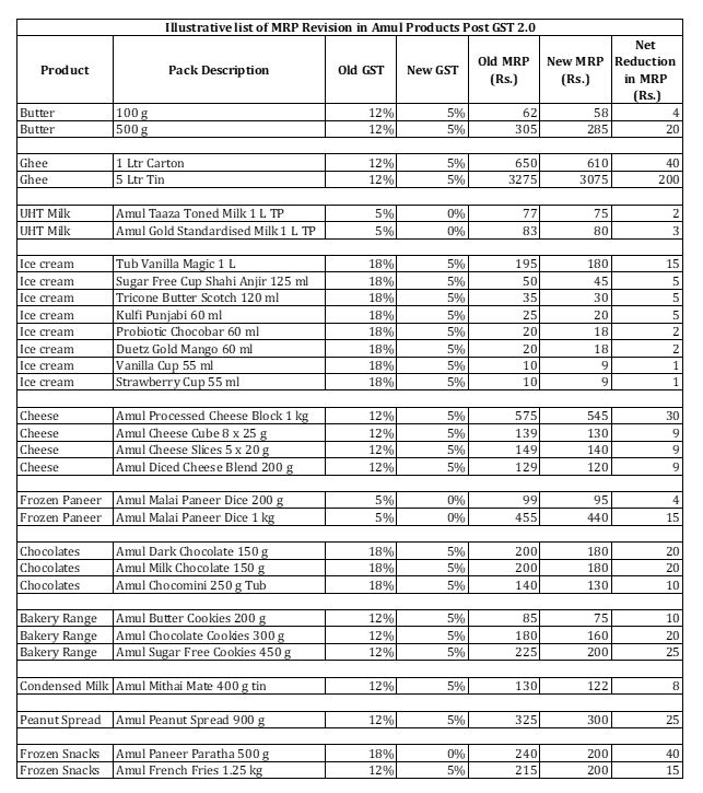 ભારતની સૌથી મોટી ફૂડ બ્રાન્ડ અમુલે આજે 700થી વધુ ઉત્પાદનોની કિંમતમાં ઘટાડો જાહેર કર્યો છે. જે ઘટાડામાં માખણ, ઘી, દૂધ, આઈસ્ક્રીમ, ચીઝ, પનીર, ચોકલેટ, બેકરી શ્રેણી, ફ્રોઝન ડેરી અને બટાકાના નાસ્તા, પીનટ સ્પ્રેડ વગેરેનો સમાવેશ થાય છે. અમુલે એક નિવેદનમાં જણાવ્યું કે, ''36 લાખ ખેડૂતોની માલિકીની સહકારી સંસ્થા તરીકે, અમુલ માને છે કે કિંમતોમાં ઘટાડો ડેરી ઉત્પાદનો, ખાસ કરીને આઈસ્ક્રીમ, ચીઝ અને માખણની વિશાળ શ્રેણીના વપરાશને વેગ આપશે કારણ કે ભારતમાં માથાદીઠ વપરાશ ખૂબ ઓછો છે, જેનાથી વૃદ્ધિની મોટી તક ઊભી થશે. GSTમાં ઘટાડો ઉત્પાદકને ગ્રાહકોના આવકમાં અમૂલનો હિસ્સો મોટા પાયે વધારવામાં મદદ કરશે''
