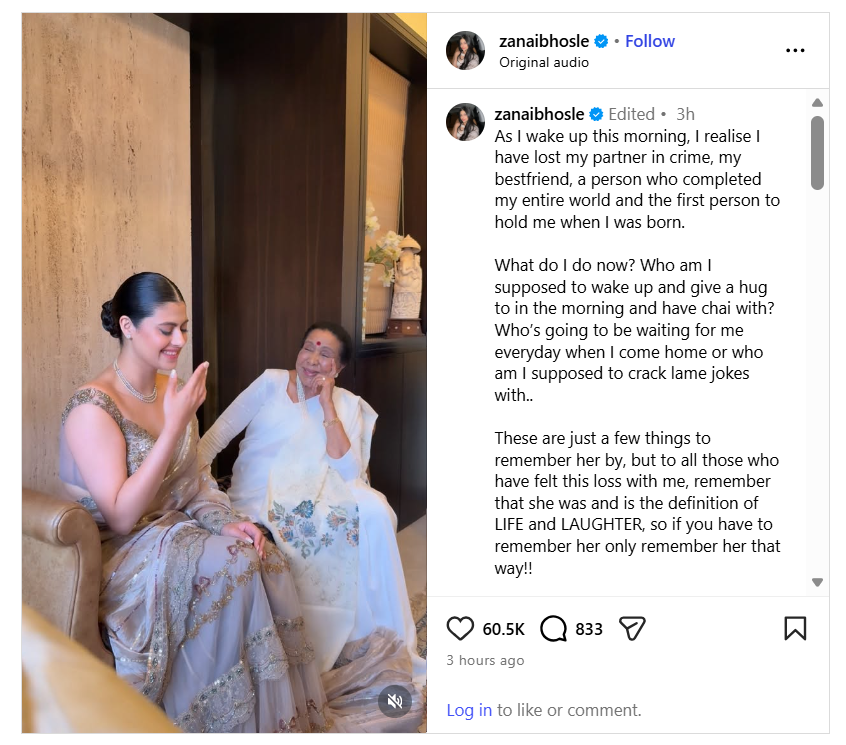 Zanai Bhosle એ ઇન્સ્ટાગ્રામ પર Asha Bhosle સાથેના બાળપણના અને તાજેતરના કેટલાક ફોટા શેર કર્યા છે. આ તસવીરોમાં દાદી અને પૌત્રી વચ્ચેનો અતૂટ પ્રેમ સ્પષ્ટપણે જોઈ શકાય છે. ઝનાઈએ લખ્યું કે, "તમારા વિના જીવન હવે પહેલા જેવું નહીં રહે. તમે માત્ર મારા દાદી જ નહીં, પણ મારા ગુરુ અને પ્રેરણા પણ હતા."