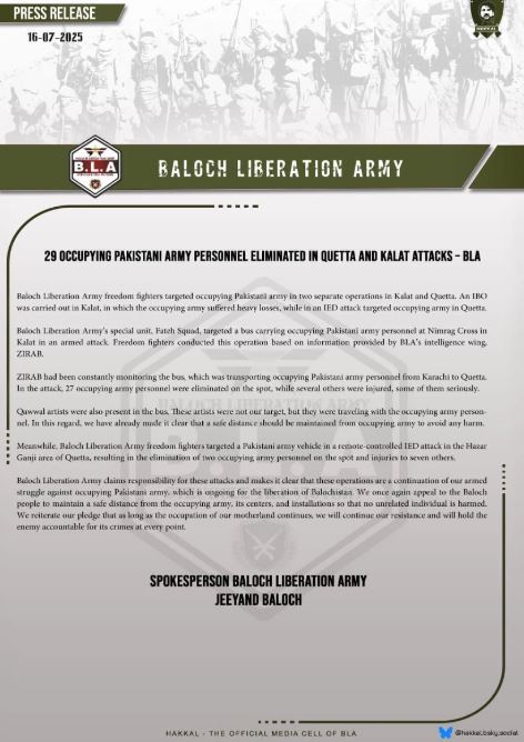 બલૂચ લિબરેશન આર્મી (BLA)નો દાવો છે કે તેમણે કલાત અને ક્વેટામાં બે અલગ અલગ કાર્યવાહીમાં 29 પાકિસ્તાની સુરક્ષા દળોને મારી નાખ્યા છે. BLAએ એમ પણ કહ્યું છે કે તે પાકિસ્તાની સેના સામે આ યુદ્ધ ચાલુ રાખશે. બલૂચ લિબરેશન આર્મીએ એક નિવેદન જારી કરીને કહ્યું કે ક્વેટામાં BLAના સ્પેશિયલ યુનિટ ફતાહ સ્ક્વોડ દ્વારા પાકિસ્તાની લશ્કરી કર્મચારીઓને લઈ જતી બસને નિશાન બનાવીને IED હુમલો કરવામાં આવ્યો. બલૂચ લિબરેશન આર્મીએ તેના ગુપ્તચર યુનિટ ZIRAB તરફથી ગુપ્ત માહિતી મળ્યા બાદ આ હુમલો કર્યો હતો .