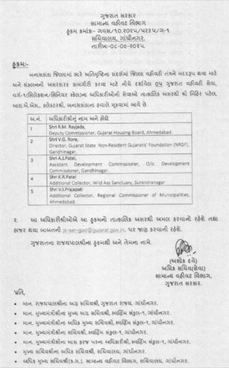 સાથો સાથ બનાસકાંઠા જિલ્લામાં ભારે અતિવૃષ્ટિની પરિસ્થિતિમાં પાંચ અધિકારીઓને મુકાયા છે. રાજ્ય સરકારે પાંચ GAS કેડરના અધિકારીઓને તાત્કાલિક અસરથી મુકવામાં આવ્યા છે.