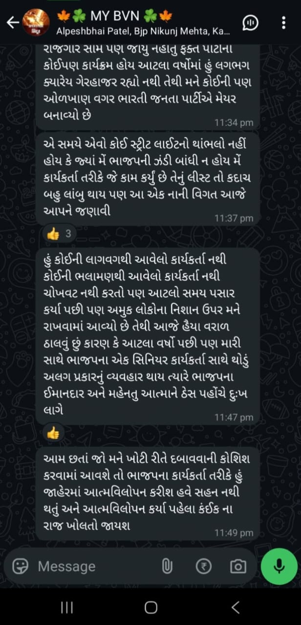 તેમણે વોટ્સએપમાં લખ્યું છે કે, ''એ સમયે એવો કોઈ સ્ટ્રીટ લાઈટનો થાંભલો નહીં હોય કે જ્યાં મેં ભાજપની ઝંડી બાંધી ન હોય, મેં કાર્યકર્તા તરીકે જે કામ કર્યું છે તેનું લીસ્ટ તો કદાચ બહુ લાંબુ થાય પણ આ એક નાની વિગત આજે આપને જણાવી'' ,મેયરે ત્રીજા મેસેજમાં લખ્યું કે, ''હું કોઈની લાગવગથી આવેલો કાર્યકર્તા નથી, કોઈની ભલામણથી આવેલો કાર્યકર્તા નથી. ચોખવટ નથી કરતો પણ આટલો સમય પસાર કર્યા પછી પણ અમુક લોકોના નિશાન ઉપર મને રાખવામાં આવ્યો છે તેથી આજે હૈયા વરાળ ઠાલવું છું કારણ કે આટલા વર્ષો પછી પણ મારી સાથે ભાજપના એક સિનિયર કાર્યકર્તા સાથે થોડું અલગ પ્રકારનું વ્યવહાર થાય ત્યારે ભાજપના ઈમાનદાર અને મહેનતુ આત્માને ઠેસ પહોંચે દુ:ખ લાગે''