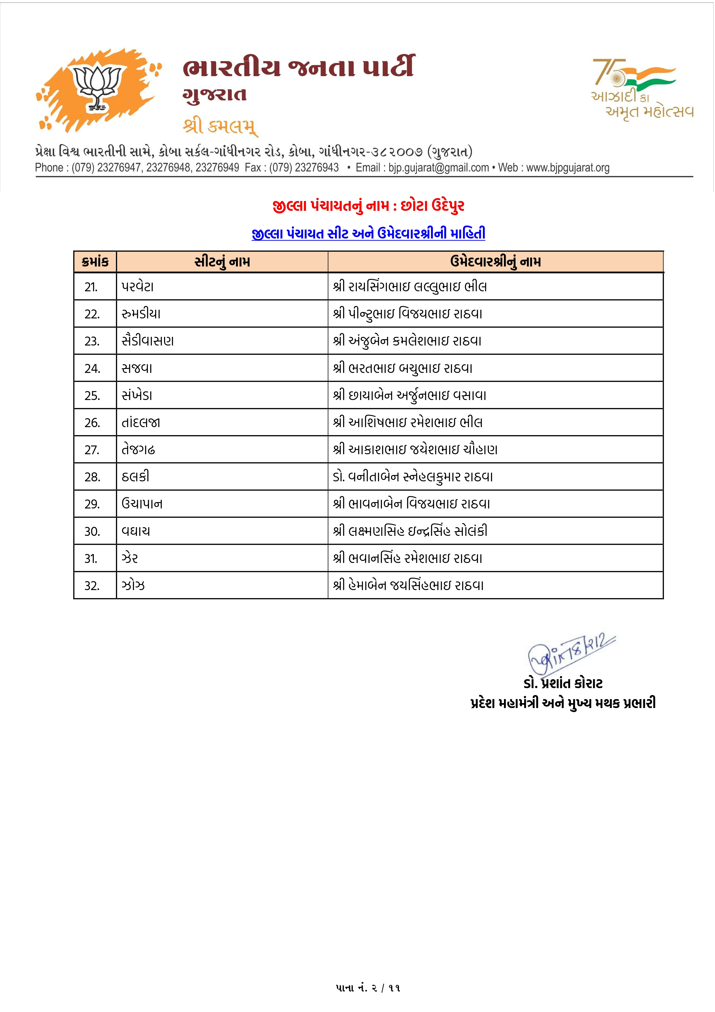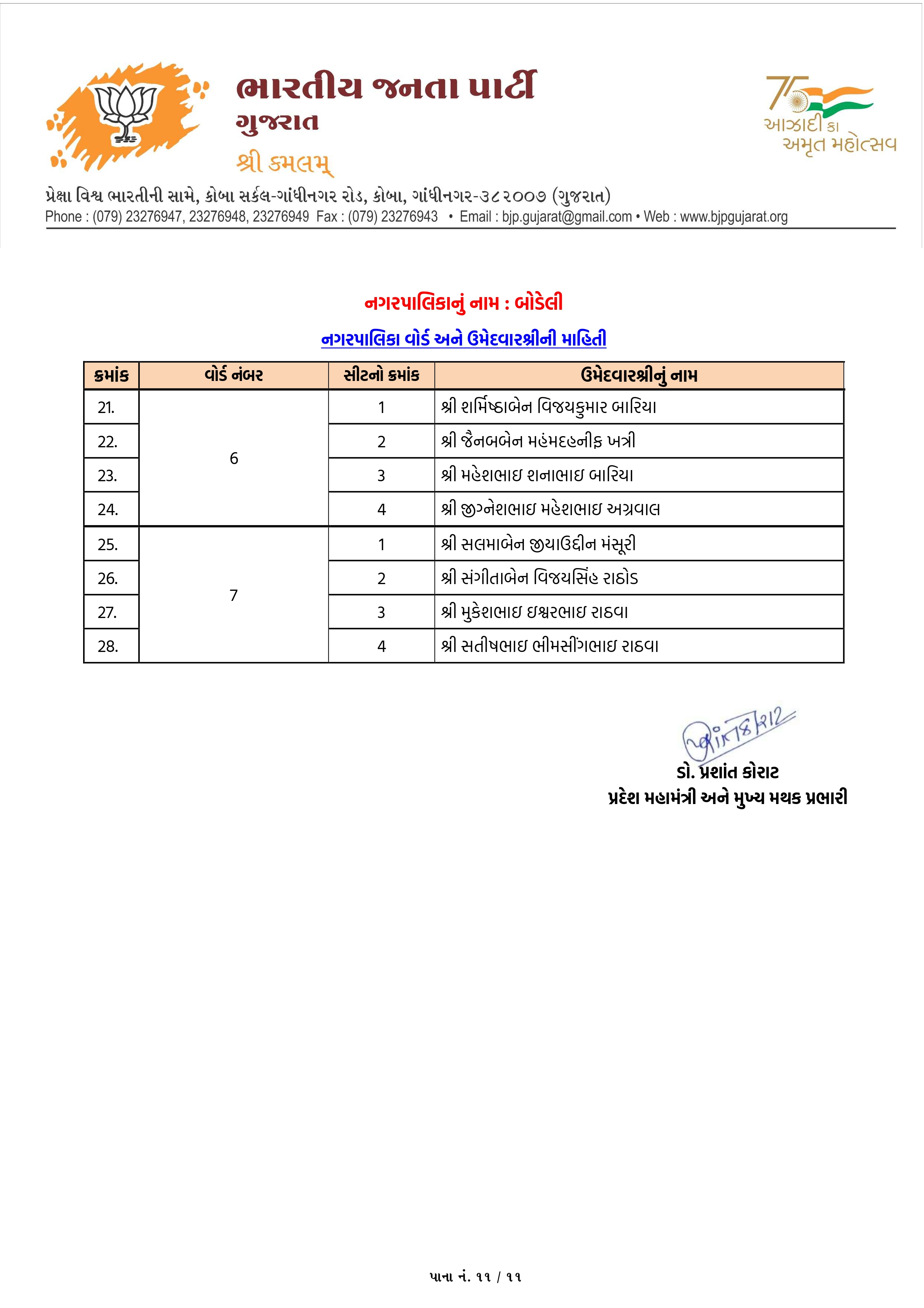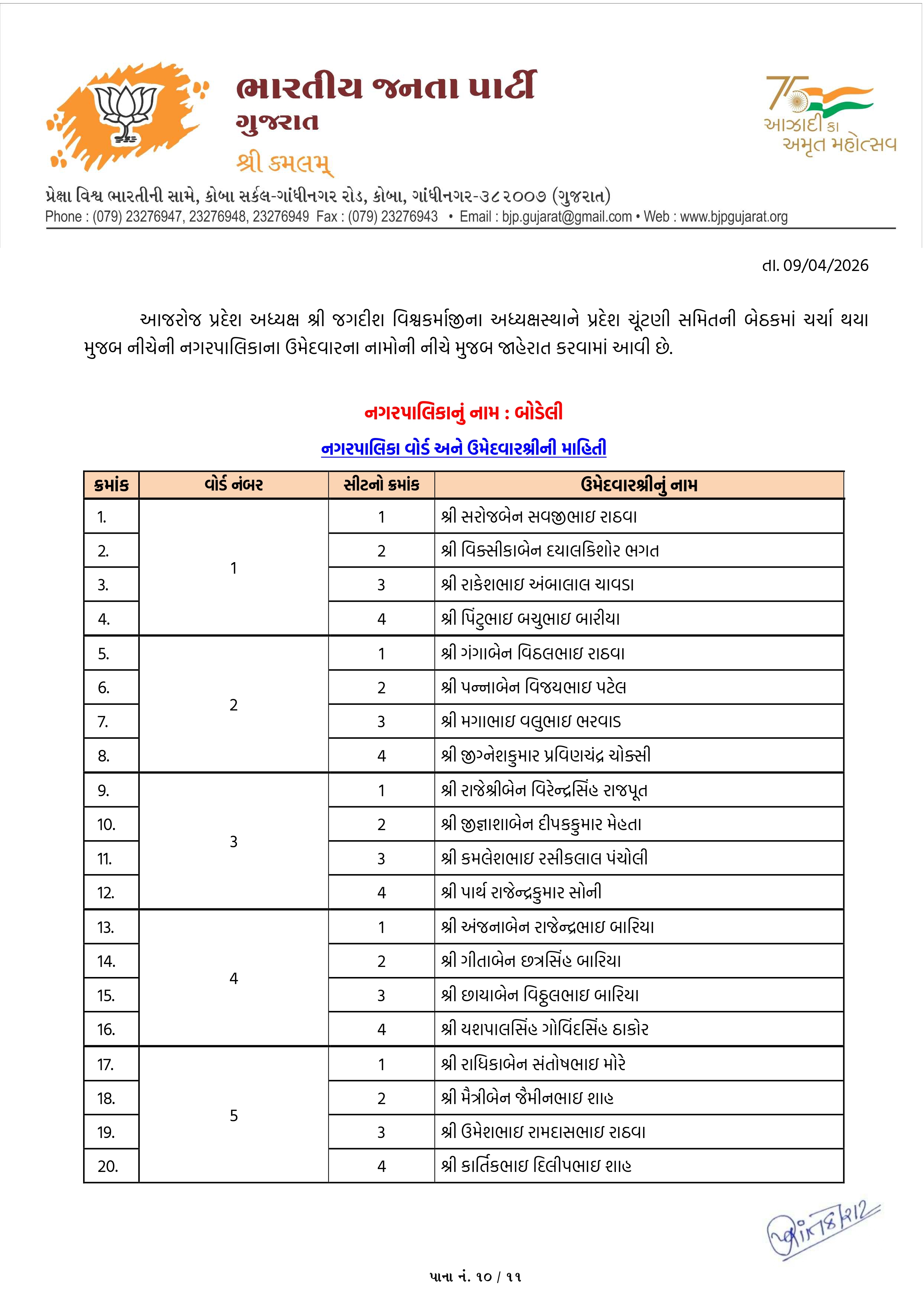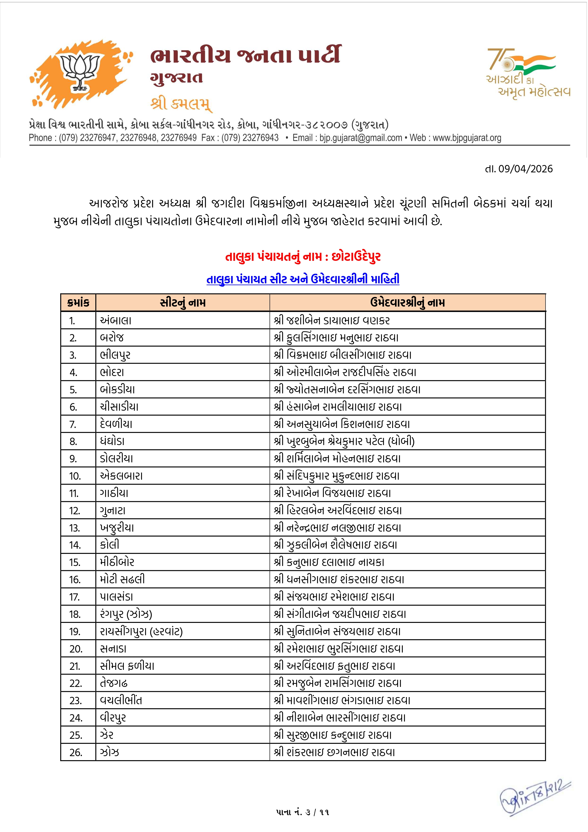 ગુજરાતમાં સ્થાનિક સ્વરાજ્યની ચૂંટણીને લઈને ભાજપે પોતાની રાજકીય ગતિ વધુ તેજ કરી છે. અમદાવાદ, ખેડા-નડિયાદમાં ઉમેદવારો જાહેર કર્યા બાદ હવે મોડી રાત્રે ભાજપે છોટા ઉદેપુર વિસ્તાર માટે પણ ઉમેદવારોની યાદી જાહેર કરી દીધી છે. આ સાથે ચૂંટણીને લઈને રાજકીય હલચલ વધુ તેજ બની છે.