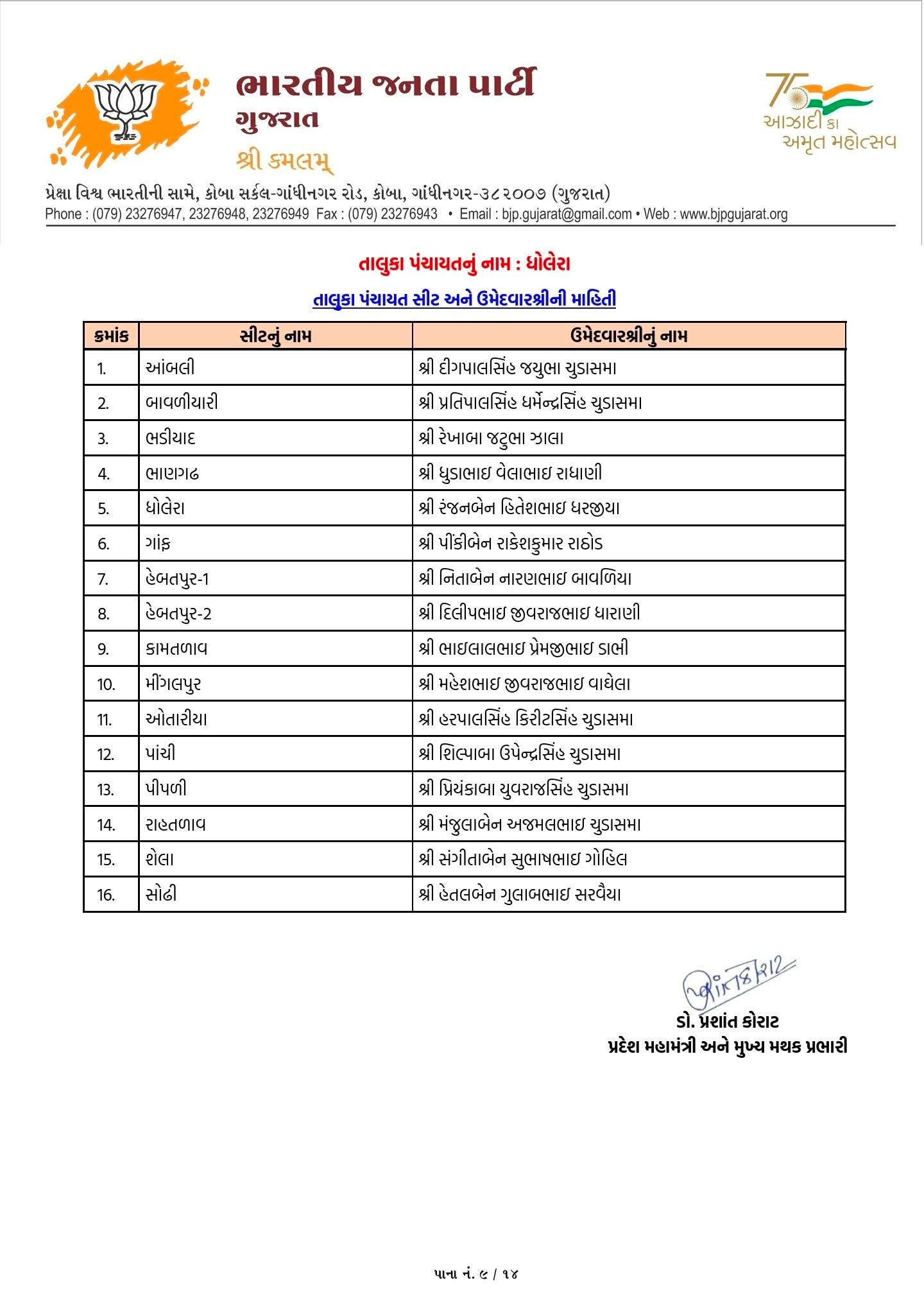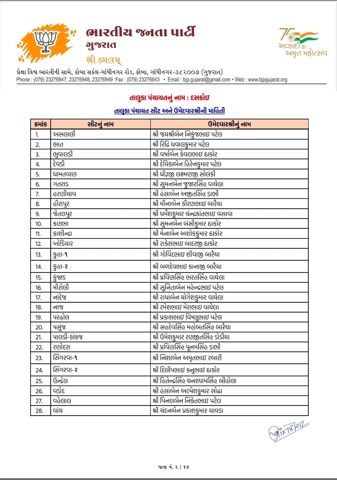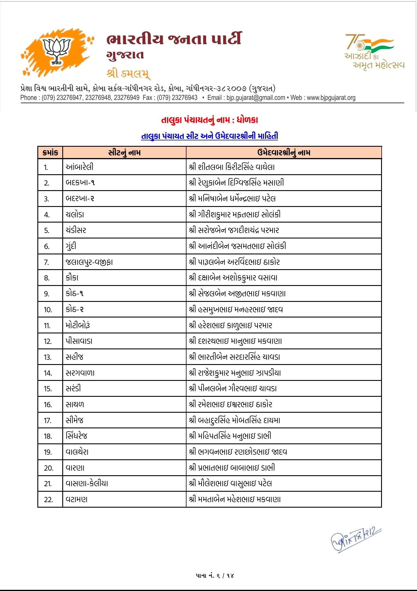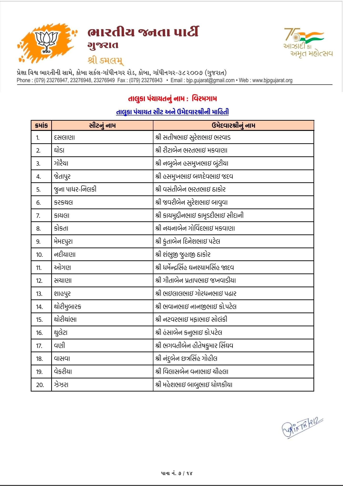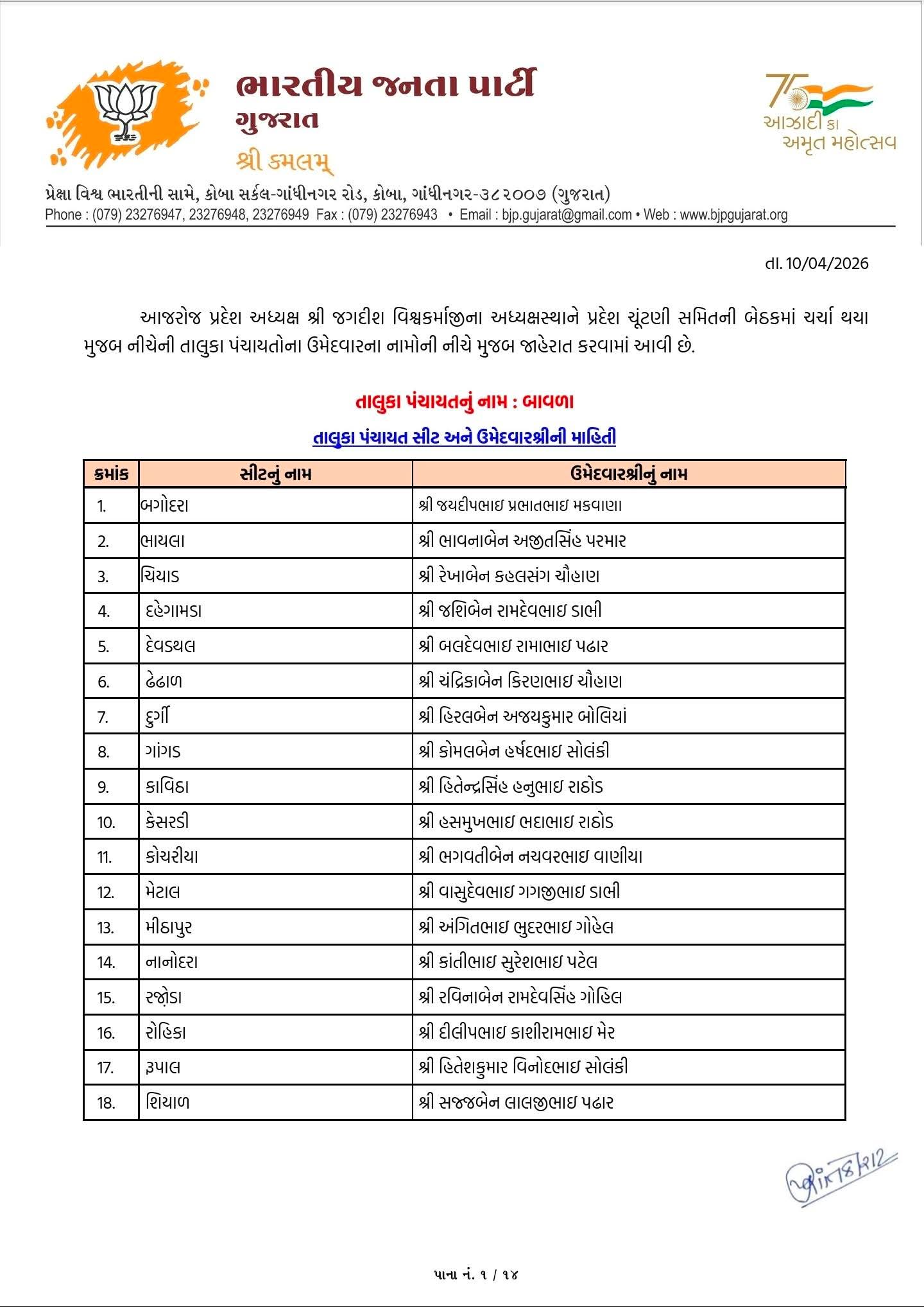 10 એપ્રિલ 2026ના રોજ ભાજપે અમદાવાદ જિલ્લાના વિવિધ સ્થાનિક સ્વરાજ્ય સંસ્થાઓ માટે ઉમેદવારોના નામ જાહેર કર્યા છે. આ યાદી મુજબ વિરમગામ અને ધોળકા નગરપાલિકા માટે કુલ 72 ઉમેદવારો જાહેર કરવામાં આવ્યા છે. જુઓ લિસ્ટ...