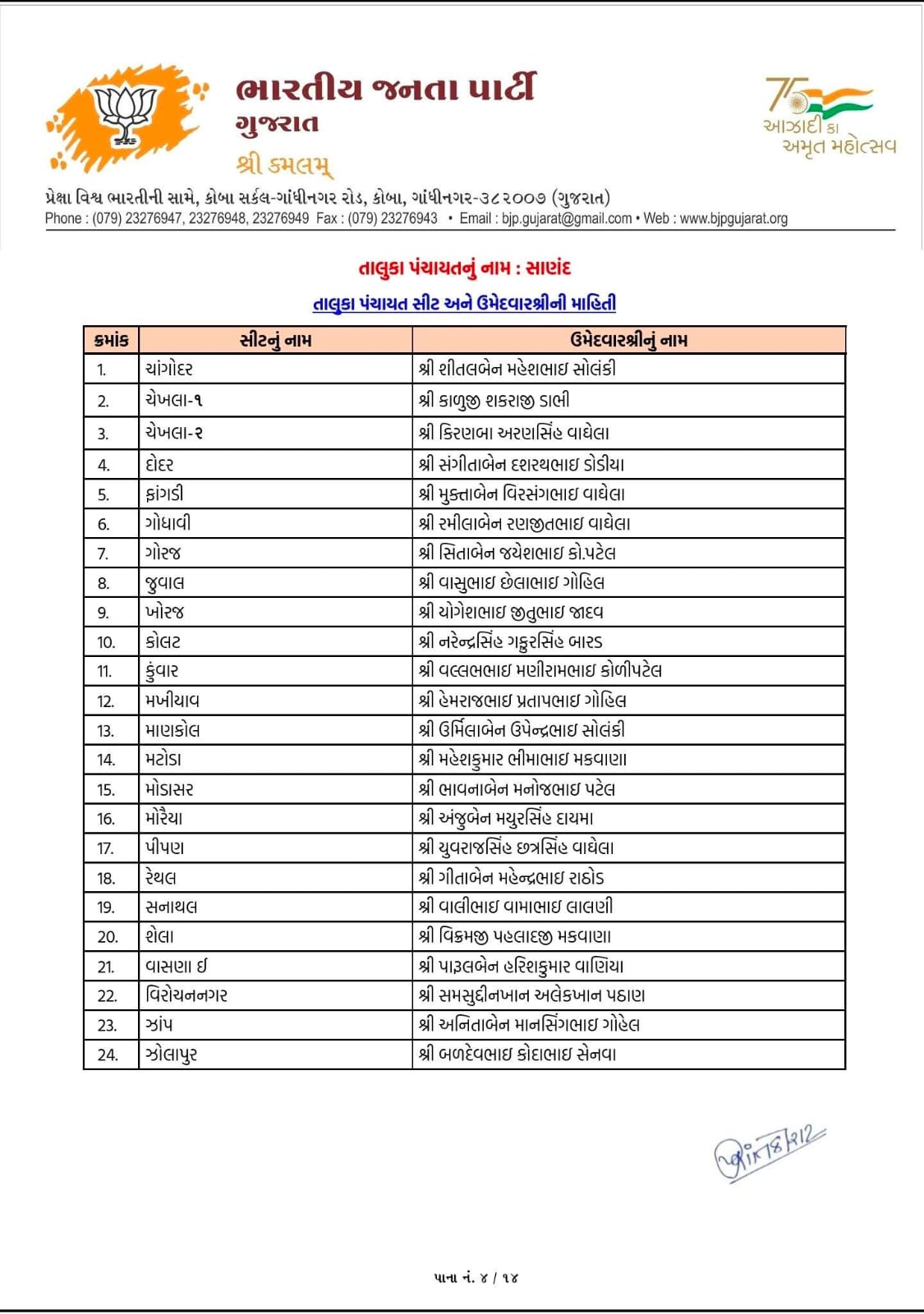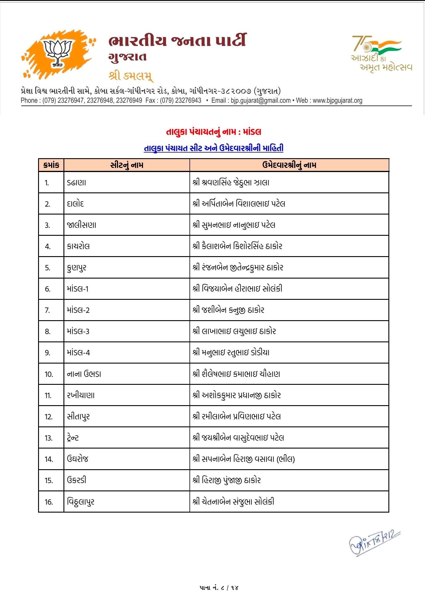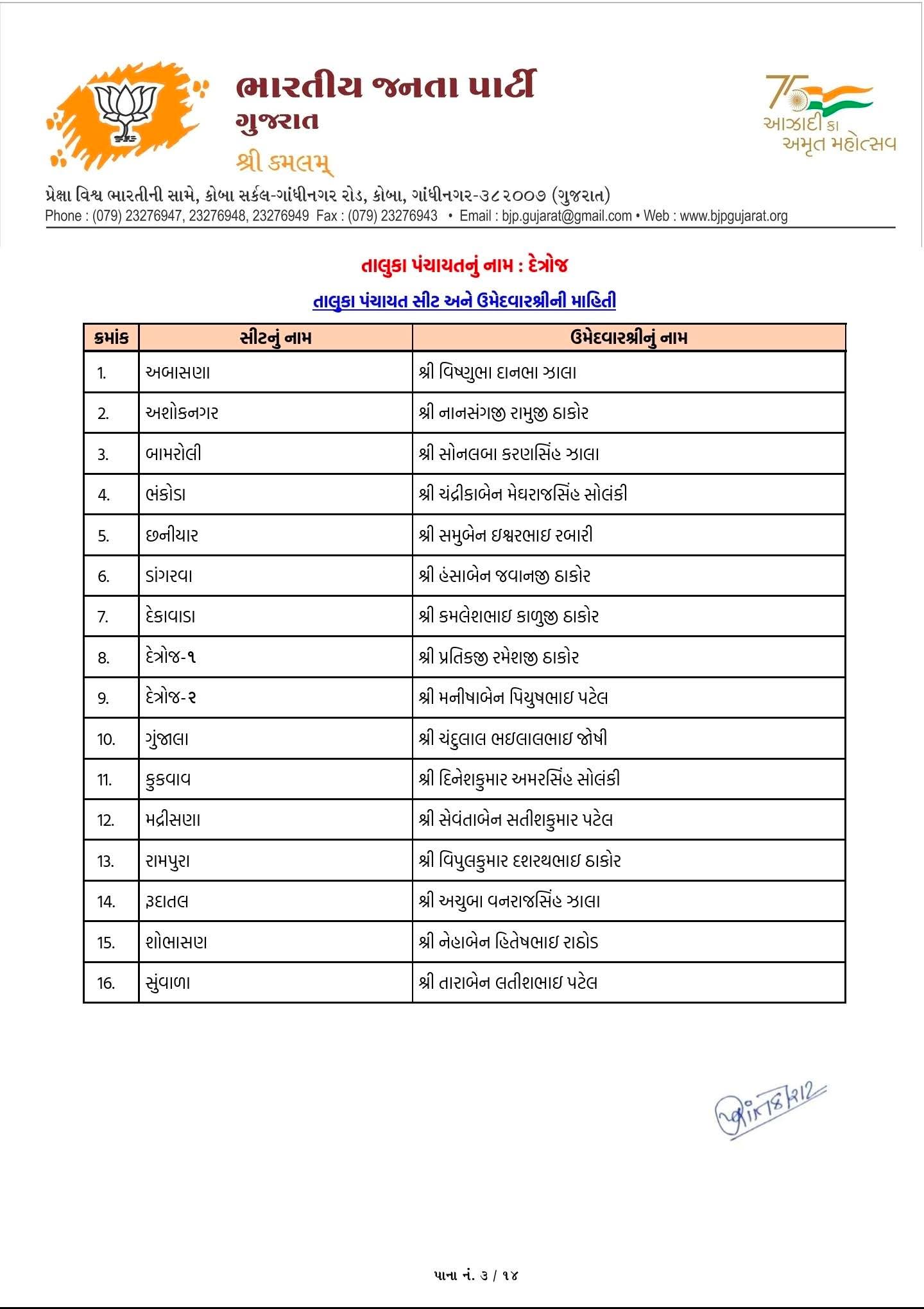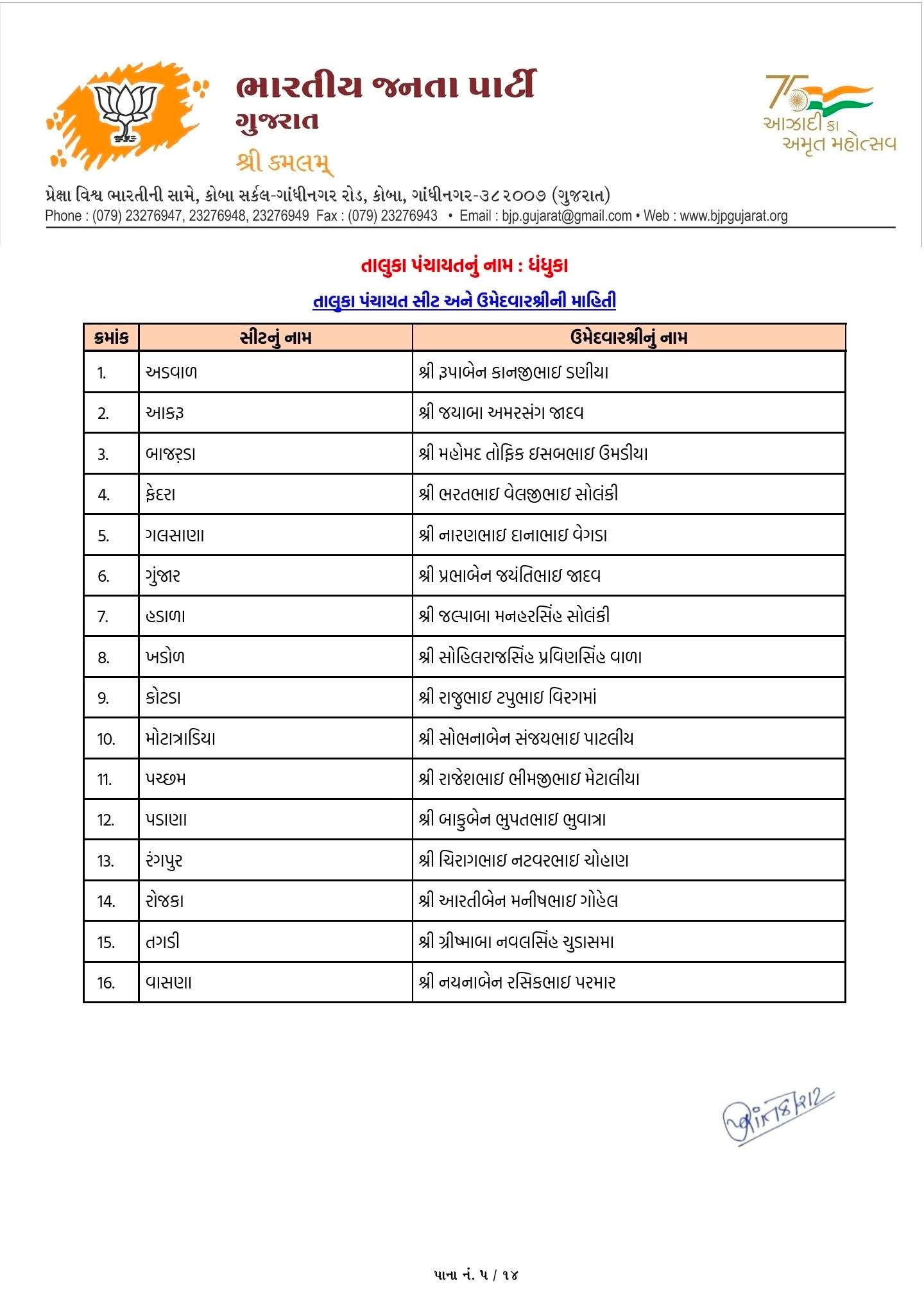 આ યાદીમાં વિરમગામ, ધોલેરા, બાવળા, માંડલ, ધંધુકા, ધોળકા, દસક્રોઈ, દેત્રોજ અને સાણંદ તાલુકા પંચાયતો માટે ઉમેદવારોની જાહેરાત કરવામાં આવી છે. આથી સ્પષ્ટ થાય છે કે ભાજપે જિલ્લા સ્તરે સંપૂર્ણ તૈયારી સાથે ચૂંટણીમાં ઉતરવાનો નિર્ણય લીધો છે.