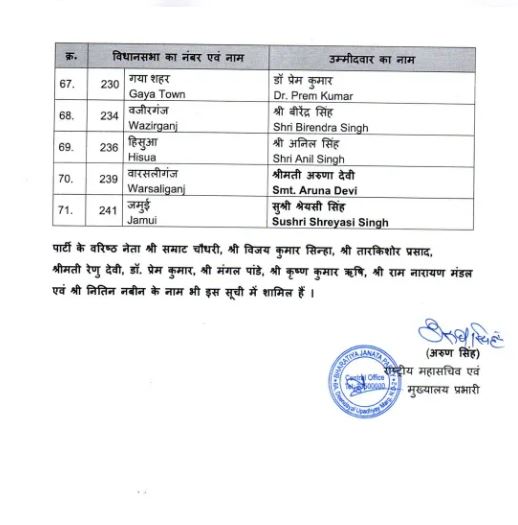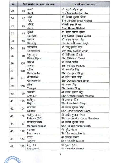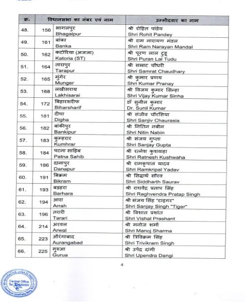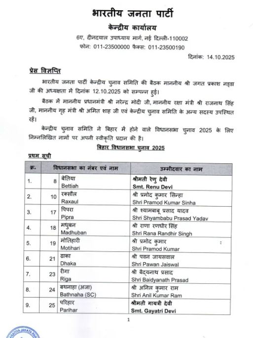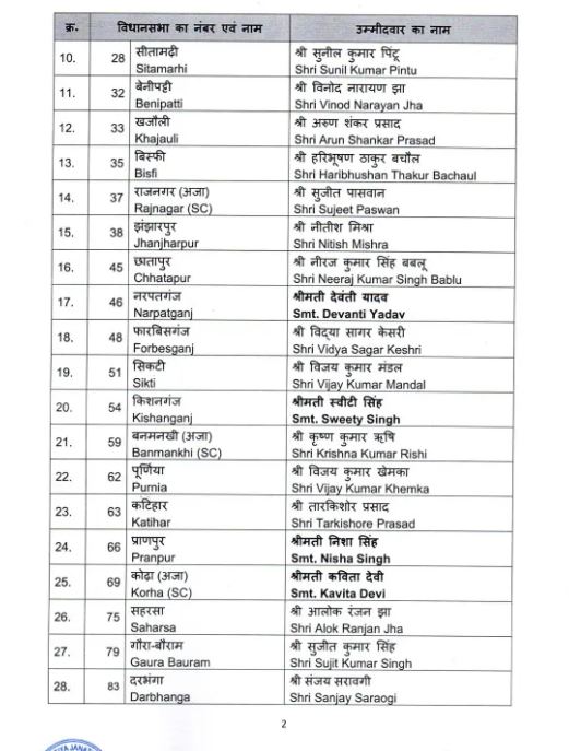 પટણામાં આયોજિત એક પત્રકાર પરિષદમાં પાર્ટીના વરિષ્ઠ નેતાઓએ ઉમેદવારોના નામની ઔપચારિક જાહેરાત કરી છે. ભાજપ આ વખતે જનતા દળ (યુનાઇટેડ) અને અન્ય સાથી પક્ષો સાથે જોડાણ કરીને ચૂંટણી લડશે. NDAની બેઠક વહેંચણી વ્યવસ્થા હેઠળ, ભાજપ 101 બેઠકો પર ચૂંટણી લડશે.