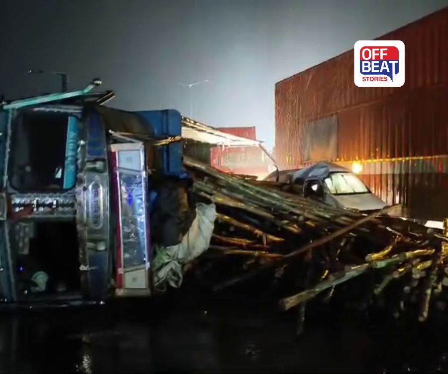 મળતી માહિતી મુજબ, ગઈકાલે રાત્રે વિસ્તારમાં અચાનક વાતાવરણ પલટાયું હતું અને જોરદાર પવન ફૂંકાયો હતો. આ વાવાઝોડાને કારણે હાઈવે પરનો એક મજબૂત વીજ થાંભલો ઉખડીને સીધો ચાલુ ટ્રાફિકમાં પડ્યો હતો. ટ્રક ચાલકે પોતાની સામે અચાનક પડતા થાંભલાથી બચવા માટે સ્ટેયરિંગને જોરથી કટ માર્યો હતો. આ તીવ્ર વળાંકને કારણે ટ્રકની ગતિ અને વજનને લીધે ટ્રક હવામાં ઉછળીને પલટી મારી ગયો હતો. કમનસીબે, એ જ સમયે પાછળથી આવી રહેલી ઇકો કાર ટ્રકની નીચે દબાઈ ગઈ હતી.