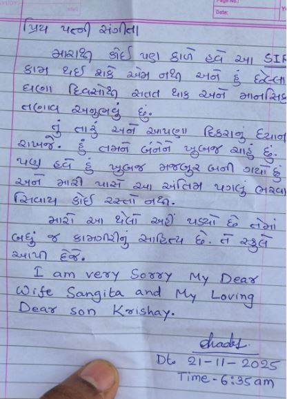 મળેલી માહિતી મુજબ, આત્મહત્યા કરતા પહેલા અરવિંદભાઈએ પોતાની પત્ની માટે એક સ્યુસાઈડ નોટ લખી હતી. તેમાં તેમણે SIR સંબંધિત કામગીરી અને વધતી જવાબદારીઓથી ખૂબ જ થાકી જવાનો ઉલ્લેખ કર્યો હતો. નોટમાં તેમના માનસિક દબાણ અને તાણ વિશે પણ સંકેત મળી આવ્યા છે.