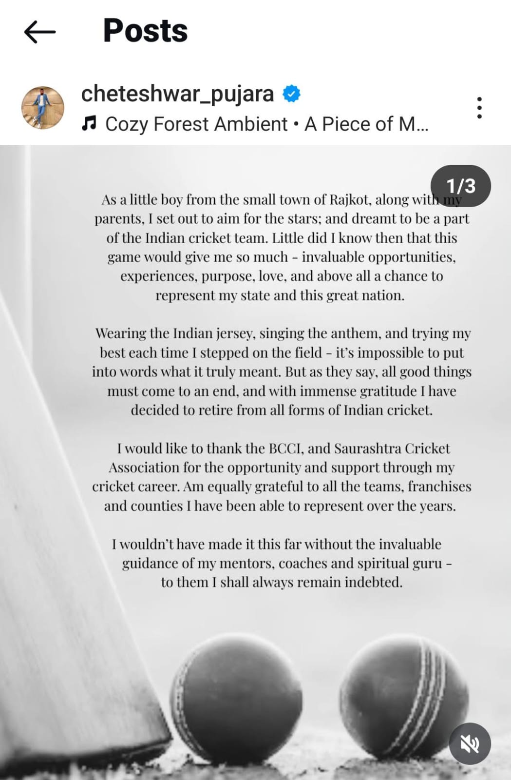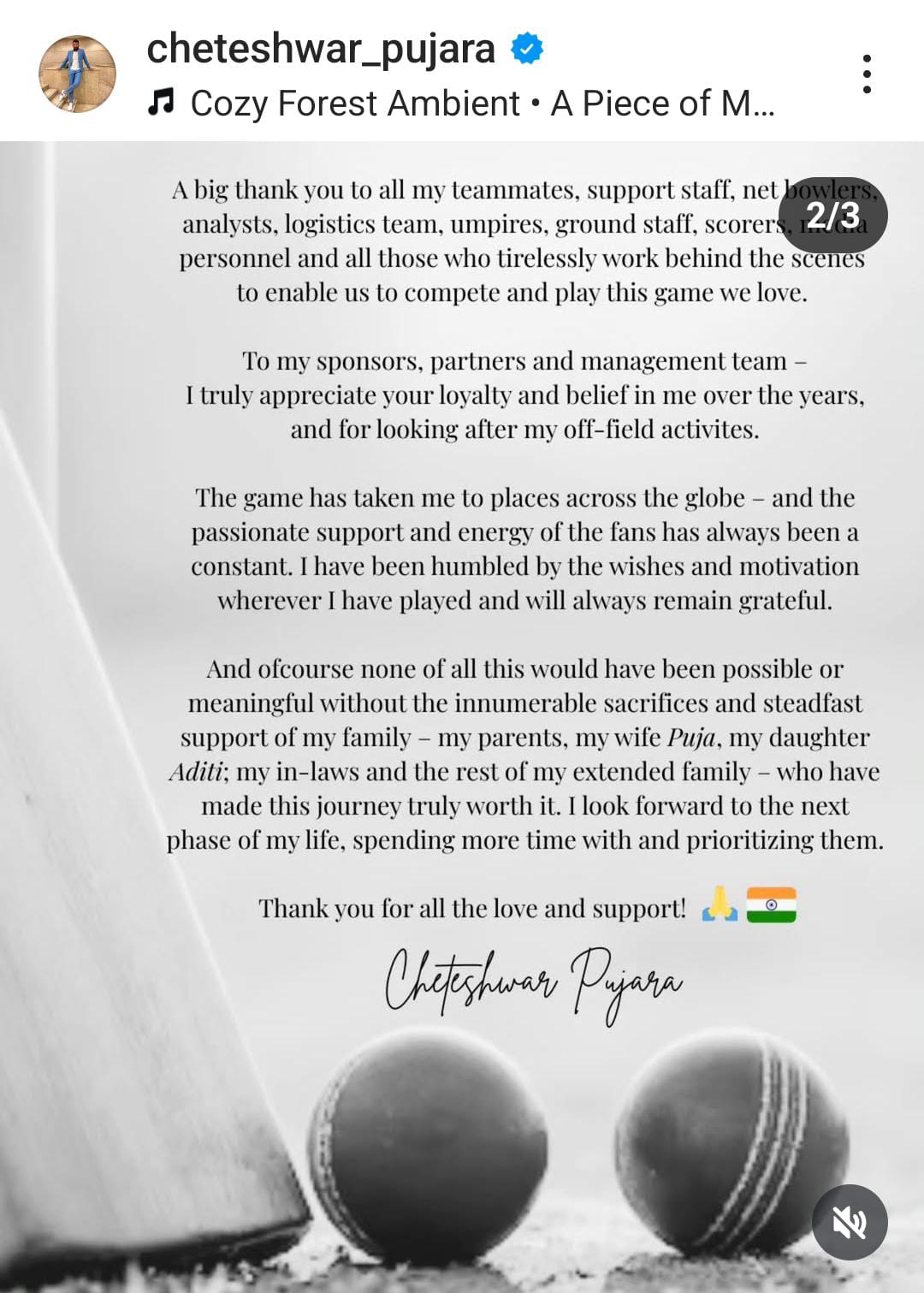ચેતેશ્વર પુજારાએ ચાહકોનો આભાર માન્યો હતો. તેણે કહ્યું કે, 'આ એક પ્રકરણનો હવે અંત આવ્યો છે. હું તેને ખૂબ જ આભારી છું. તમામ સૌના પ્રેમ અને સમર્થન બદલ આભાર.' દાયકાથી પણ વધુ સમય માટે ભારતીય ટેસ્ટ ટીમનો આધારસ્તંભ બનેલો પુજારા પોતાના શાંત અને અડગ પર્ફોર્મન્સના કારણે તેની પેઢીનો એક વિશ્વસનીય બેટર રહ્યો છે. 2018-19માં ઓસ્ટ્રેલિયામાં ભારતની ઐતિહાસિક પ્રથમ ટેસ્ટ સીરીઝને જીત અપાવવામાં પુજારાનો બહુમૂલ્ય ફાળો રહ્યો હતો. તે સીરીઝમાં તેણે 521 રન બનાવ્યા હતાં. કુલ 1258 બોલમાંથી મોટાભાગના બોલ તેણે ડિસ્પેન્ડ કરવાને બદલે ડિફ્યુઝ કર્યા હતાં અને ત્રણ સદી ફટકારી હતી.