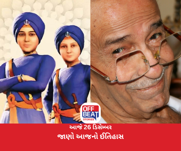 ઇતિહાસની તારીખમાં 26 ડિસેમ્બરનો દિવસ ભારત સહિત વિશ્વ માટે અત્યંત મહત્વપૂર્ણ છે. આજના દિવસે જ્યાં એક તરફ સાહિત્ય જગતના માંધાતા તારક મહેતાનો જન્મ થયો હતો, તો બીજી તરફ શીખ ગુરુઓના પુત્રોના સર્વોચ્ચ બલિદાનની યાદમાં ‘વીર બાળ દિવસ’ની ઉજવણી કરવામાં આવે છે. ચાલો જાણીએ આજના દિવસની મહત્વપૂર્ણ ઘટનાઓ વિશે.