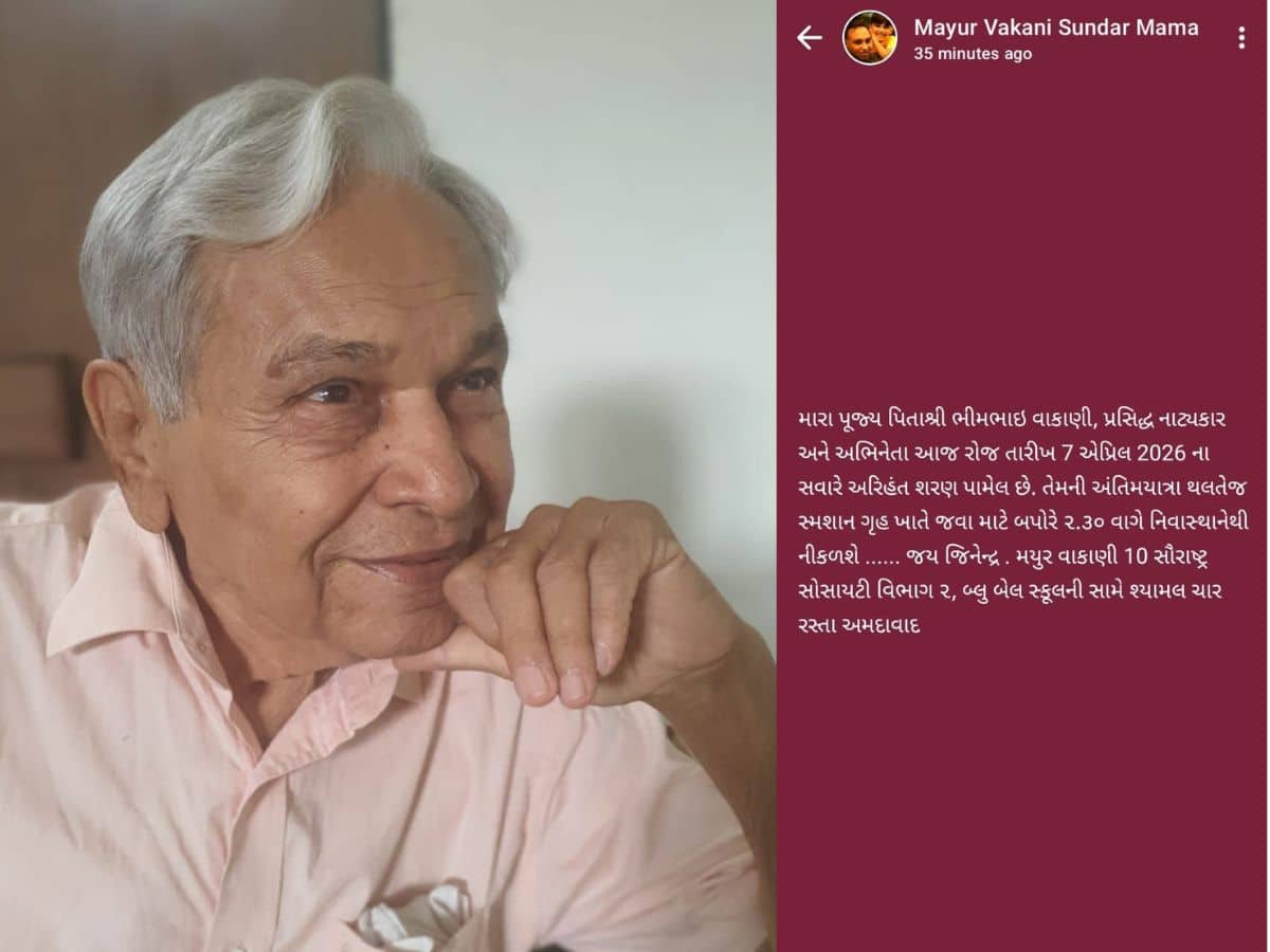 મળતી માહિતી મુજબ, ભીમ વાકાણીએ અમદાવાદમાં અંતિમ શ્વાસ લીધા હતા. પરિવાર અને ચાહકોમાં શોકનો માહોલ છે. મયુર વાકાણીએ સોશિયલ મીડિયા પર માહિતી આપતાં જણાવ્યું કે 7 એપ્રિલ, 2026ના રોજ સવારે તેમના પિતાનું અવસાન થયું હતું.