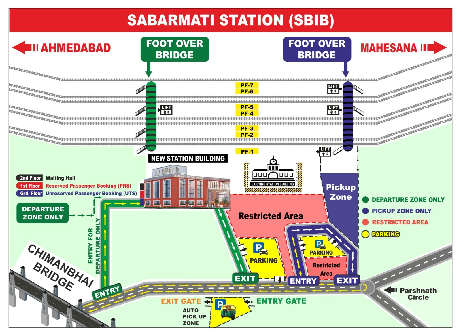 પ્રવેશ દ્વાર: યાત્રીઓના વાહનોનો પ્રવેશ એમએમટીએસ બિલ્ડિંગ (બુલેટ ટ્રેન સ્ટેશન) નજીકથી કરવામાં આવી રહ્યો છે. (ડાયગ્રામમાં દર્શાવેલી ગ્રીન લાઇન મુજબ)