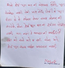 તેમણે લખ્યું કે, ''હું મયંક અમૃતલાલ પરમાર મારા બે ચેક અમિત પંચાલ ટોરેન્ટ પાવરમાં કામ કરે છે તેમની પાસે છે.જેમણે મને વ્યાજ પર રૂપિયા આપ્યા હતા. દર 10 દિવસનું 10% વ્યાજ લેતા હતા. મારા બે ચેક એમની પાસે હશે. કોટક બેંક રકમ નથી લખી તેમાં બે લાખ આપ્યા હતા. ગેલેક્સી રાસ કરવામાં મારુ કોઈ પાર્ટનર નથી. તેની કોઈપણ જાતના જવાબદારી બીજા કોઈ મેમ્બરની નથી તેની નોંધ લેવી. ગેલેક્સી રાસ ગરબાનું આયોજન કરેલું હતું જે મારું પોતાનું હતું જેમાં મારું કોઈ પાર્ટનર નથી. રૂપિયાની લેવાદેવડ મારી પોતાની હતી જેમાં પણ નામ છે તે ખાલી અને ખાલી સપોર્ટ માટે હતા. જેનાથી કોઈપણ જવાબદારી તેમની નથી. લગભગ બધાનું પેમેન્ટ 90% આપેલું છે જેનાથી કોઈ ખોટી અફવાઓ ન ઉડાવતા મહેરબાની કરીને''.