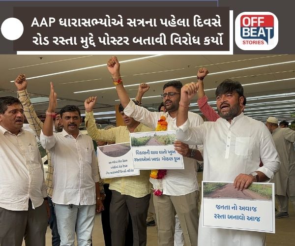 Gujarat Legislative Assembly: ગુજરાત વિધાનસભાના ચોમાસા સત્રનો આજથી પ્રારંભ થયો છે. ત્યારે વિધાનસભા સત્રમાં હાજરી આપવા માટે આમ આદમી પાર્ટીના વિસાવદરના ધારાસભ્ય ગોપાલ ઇટાલીયા, જામજોધપુરના ધારાસભ્ય હેમંત ખવા, ગારીયાધારના ધારાસભ્ય સુધીર વાઘાણી વિધાનસભા ખાતે પહોંચ્યા હતા. આ ત્રણેય ધારાસભ્યએ રોડ-રસ્તાની ખરાબ સ્થિતિને લઈને જનતાનો અવાજ બનીને બેનર અને પોસ્ટર સાથે વિધાનસભામાં પહોંચ્યા હતા અને નારેબાજી કરી હતી.