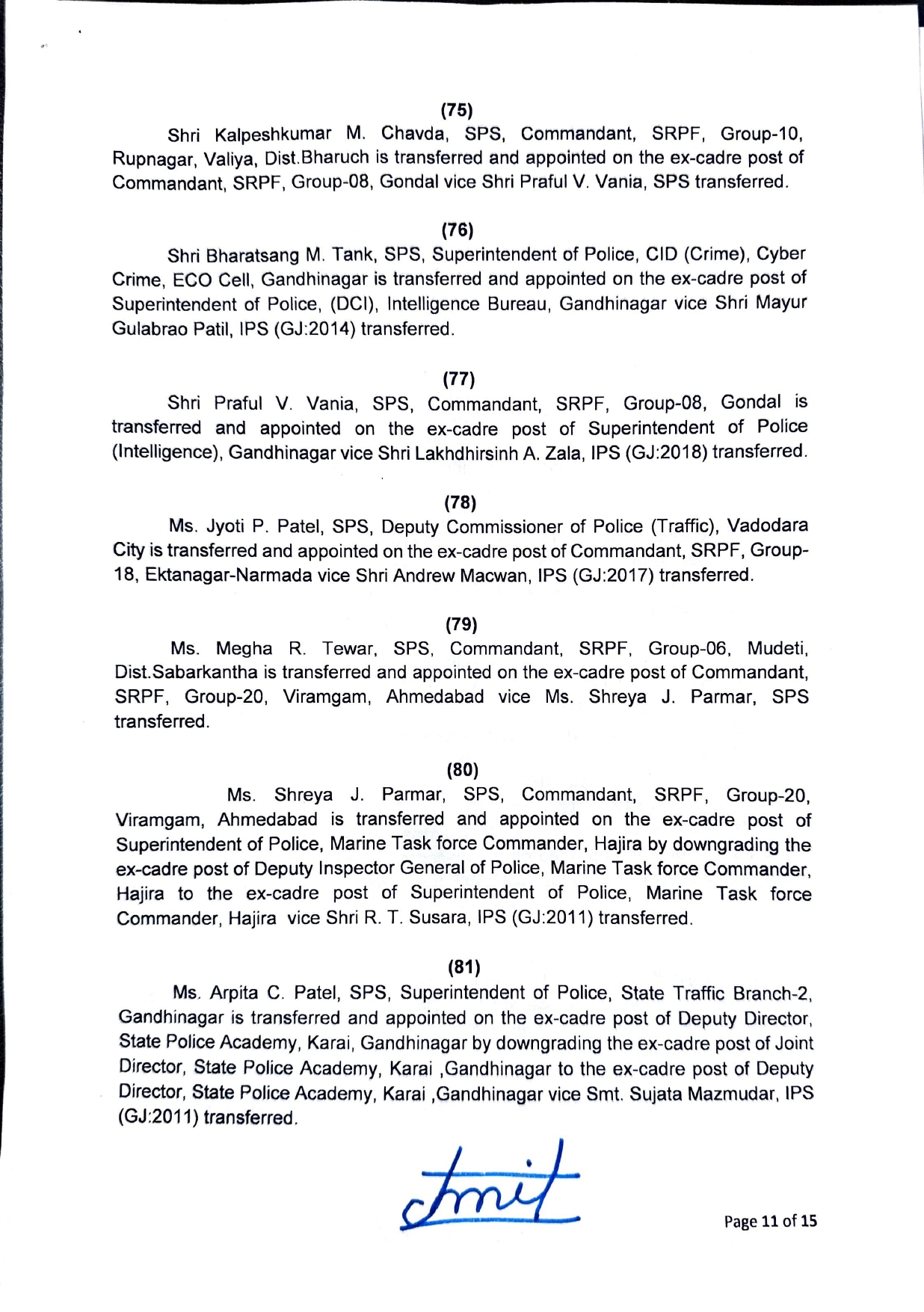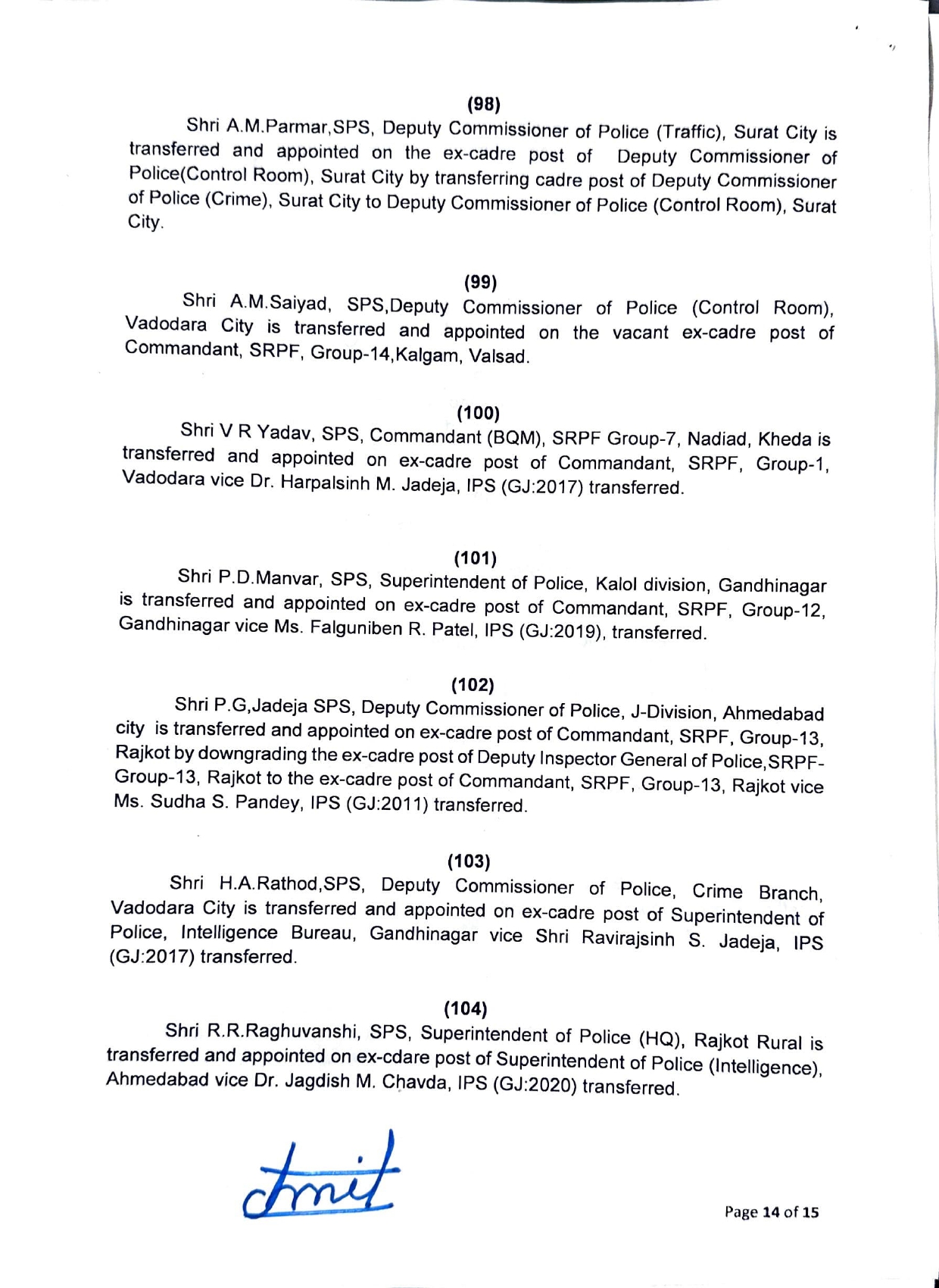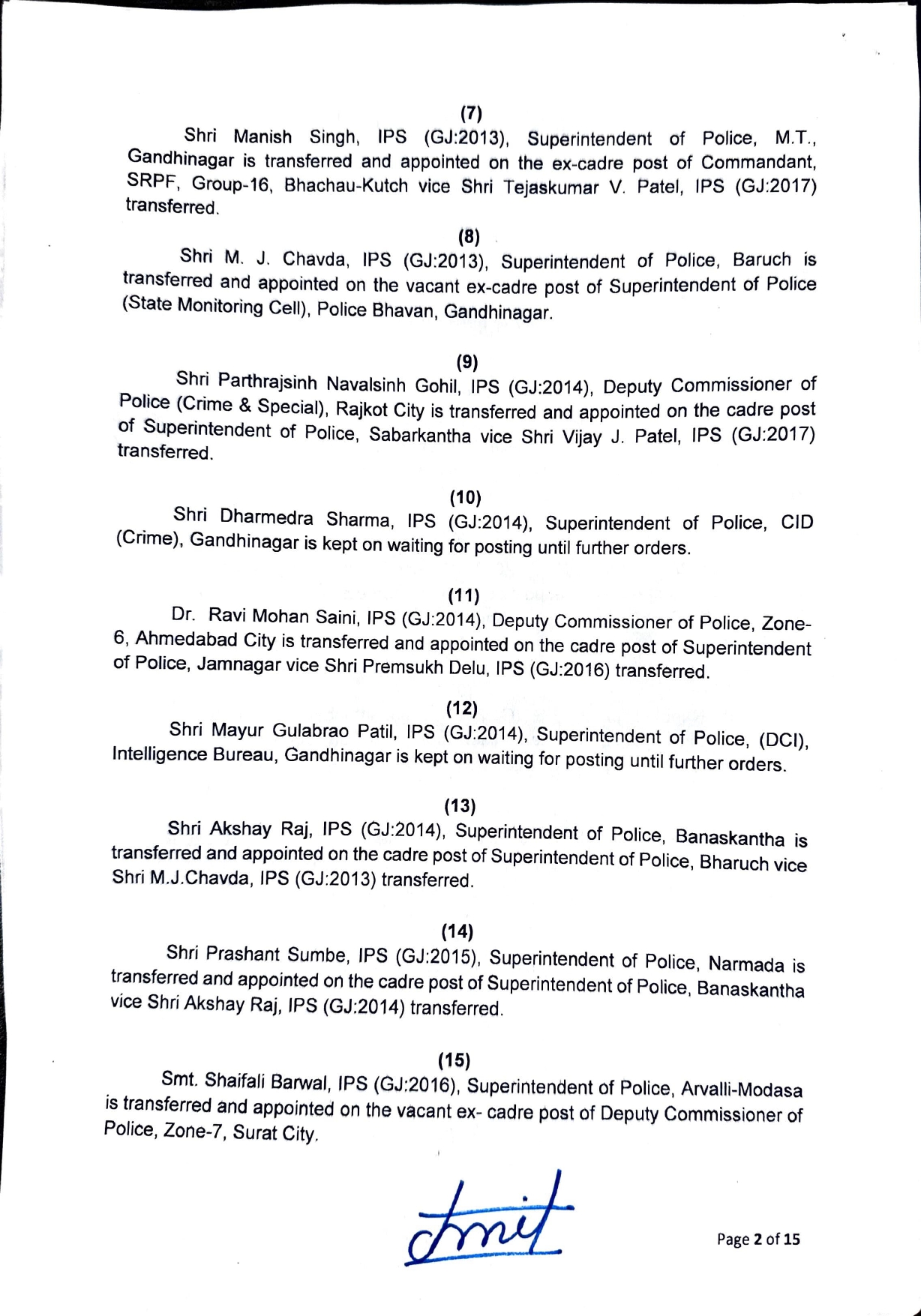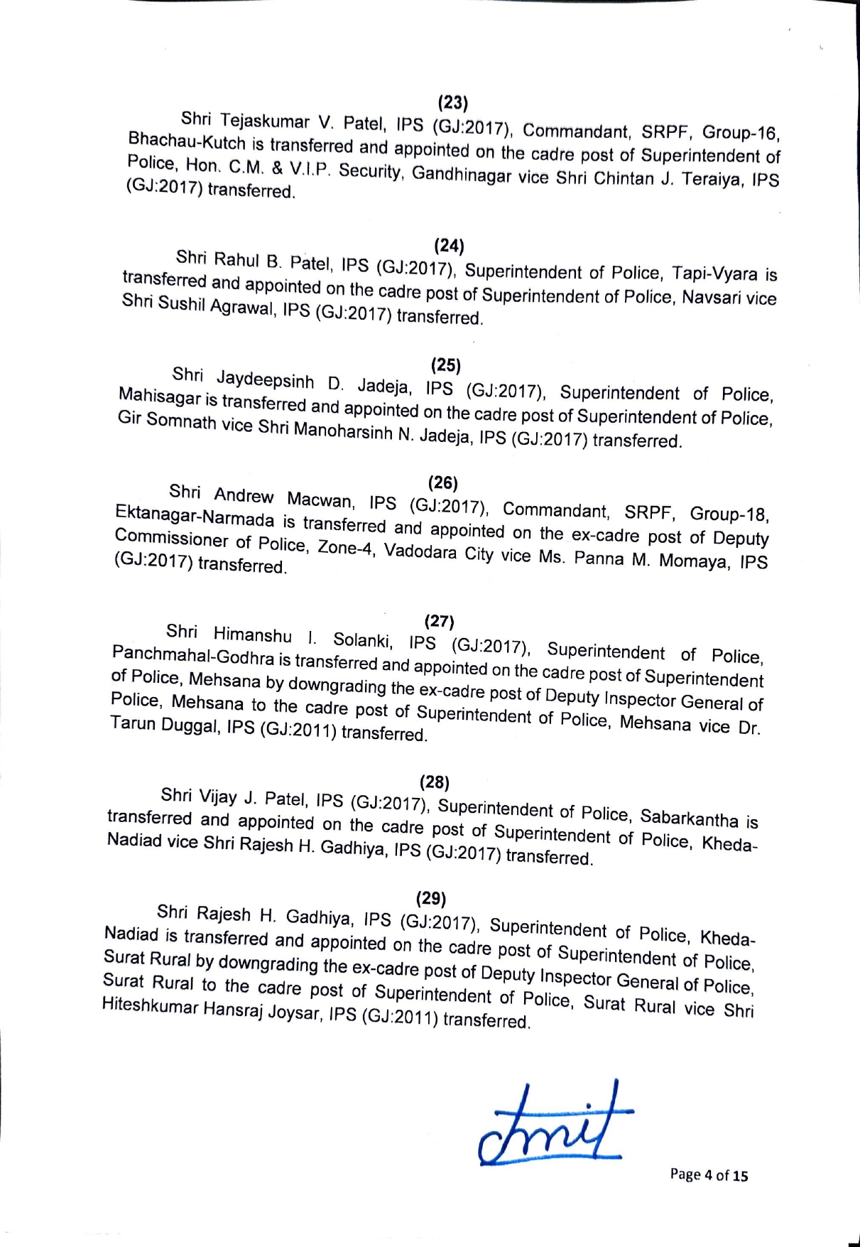 રાજ્ય સરકાર દ્વારા થોડા સમય પૂર્વે સિનિયર એસ.પી કક્ષાના અધિકારીઓને DIG તરીકે બઢતી આપી તેઓના હાલની ફરજની જગ્યાઓ ઉપર યથાવત રાખ્યા હતા. આ વાત અધિકારીઓને હજુ પણ તેઓની નિમણુકની નવી જગ્યાઓ માટે રાહ જોવી પડશે. રાજ્ય સરકાર દ્વારા એસ.પી કક્ષાના 105 અધિકારીઓની બદલીની યાદી જાહેર કરી છે. જેમાં કેટલાક DIG તરીકે બઢતી પામેલા અધિકારીનો પણ સમાવેશ થાય છે. સુરત જિલ્લા પોલીસ વડા હિતેશ જોયસર, મહેસાણા પોલીસ વડા તરૂણ દુગ્ગલનો સમાવેશ થાય છે, 2011ની બેચના IPS જેઓ DIG તરીકે બઢતી પામી શક્યા છે. તેઓની ક્યારે નિમણુક કરવામાં આવશે તે અંગની કોઈ જાહેરાત કરવામા આવી નથી. જેમાં CID ક્રાઈમમાં ફરજ બજાવતા ચેતન્ય માંડલીક, વડોદરા પશ્ચીમ રેલવે વડા સરોજ કુમારી, SRP-9ના કમાન્ડન્ટ આર પી ચુડાસમા, સુરત ઝોન-5ના આર પી બારોટ, સુરેન્દ્રનગર પોલીસ વડા ગરીશ પંડ્યા, મરિન ટ્રાસ્ક ફોર્સમાં ફરજ બજાવતા આર ટી સુસરા, SRP ગ્રૂપ-13ના કમાન્ડન્ટ સુધા પાંડે, રાજ્ય પોલીસ એકેડેમી કરાઈના વાઈસ પ્રિન્સિપાલ સુજાતા મજમુદારનો સમાવેશ થાય છે.