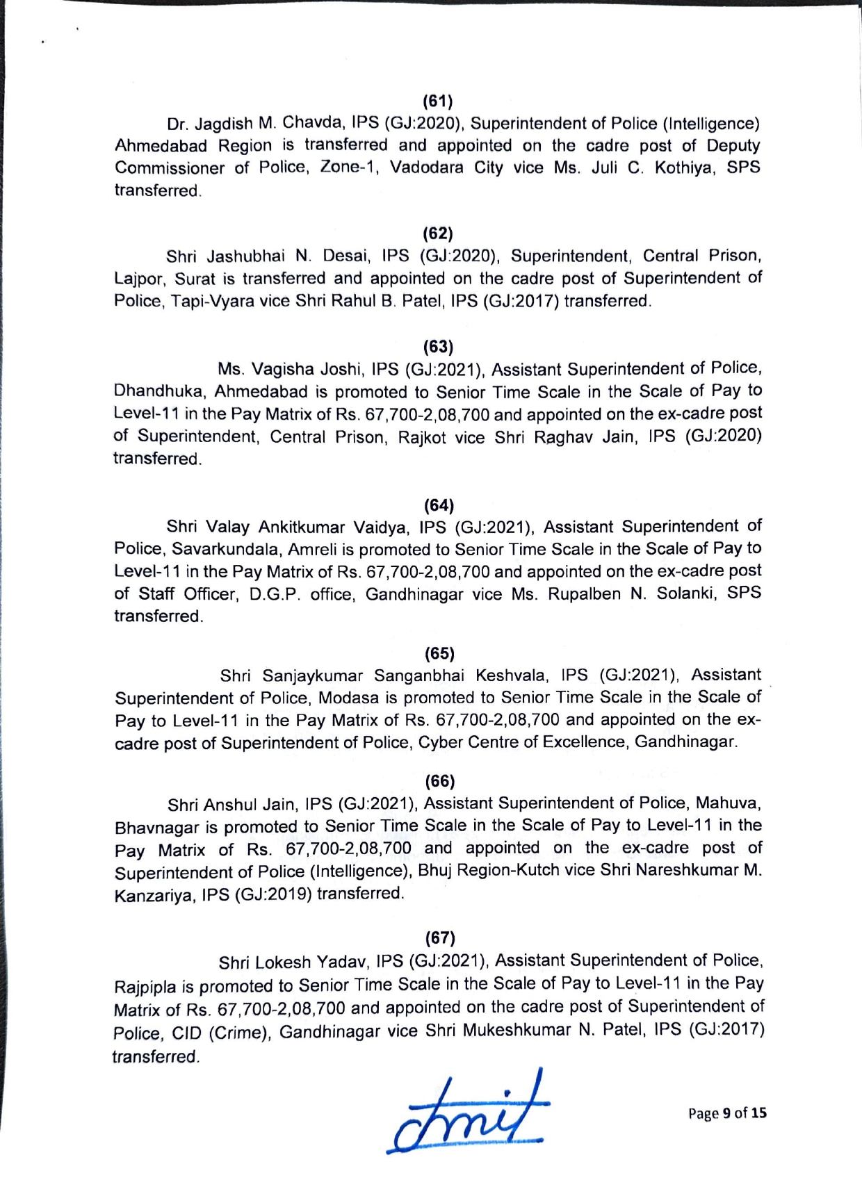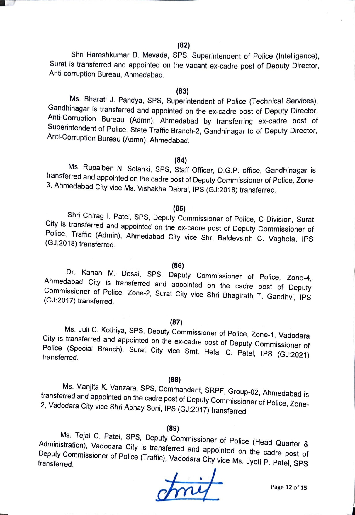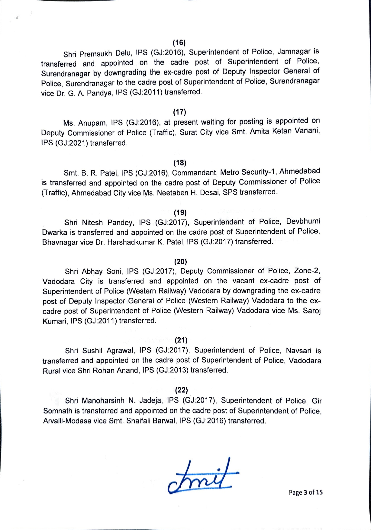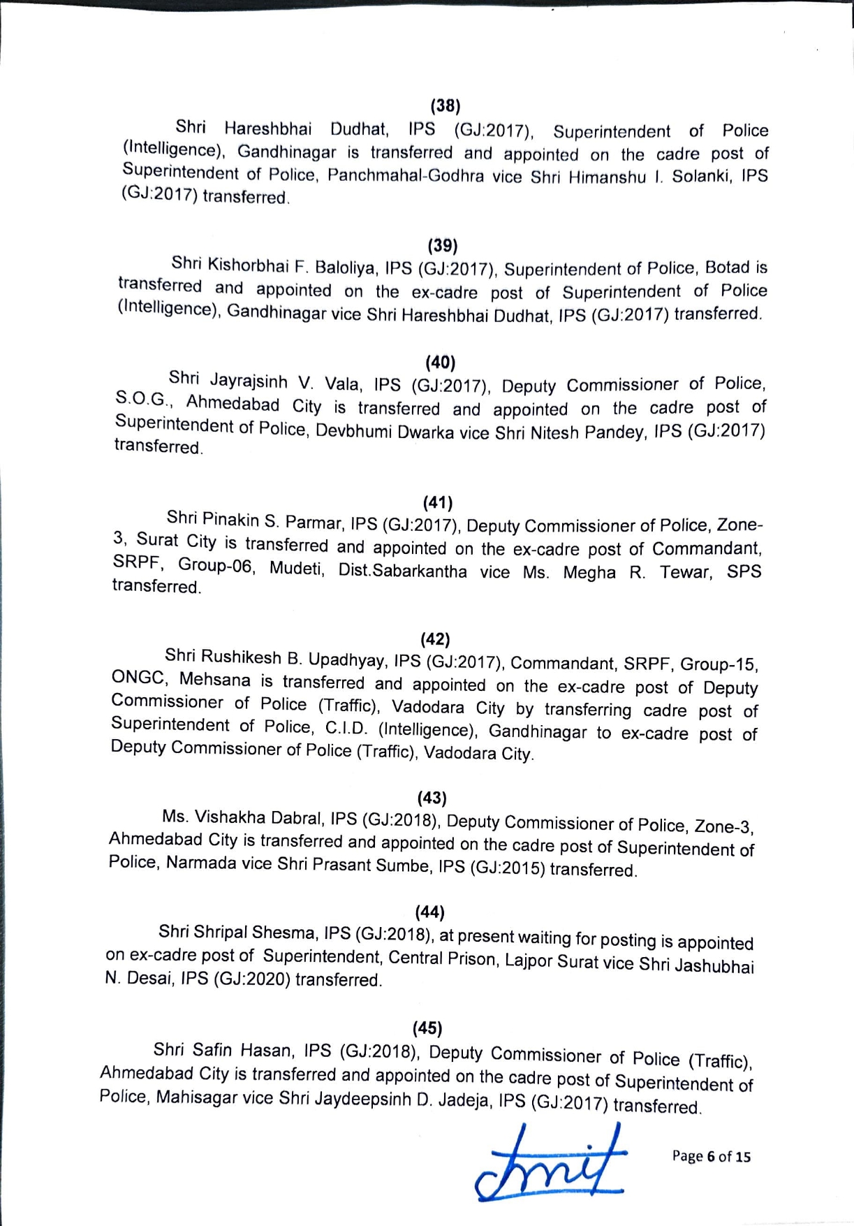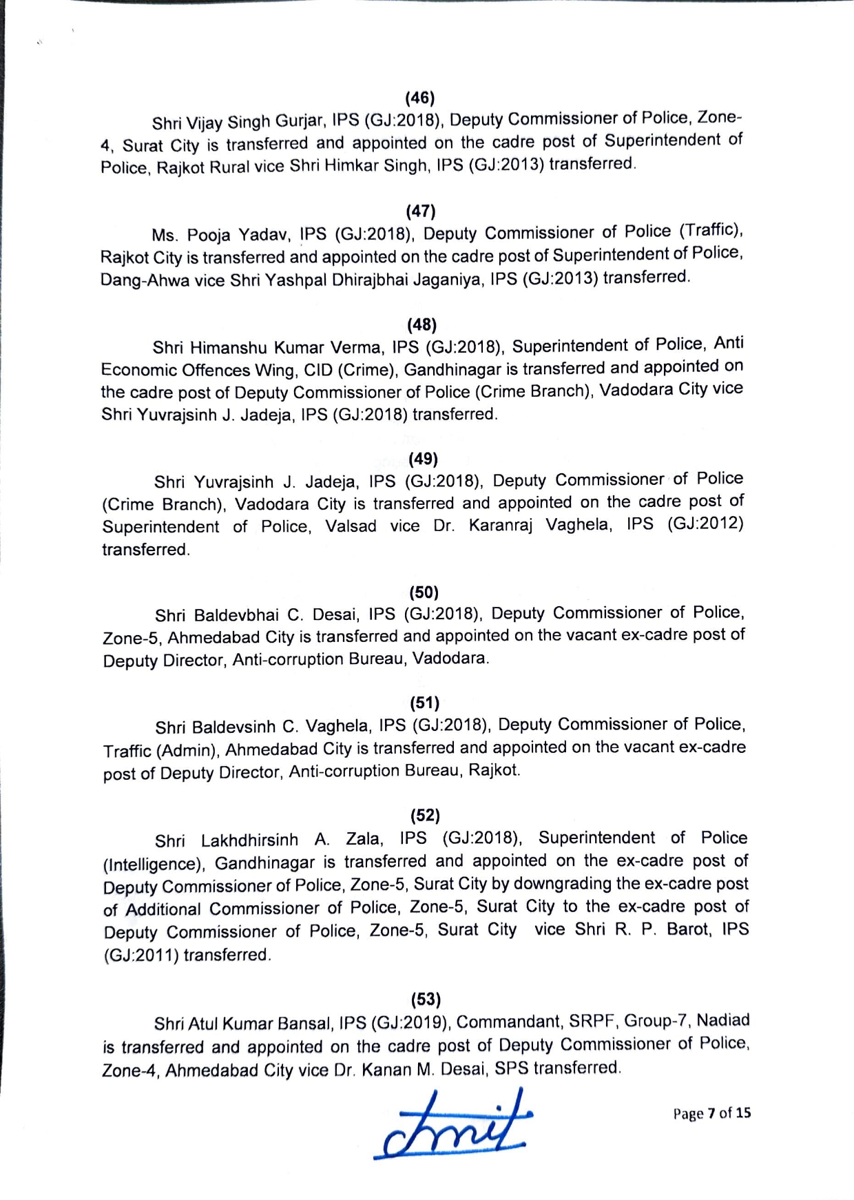 રાજ્ય સરકાર દ્વારા થોડા સમય પૂર્વે સિનિયર એસ.પી કક્ષાના અધિકારીઓને DIG તરીકે બઢતી આપી તેઓના હાલની ફરજની જગ્યાઓ ઉપર યથાવત રાખ્યા હતા. આ વાત અધિકારીઓને હજુ પણ તેઓની નિમણુકની નવી જગ્યાઓ માટે રાહ જોવી પડશે. રાજ્ય સરકાર દ્વારા એસ.પી કક્ષાના 105 અધિકારીઓની બદલીની યાદી જાહેર કરી છે. જેમાં કેટલાક DIG તરીકે બઢતી પામેલા અધિકારીનો પણ સમાવેશ થાય છે. સુરત જિલ્લા પોલીસ વડા હિતેશ જોયસર, મહેસાણા પોલીસ વડા તરૂણ દુગ્ગલનો સમાવેશ થાય છે, 2011ની બેચના IPS જેઓ DIG તરીકે બઢતી પામી શક્યા છે. તેઓની ક્યારે નિમણુક કરવામાં આવશે તે અંગની કોઈ જાહેરાત કરવામા આવી નથી. જેમાં CID ક્રાઈમમાં ફરજ બજાવતા ચેતન્ય માંડલીક, વડોદરા પશ્ચીમ રેલવે વડા સરોજ કુમારી, SRP-9ના કમાન્ડન્ટ આર પી ચુડાસમા, સુરત ઝોન-5ના આર પી બારોટ, સુરેન્દ્રનગર પોલીસ વડા ગરીશ પંડ્યા, મરિન ટ્રાસ્ક ફોર્સમાં ફરજ બજાવતા આર ટી સુસરા, SRP ગ્રૂપ-13ના કમાન્ડન્ટ સુધા પાંડે, રાજ્ય પોલીસ એકેડેમી કરાઈના વાઈસ પ્રિન્સિપાલ સુજાતા મજમુદારનો સમાવેશ થાય છે.