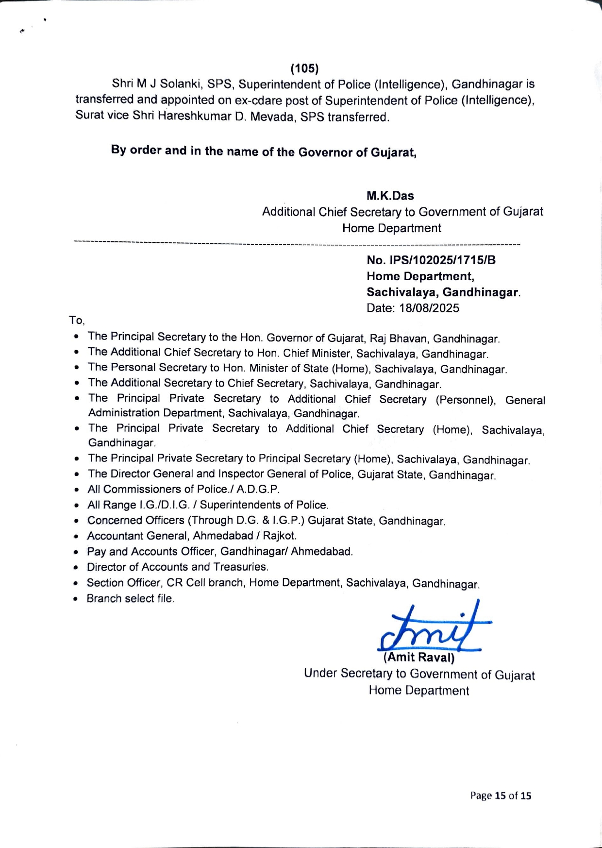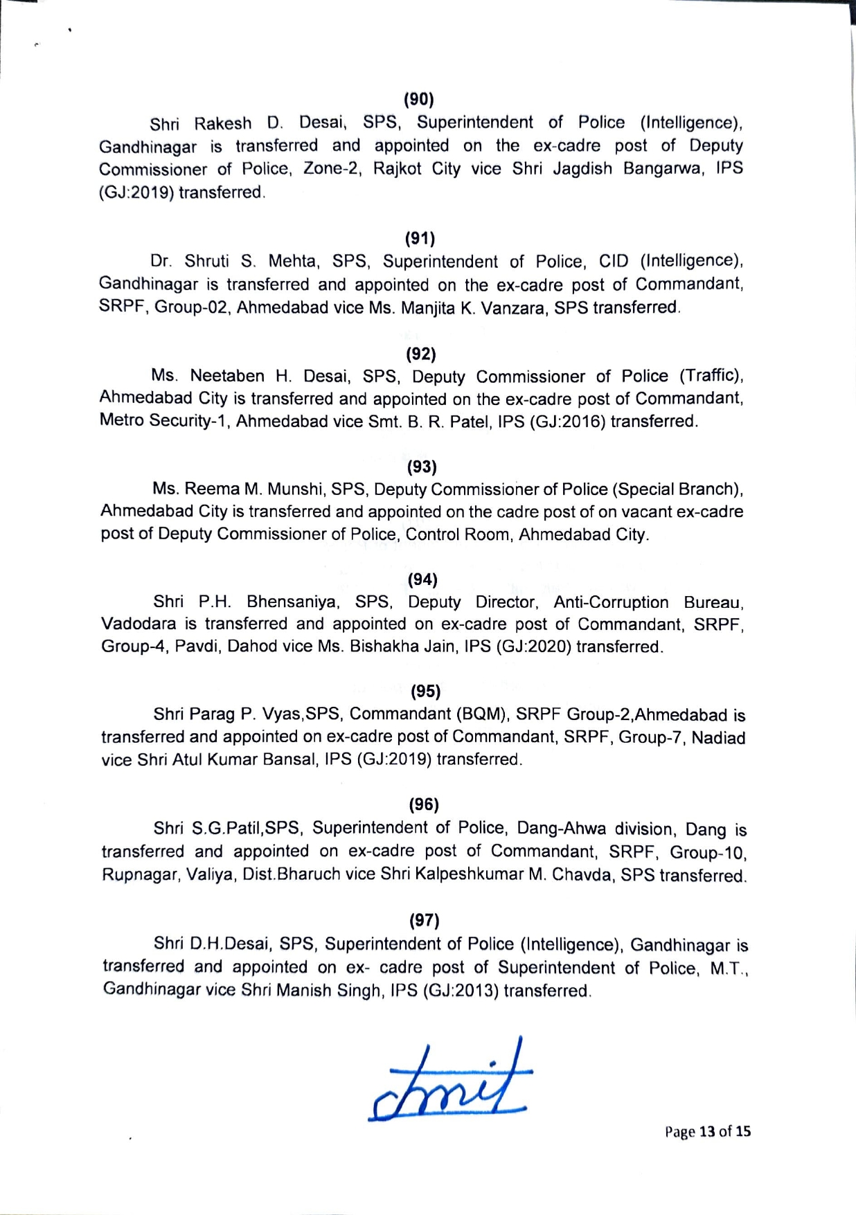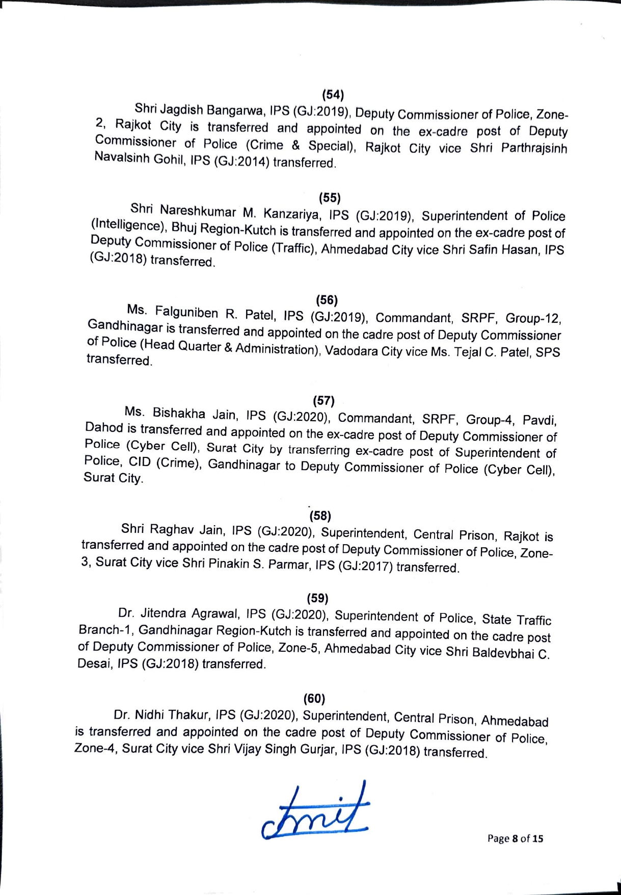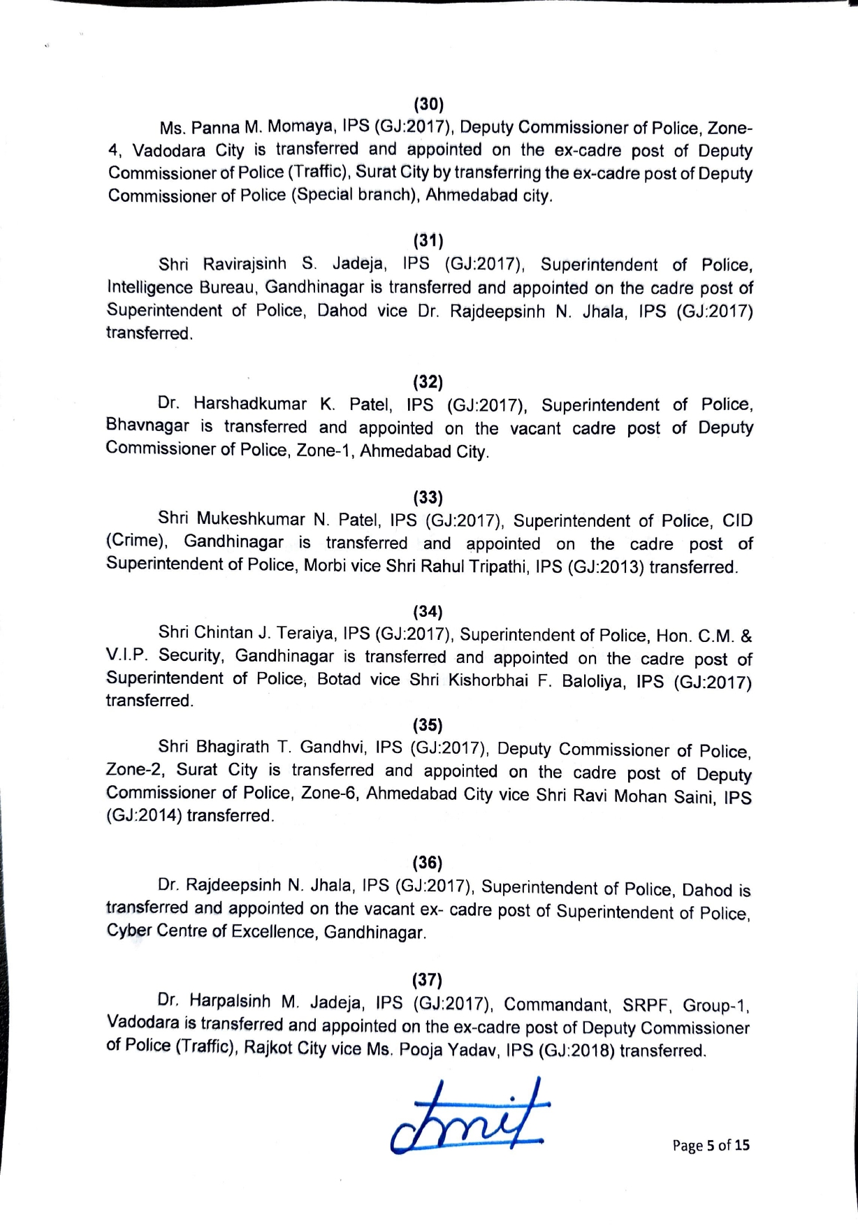રાજ્ય સરકાર દ્વારા થોડા સમય પૂર્વે સિનિયર એસ.પી કક્ષાના અધિકારીઓને DIG તરીકે બઢતી આપી તેઓના હાલની ફરજની જગ્યાઓ ઉપર યથાવત રાખ્યા હતા. આ વાત અધિકારીઓને હજુ પણ તેઓની નિમણુકની નવી જગ્યાઓ માટે રાહ જોવી પડશે. રાજ્ય સરકાર દ્વારા એસ.પી કક્ષાના 105 અધિકારીઓની બદલીની યાદી જાહેર કરી છે. જેમાં કેટલાક DIG તરીકે બઢતી પામેલા અધિકારીનો પણ સમાવેશ થાય છે. સુરત જિલ્લા પોલીસ વડા હિતેશ જોયસર, મહેસાણા પોલીસ વડા તરૂણ દુગ્ગલનો સમાવેશ થાય છે, 2011ની બેચના IPS જેઓ DIG તરીકે બઢતી પામી શક્યા છે. તેઓની ક્યારે નિમણુક કરવામાં આવશે તે અંગની કોઈ જાહેરાત કરવામા આવી નથી. જેમાં CID ક્રાઈમમાં ફરજ બજાવતા ચેતન્ય માંડલીક, વડોદરા પશ્ચીમ રેલવે વડા સરોજ કુમારી, SRP-9ના કમાન્ડન્ટ આર પી ચુડાસમા, સુરત ઝોન-5ના આર પી બારોટ, સુરેન્દ્રનગર પોલીસ વડા ગરીશ પંડ્યા, મરિન ટ્રાસ્ક ફોર્સમાં ફરજ બજાવતા આર ટી સુસરા, SRP ગ્રૂપ-13ના કમાન્ડન્ટ સુધા પાંડે, રાજ્ય પોલીસ એકેડેમી કરાઈના વાઈસ પ્રિન્સિપાલ સુજાતા મજમુદારનો સમાવેશ થાય છે.