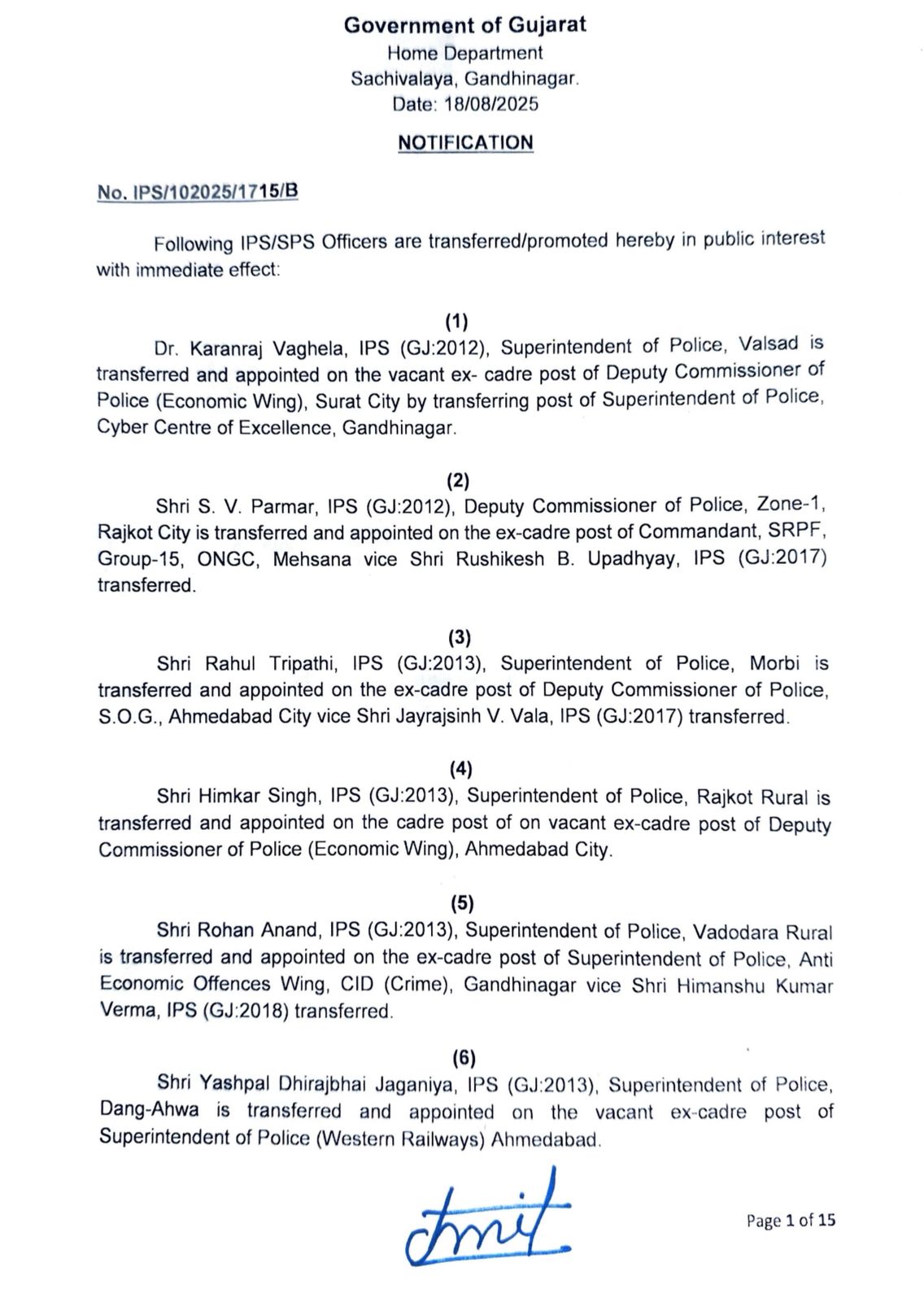 લાંબા સમયથી જેની રાહ જોવાતી હતી તે IPS અધિકારીઓની બદલીની યાદી આખરે ગૃહ વિભાગ દ્વારા જાહેર કરવામાં આવી છે, રાજ્યના મોટાભાગના જિલ્લા પોલીસ વડાઓની બદલી કરી દેવામાં આવી છે,સાથે અમદાવાદ, વડોદરા, સુરત, રાજકોટ જેવા મેટ્રો શહેરોમાં DCP તરીકે ફરજ બજાવતા અધિકારીઓની પણ બદલીઓ કરવામાં આવી છે. બદલીની યાદી અને નિમણુકની જગ્યાઓ જોતા લાગી રહ્યું છે કે, સરકાર અને ગૃહ વિભાગ દ્વારા લાંબા મનોમંથન બાદ ગંભીરતા પૂર્વક નિમણુકો કરી છે. જે રાજ્યની કાયદો અને વ્યવસ્થાની પરિસ્થતિને વધુ સુદ્રઢ બનાવવાના પ્રયાસ તરીકે જોઈ શકાય છે. એક સાથે મોટા ભાગના જિલ્લાઓના પોલીસ વડાઓને બદલી કાઢવામાં આવ્યા હોય તેવું રાજ્યમાં લાંબા સમય પછી બન્યું છે.