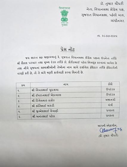 ગુજરાત કોંગ્રેસમાં નવા પ્રદેશ પ્રમુખ અને વિધાનસભામાં કોંગ્રેસ પક્ષના નવા નેતાની નિમણૂક કરવામાં આવ્યા બાદ હવે વિધાનસભાના કોંગ્રેસ પક્ષ નેતા ડો. તુષાર ચૌધરીએ કોંગ્રેસ પક્ષના ઉપનેતા, ઉપદંડક, ખજાનચી અને મંત્રી તેમજ પ્રવક્તાની નિમણૂક કરી છે.