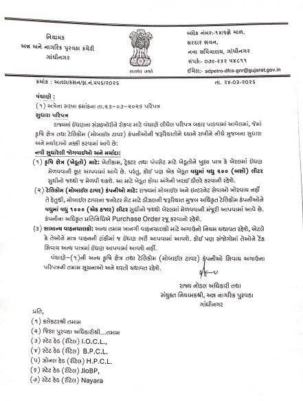 નવા પરિપત્ર મુજબ, સરકારે વિવિધ ક્ષેત્રો માટે ઇંધણ મેળવવાની મર્યાદા નક્કી કરી છે જેથી જરૂરિયાતવાળા લોકોને મુશ્કેલી ન પડે. ખેતીકામ માટે ડીઝલની જરૂરિયાતને ધ્યાનમાં રાખીને, ખેડૂતો હવે ખેતીના સાધનો કે ટ્રેક્ટર સિવાય અલગથી બેરલમાં વધુમાં વધુ 200 લીટર સુધી ઇંધણ મેળવી શકશે. મોબાઈલ નેટવર્કની સેવાઓ ખોરવાય નહીં તે હેતુથી ટેલિકોમ કંપનીઓને તેમના મોબાઈલ ટાવરના જનરેટર માટે 1000 લીટર સુધી ડીઝલનો જથ્થો લેવાની મંજૂરી આપવામાં આવી છે.