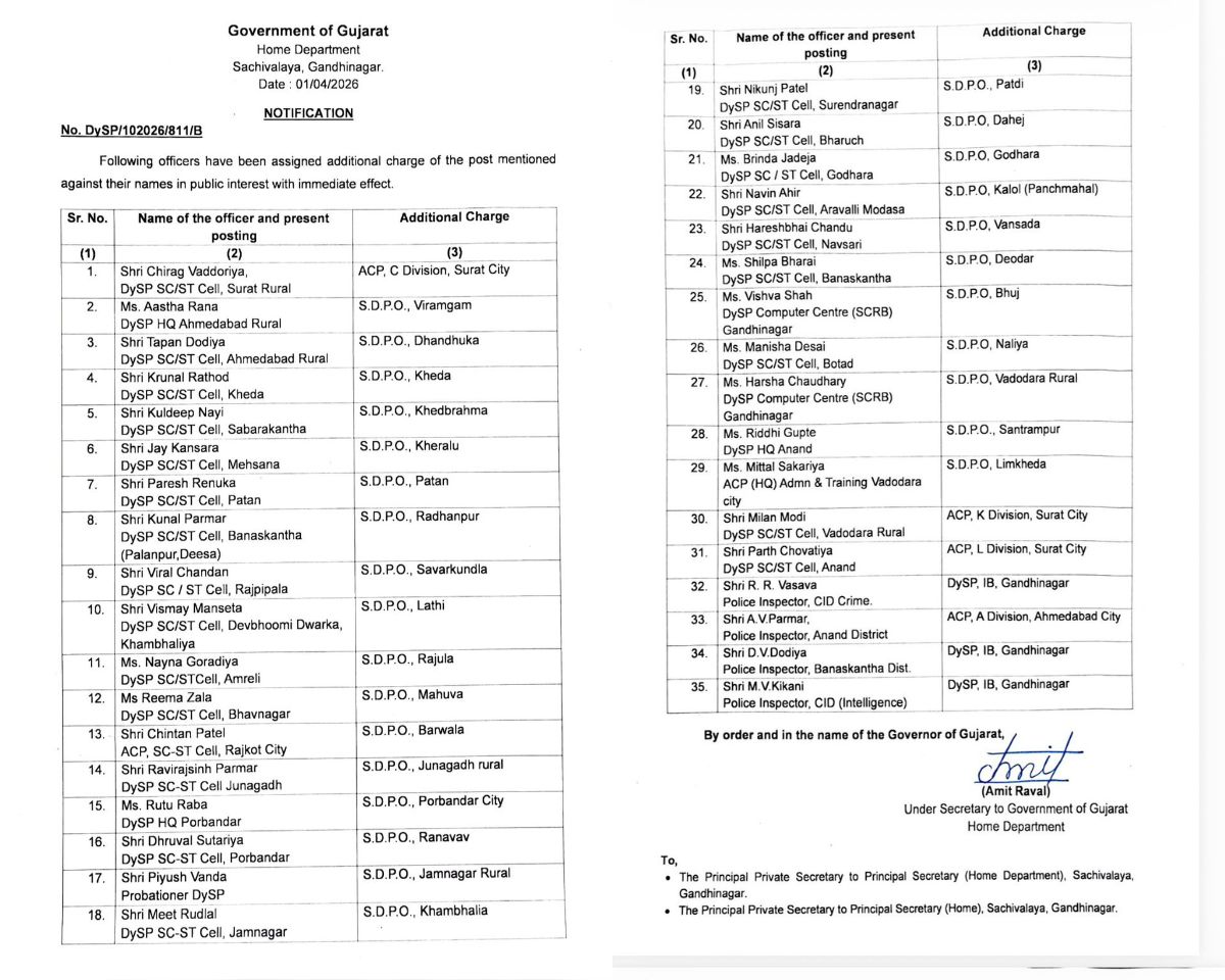 મળતી માહિતી મુજબ, કુલ 35 જેટલા પોલીસ અધિકારીઓને તેમના નિયમિત પદ સાથે વધારાનો ચાર્જ સોંપવામાં આવ્યો છે. આ નિર્ણય વહીવટી વ્યવસ્થાને વધુ સુચારૂ બનાવવા અને કાર્યક્ષમતા વધારવા માટે લેવામાં આવ્યો હોવાનું માનવામાં આવે છે.