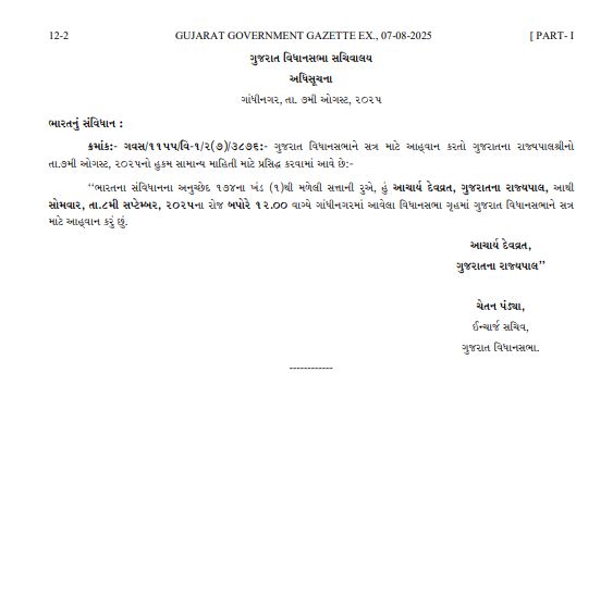 વિધાનસભાના અધ્યક્ષ શંકર ચૌધરીએ કહ્યું કે, ''ગુજરાત રાજ્યના રાજ્યપાલ આચર્ય દેવવ્રતએ પંદરમી વિધાનસભાના સાતમાં સત્રનું આહ્વાન કર્યું છે. આ ચોમાસું સત્ર તારીખ 8થી10 સપ્ટેમ્બર દરમિયાન બોલવવામાં આવ્યુ છે''.
