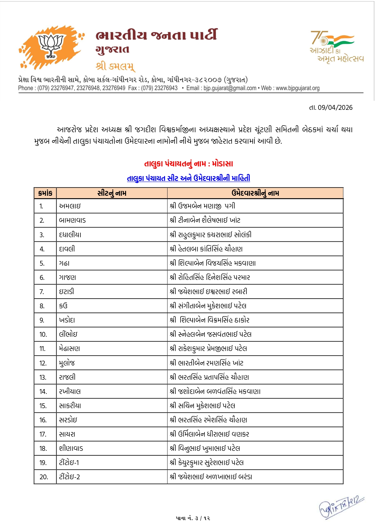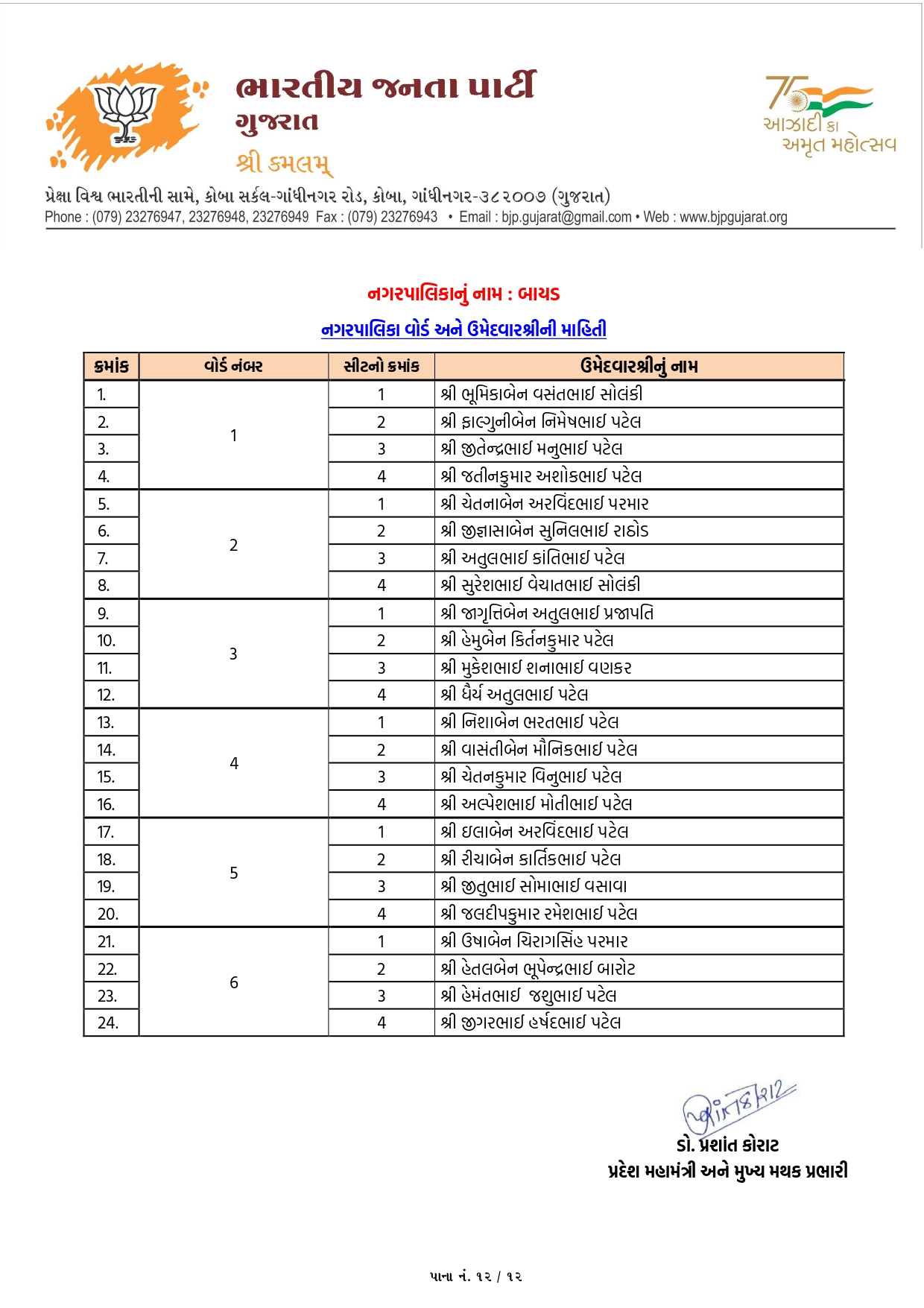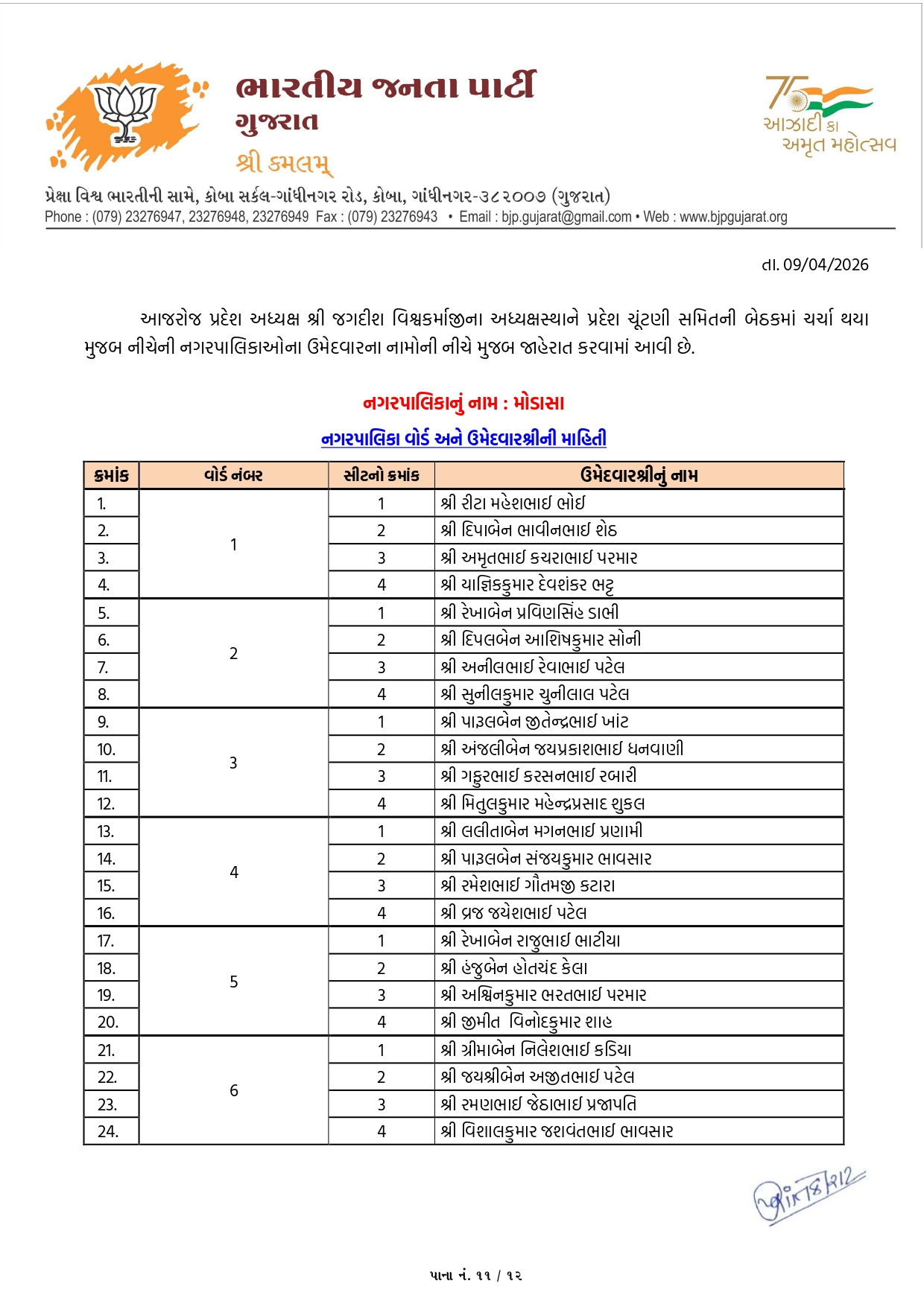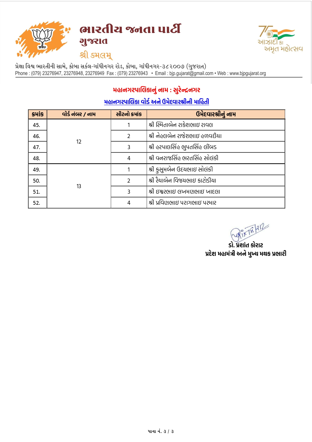 સુરેન્દ્રનગર મહાનગરપાલિકાના ભાજપના તમામ 52 ઉમેદવારોના નામની જાહેરાત