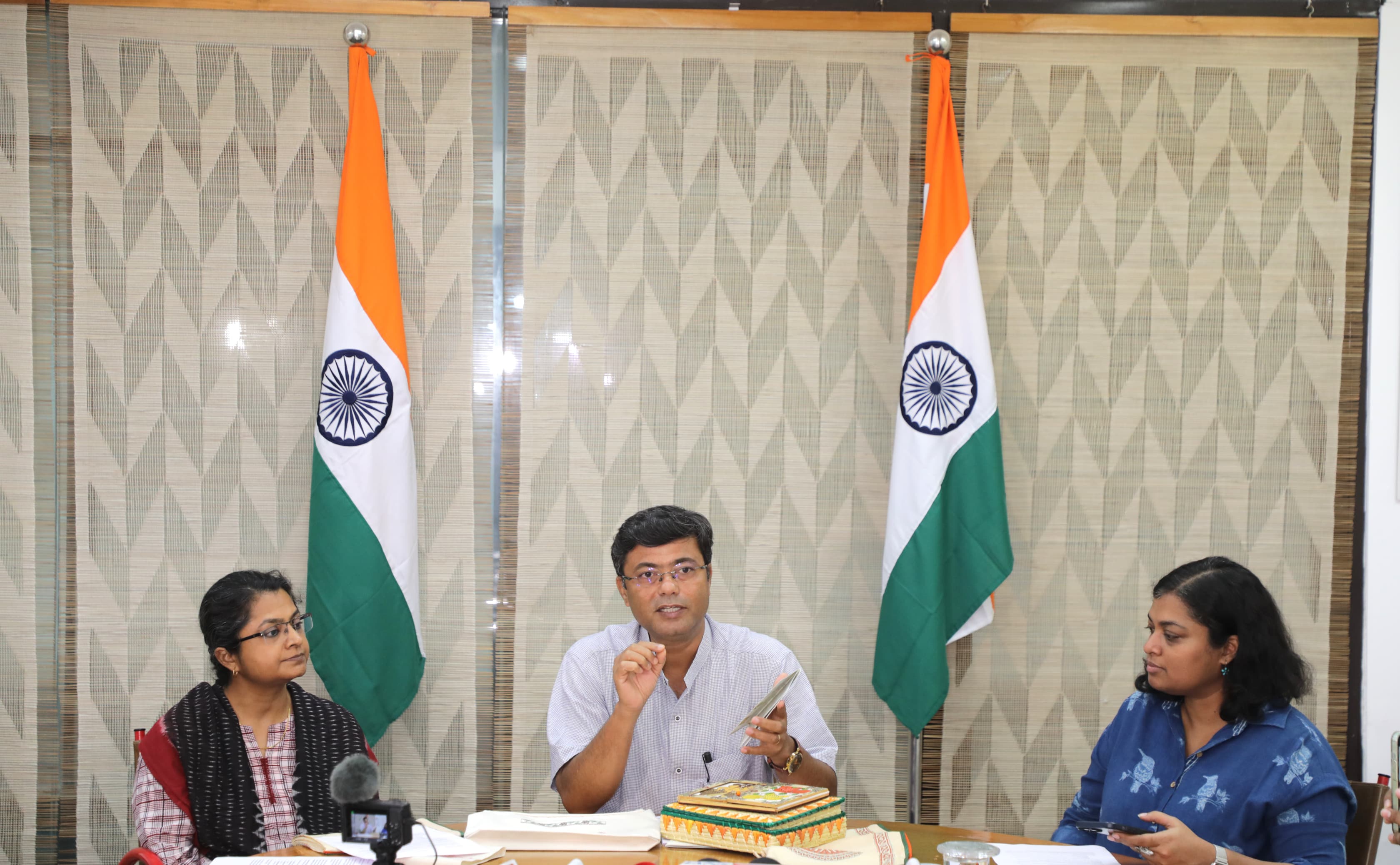 આ ઉપરાંત, હાથ વણાટની સિલ્ક સ્ટોલ પણ છે. જેમાં મત્સ્ય, કમલ અને બસંત જેવાં પ્રાદેશિક ચિત્રો છે અને જળરંગો દ્વારા સુશોભિત આ વસ્ત્રમાં ત્રિરંગાના રંગો પણ સુંદર છાપ ઊભી કરે છે. કિટમાં પૂર્વ ભારતના લોક ચિત્રો, જેવા કે: બિહારની ટિકુલી કલા, ઐતિહાસિક એવી ઝારખંડની પૈટકર પેઇન્ટિંગ, ઓડિશાની તાલપત્ર ચિત્ર અને બંગાળના પટ્ટાચિત્ર (Gl-ટેગ્ડ) ભારતના જીવંત વારસા અને સર્જનાત્મક અભિવ્યક્તિ અને કાલાતીત ભાવનાને મૂર્તિમંત કરે છે. એનઆઈડી-અમદાવાદ દ્વારા તૈયાર કરવામાં આવેલી આ કિટને NID બેંગલુરુ કેમ્પસના ડીન સી.એસ. સુસાન્થના નેતૃત્વમાં સંકલિત કરવામાં આવી છે તેમ તેમણે ઉમેર્યું હતું._f5bc17f6-03a9-408a-aba9-5d5188079f76.jpeg)