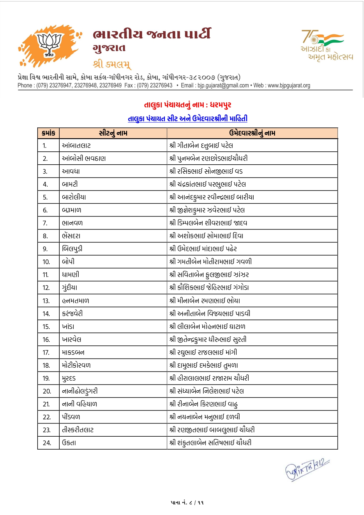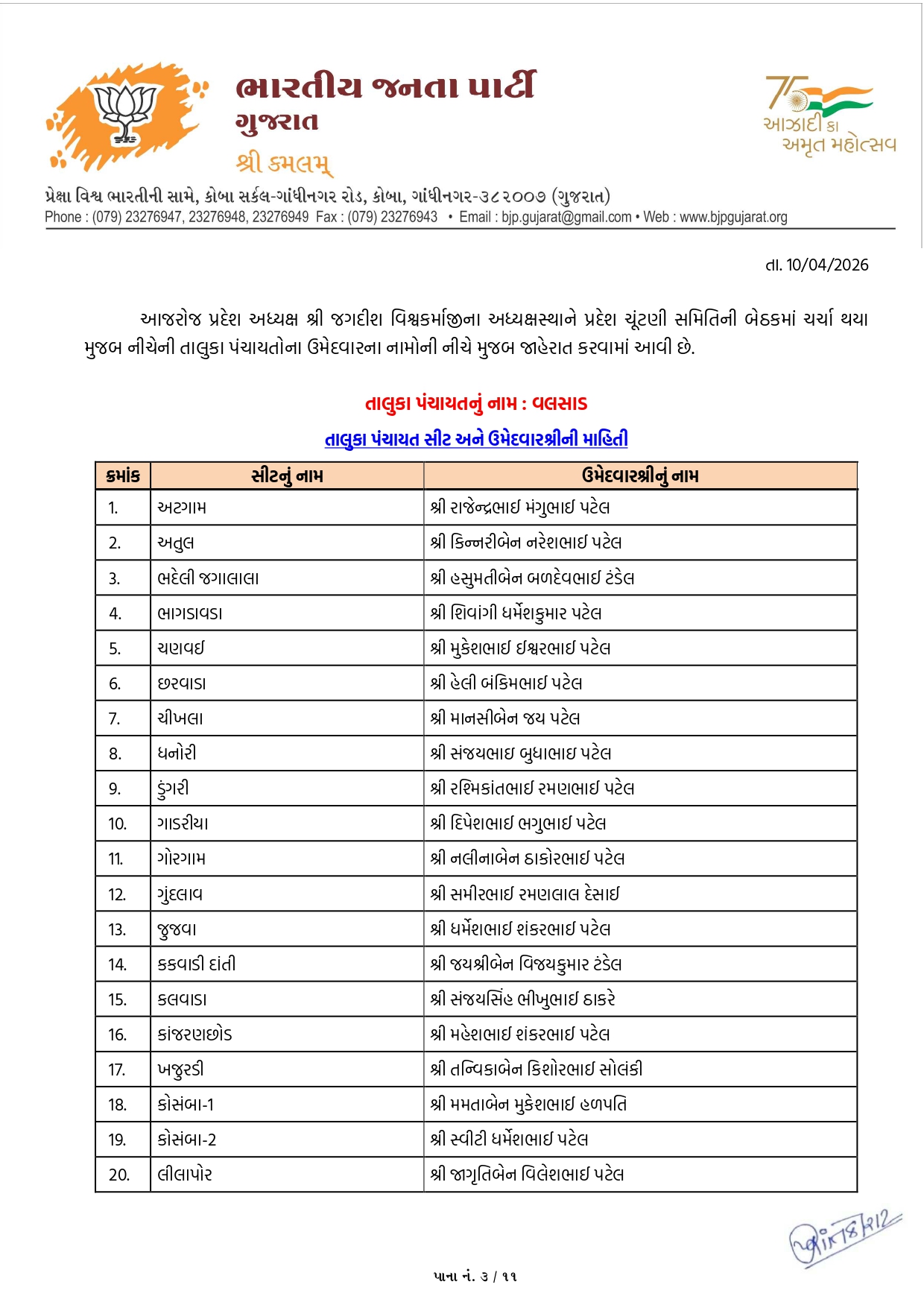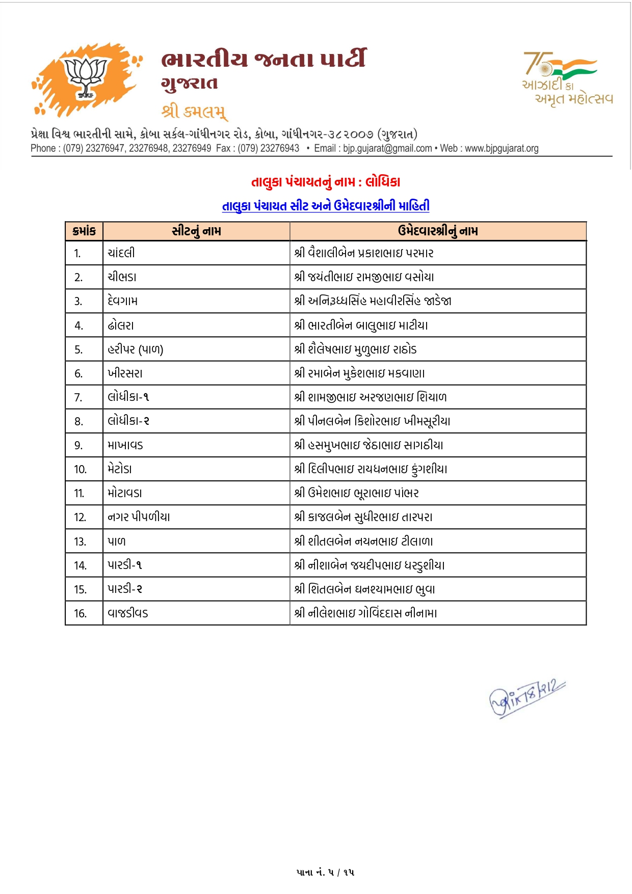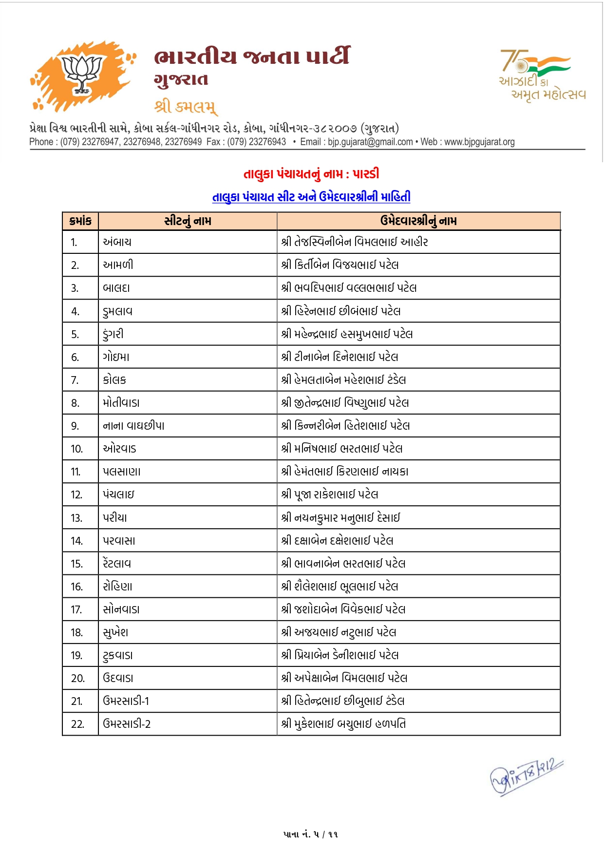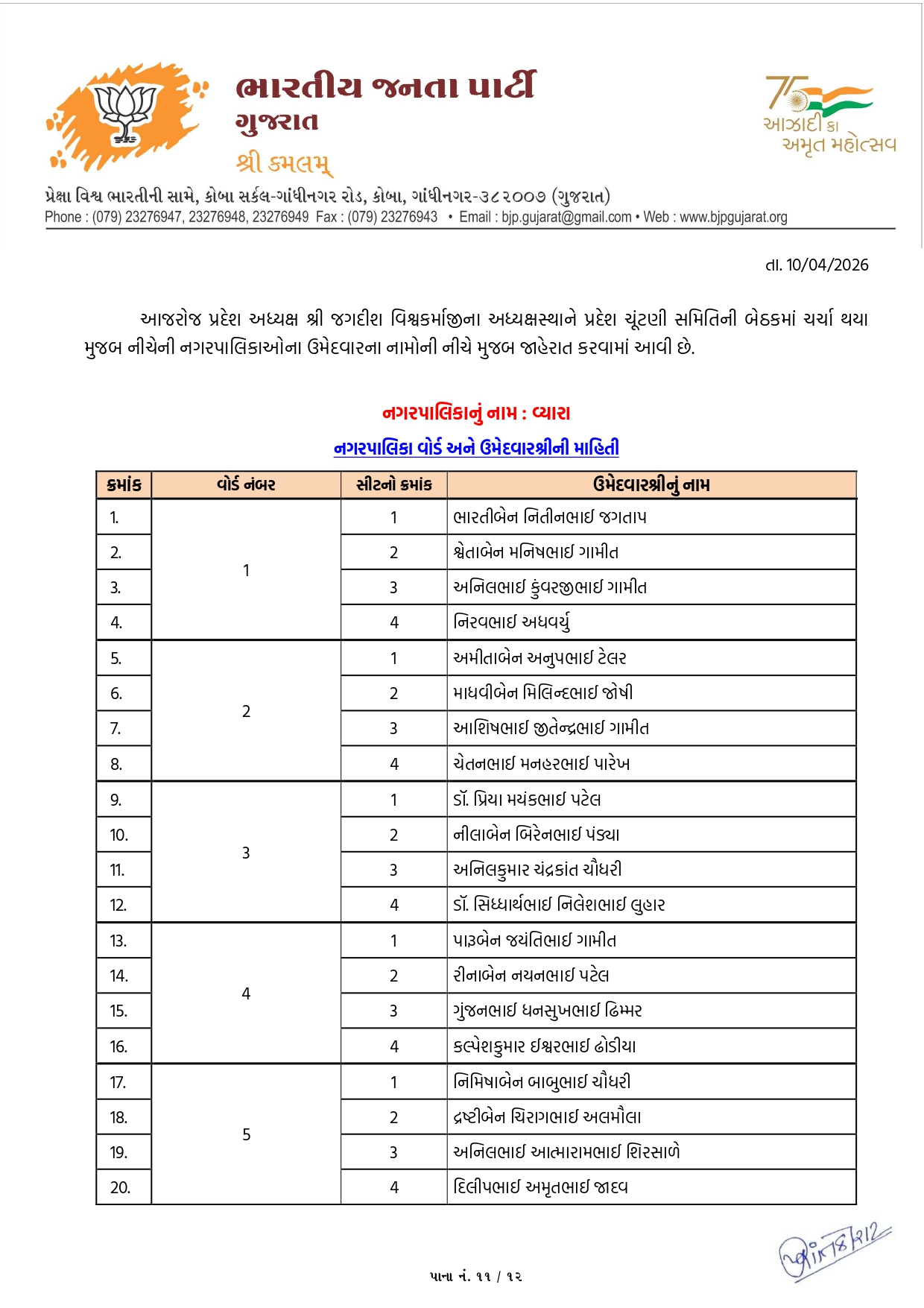 ગાંધીનગર, પાટણ અને નર્મદામાં ભાજપના ઉમેદવારોનું લિસ્ટ