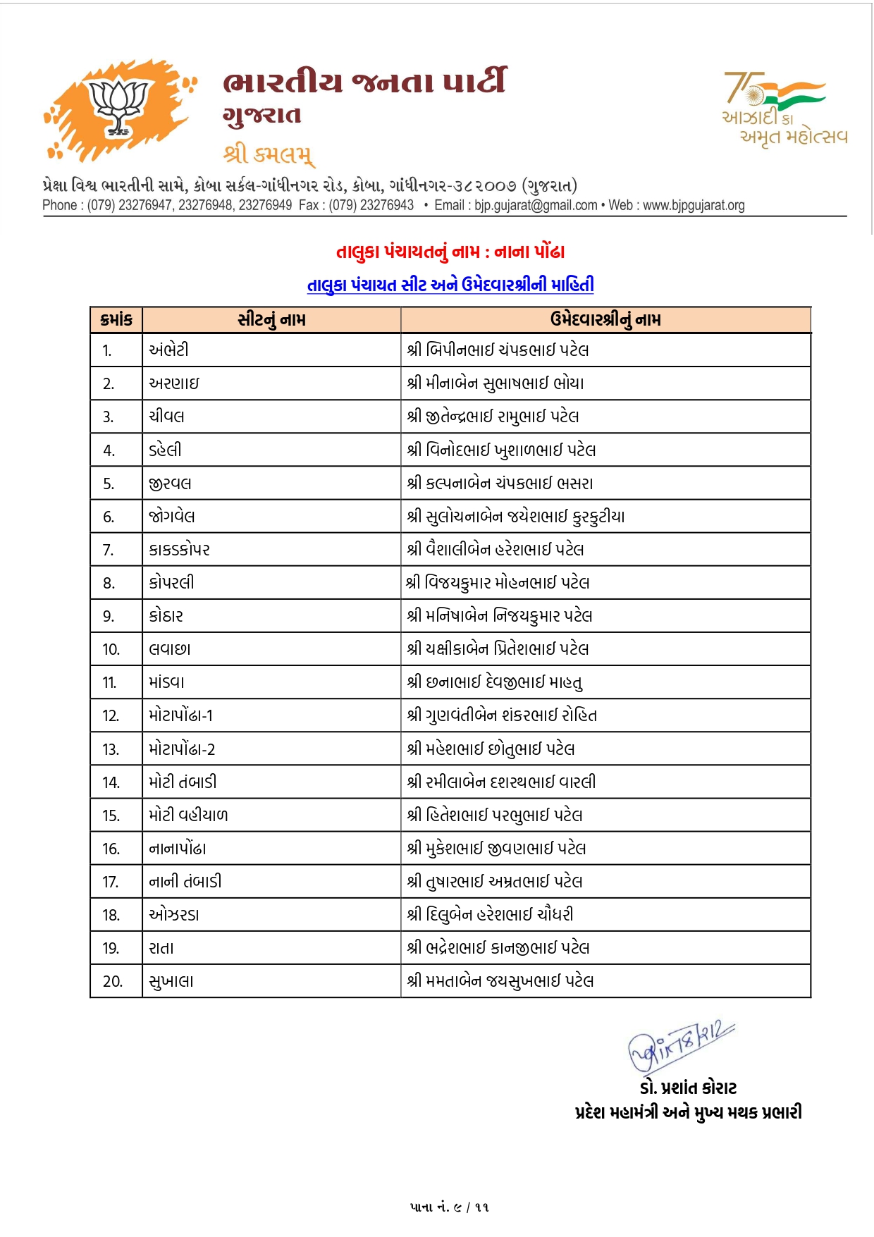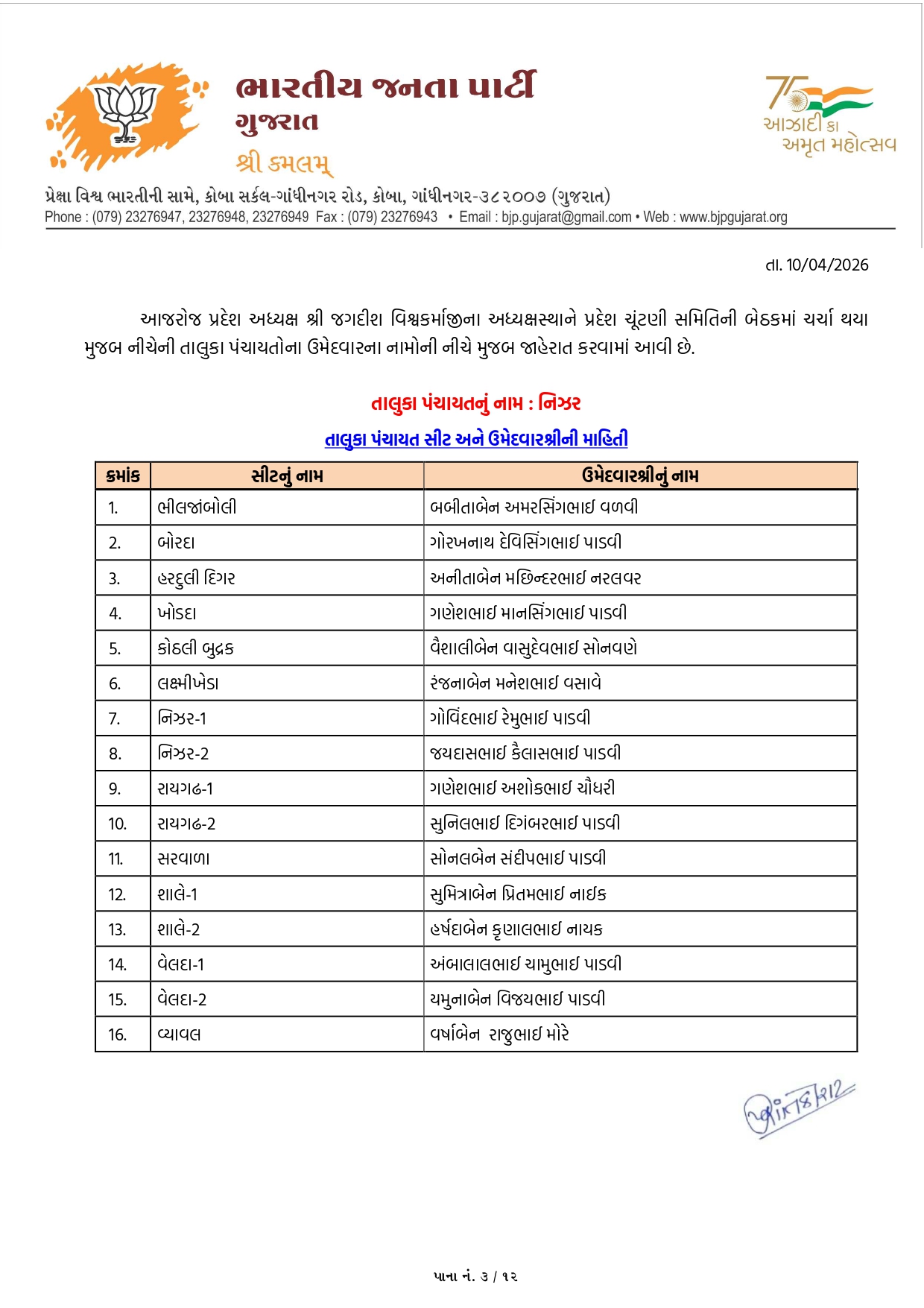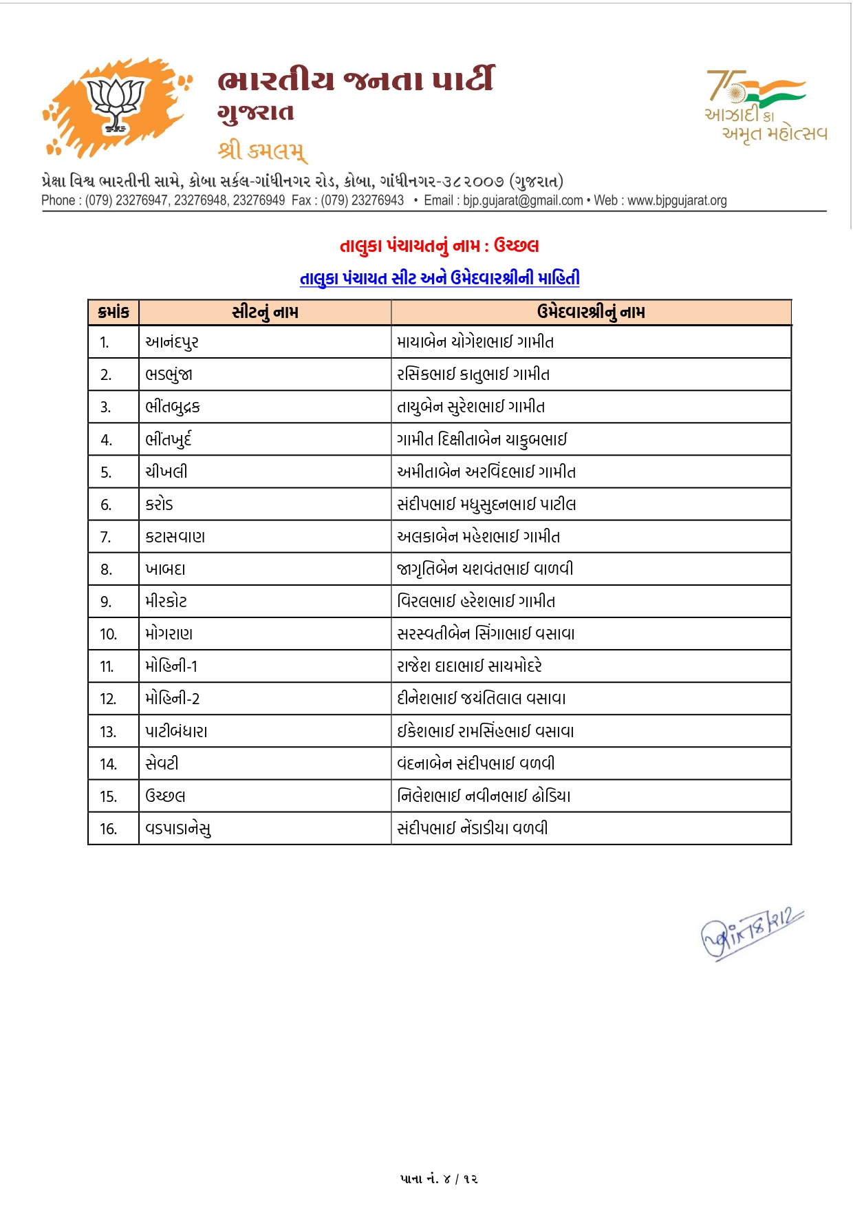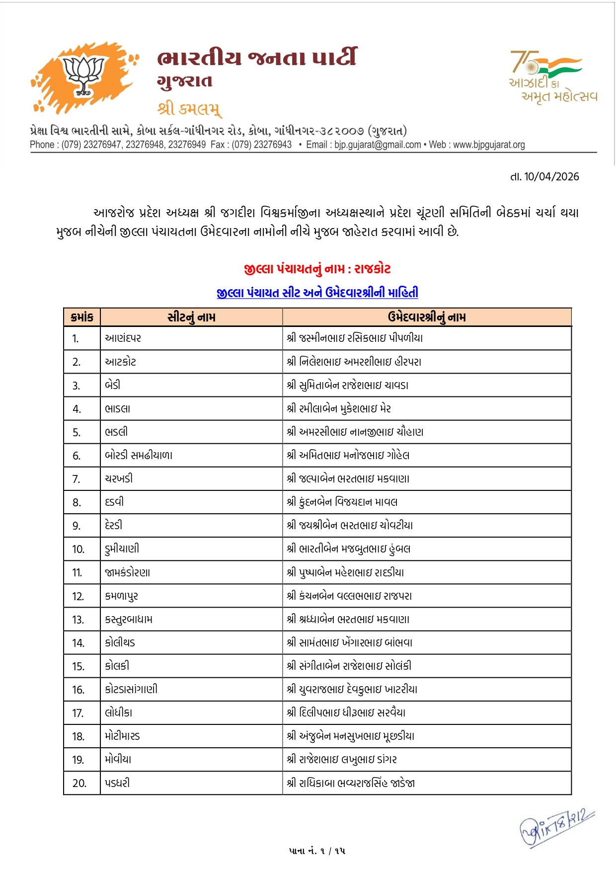 ગાંધીનગર, પાટણ અને નર્મદામાં ભાજપના ઉમેદવારોનું લિસ્ટ