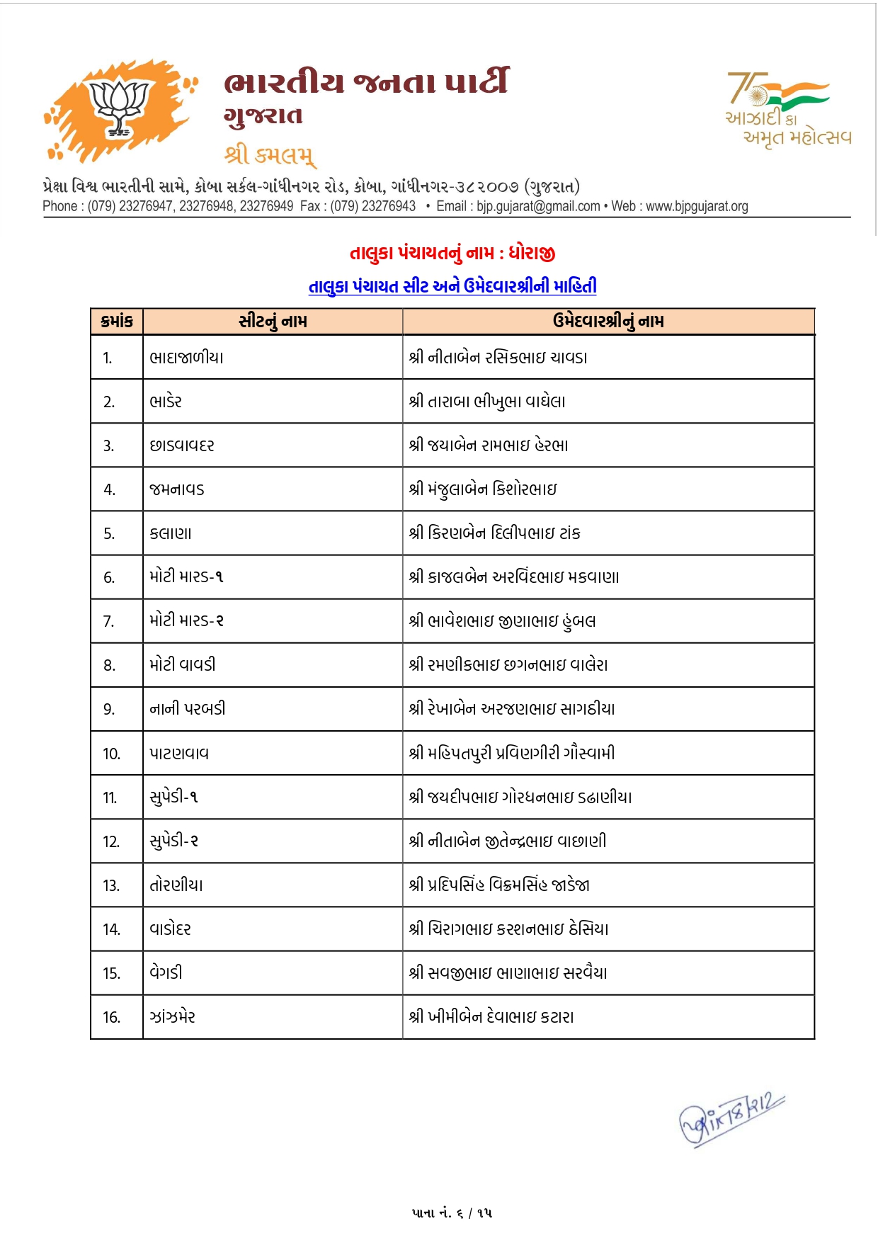 દાહોદમાં ભાજપના ઉમેદવારોનું લિસ્ટ