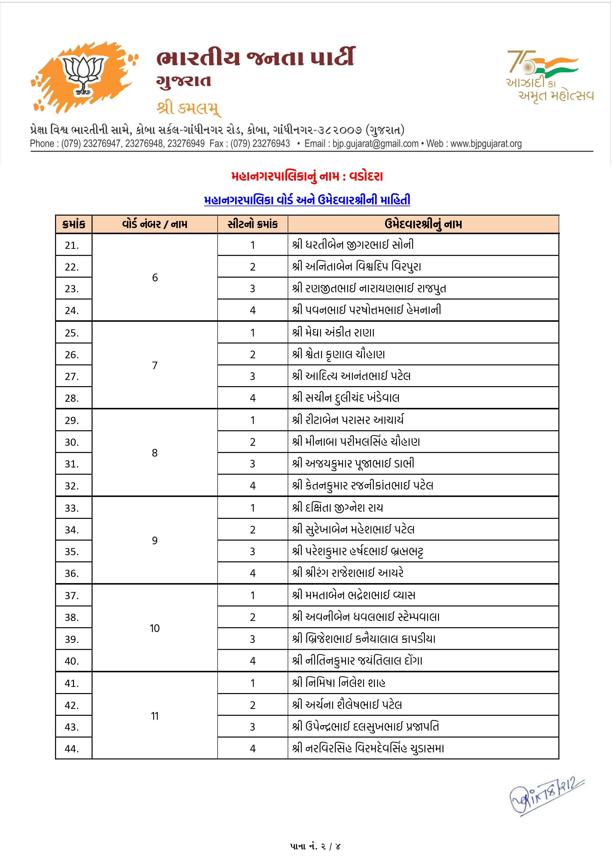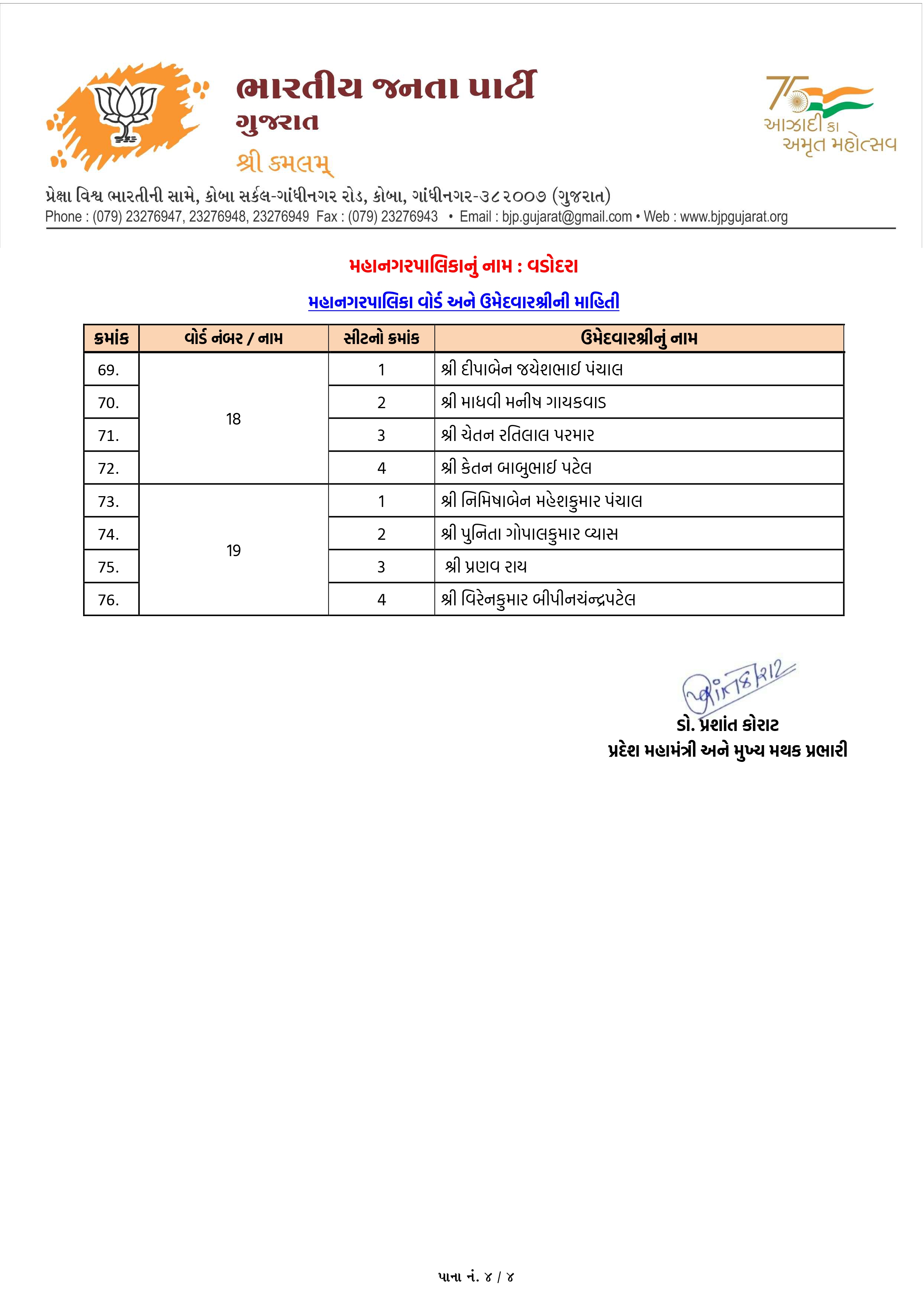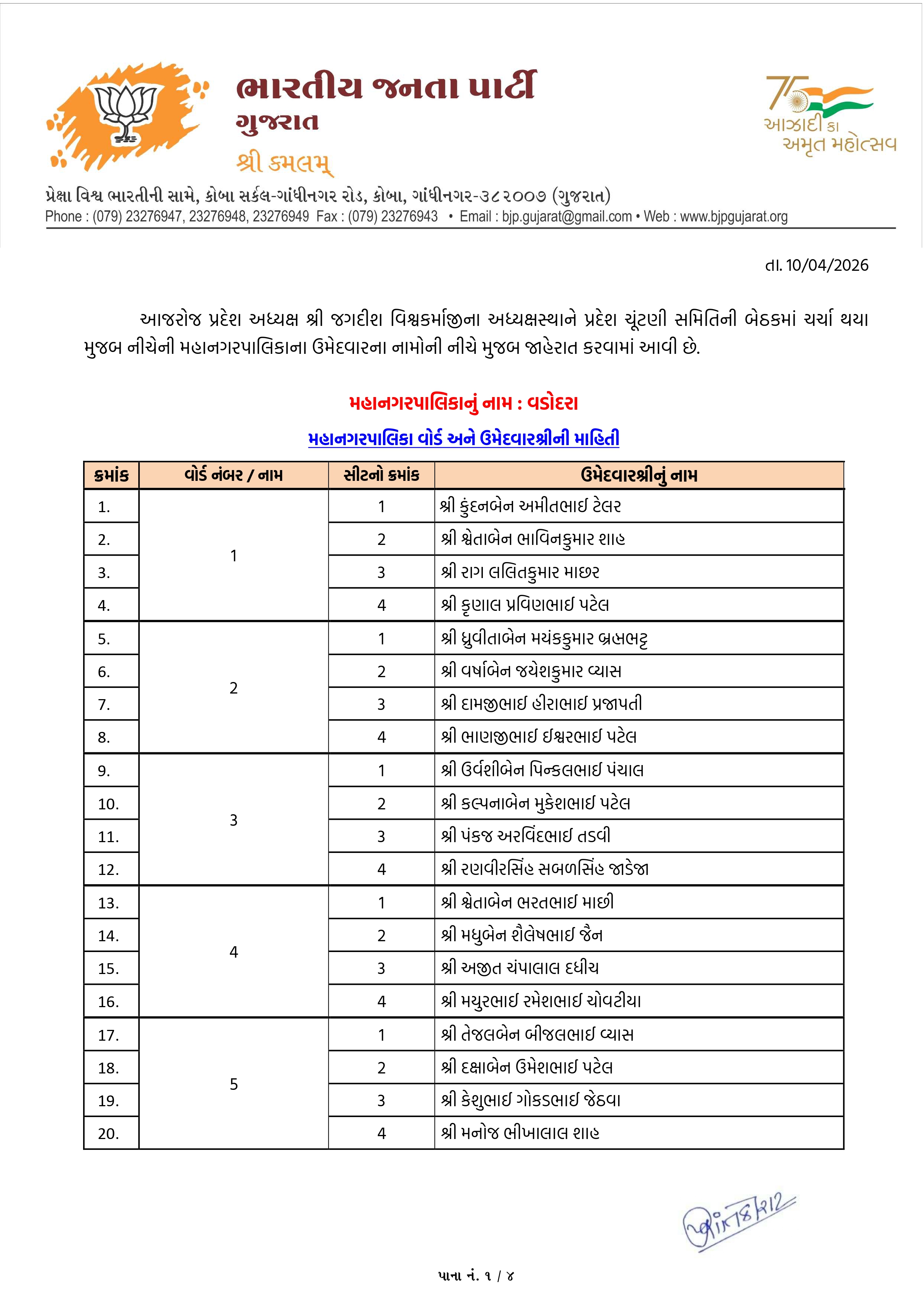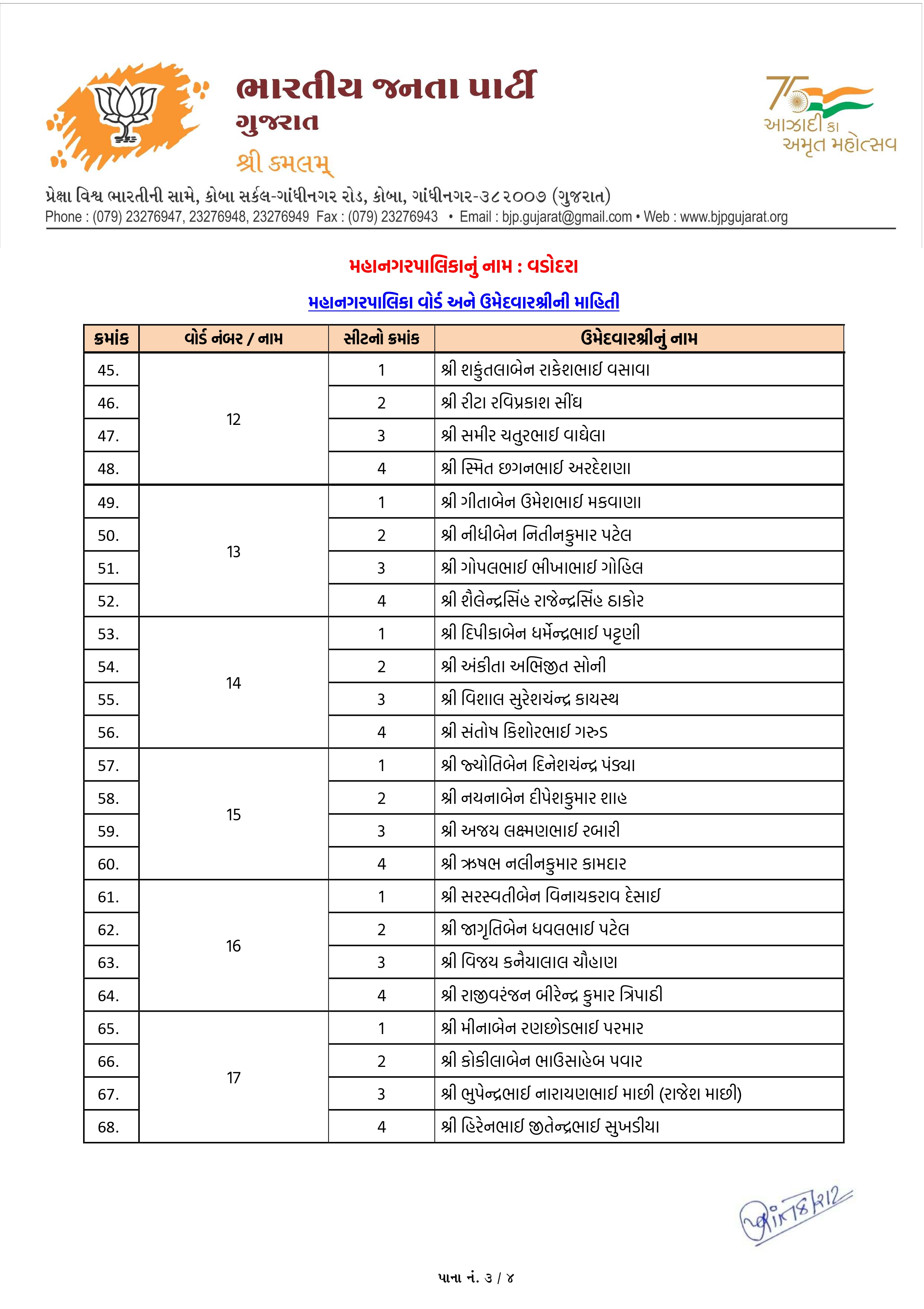 વડોદરા મનપા માટે ભાજપના ઉમેદવારોનું લિસ્ટ જાહેર