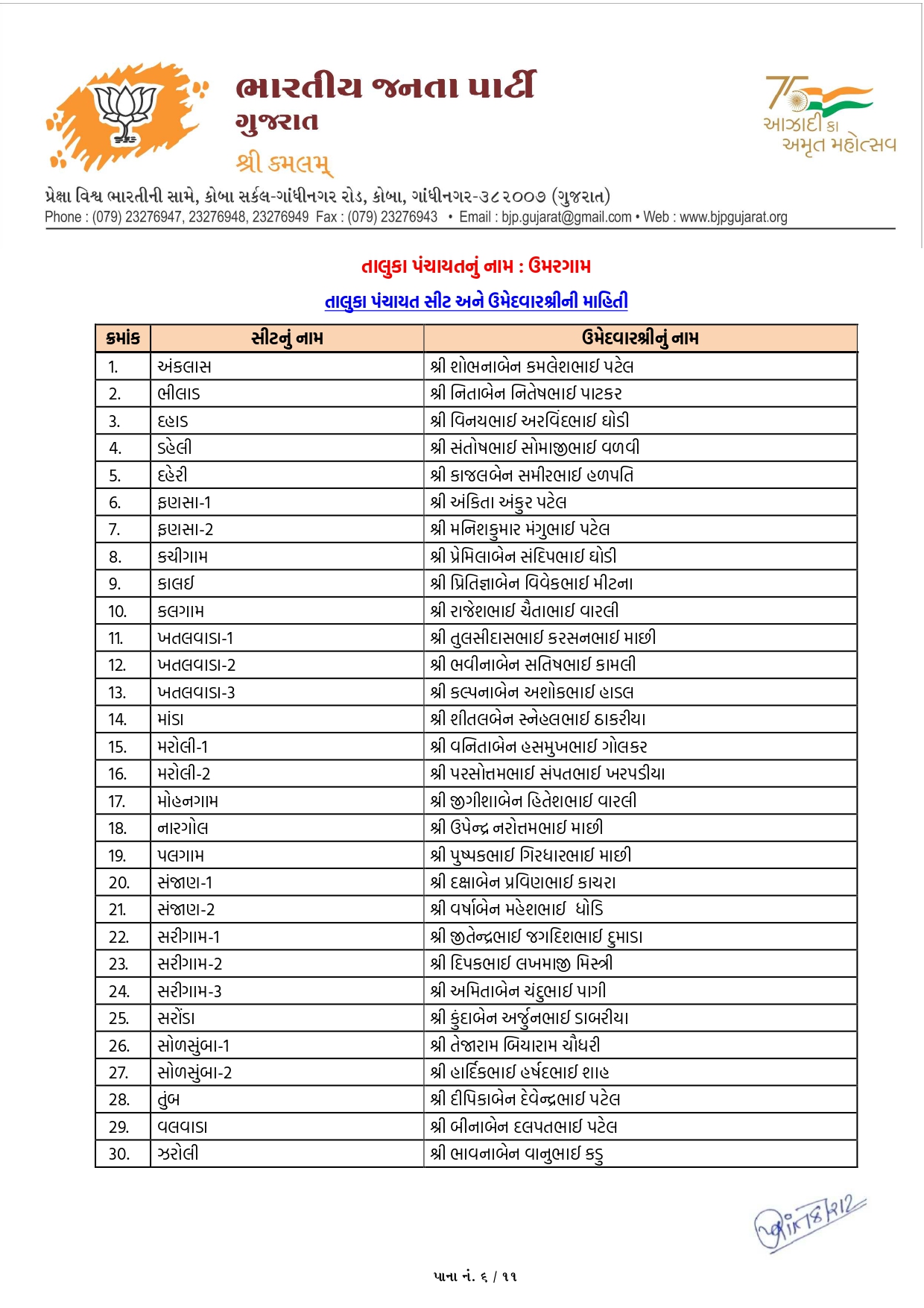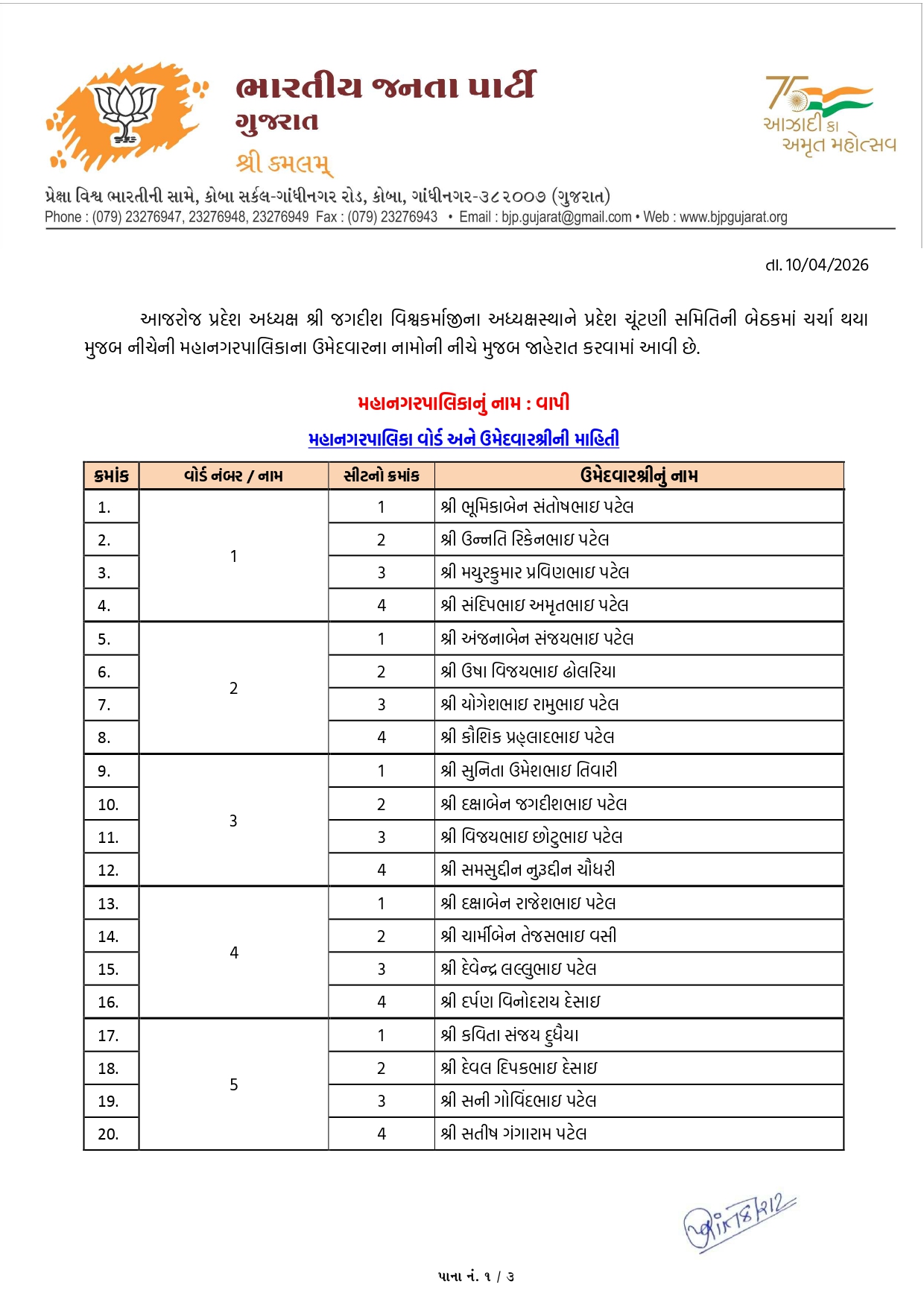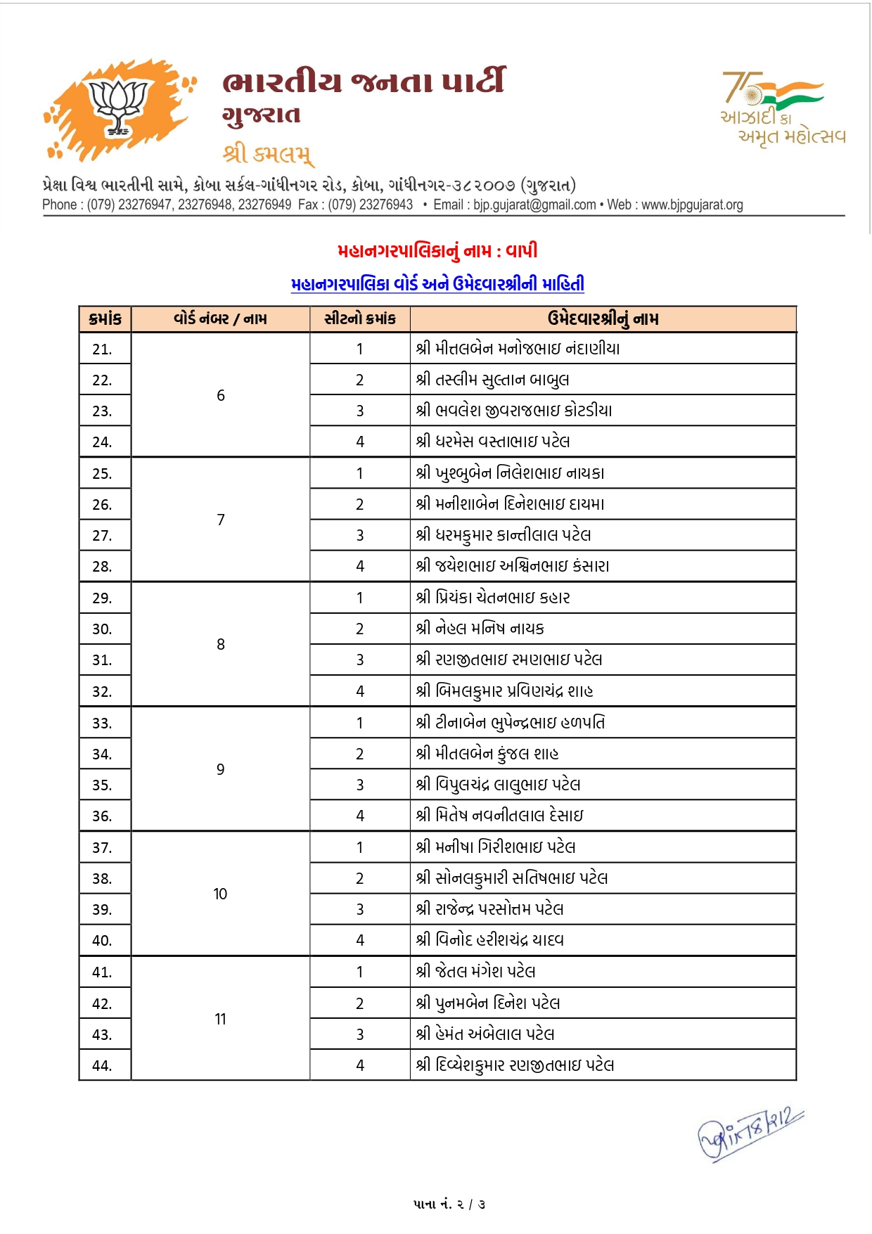 વલસાડ મહાનગરપાલિકાની ભાજપની યાદી જાહેર