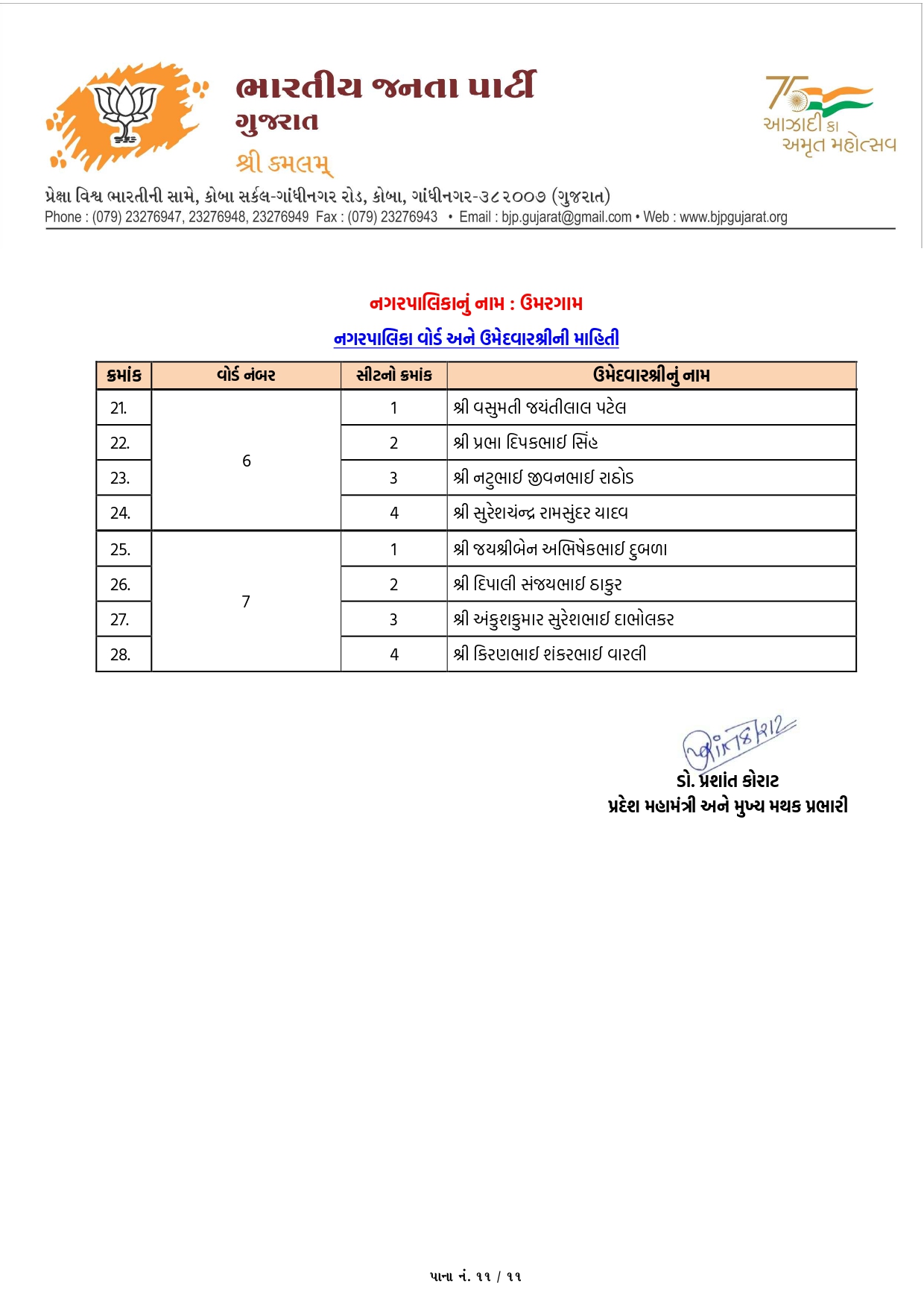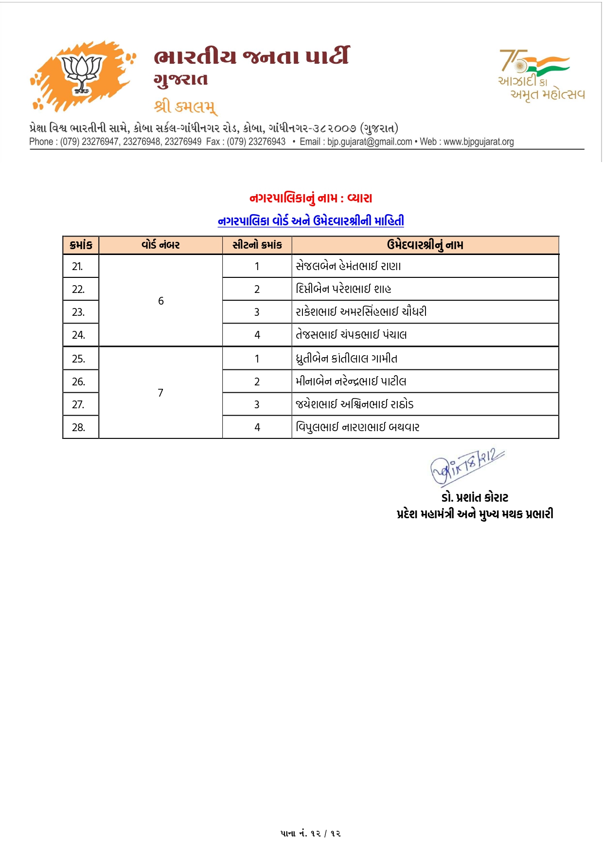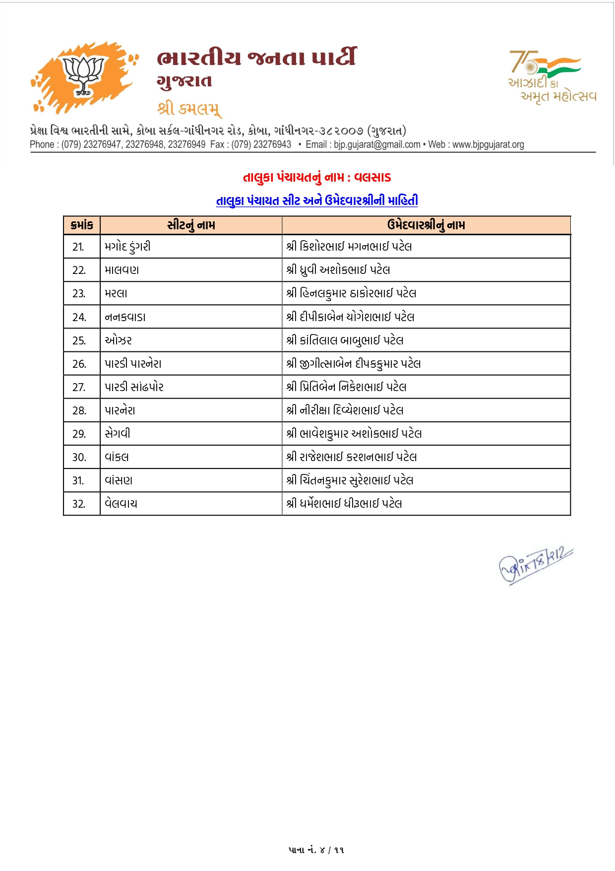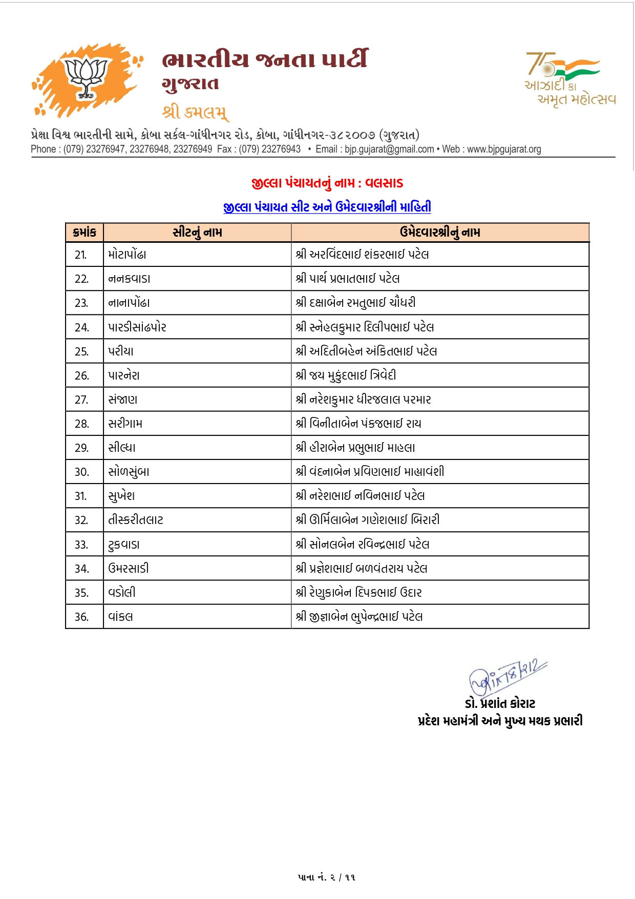 વલસાડ મહાનગરપાલિકાની ભાજપની યાદી જાહેર