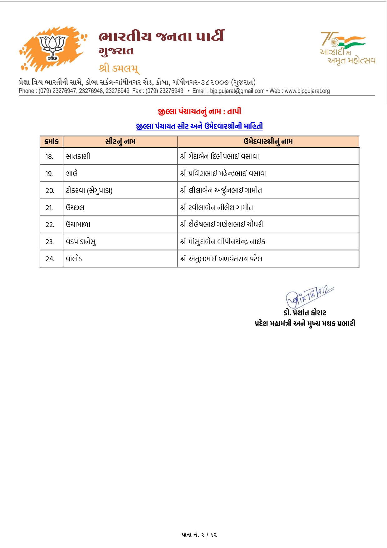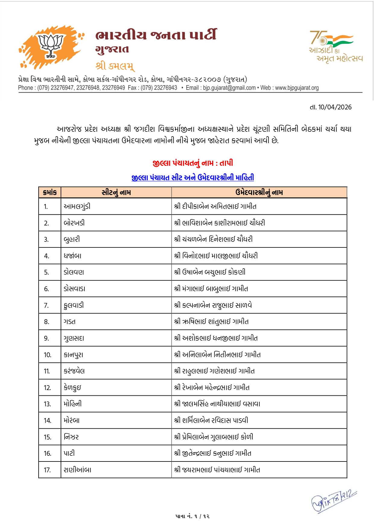 તાપી જિલ્લા પંચાયત અને તાલુકા પંચાયતની ભાજપની યાદી