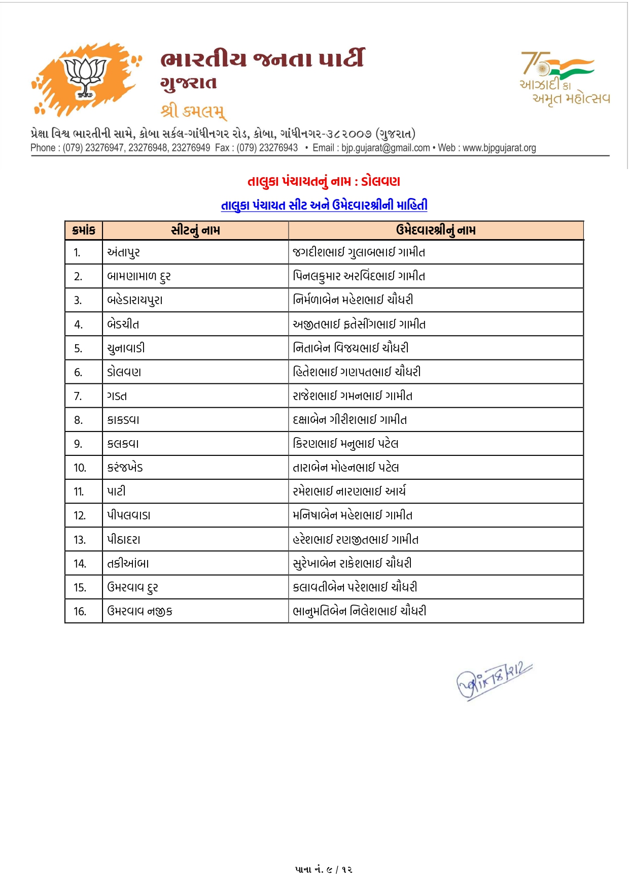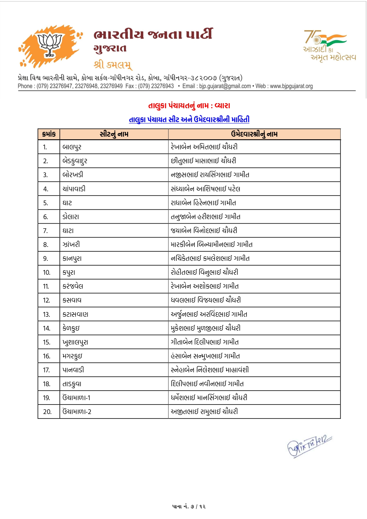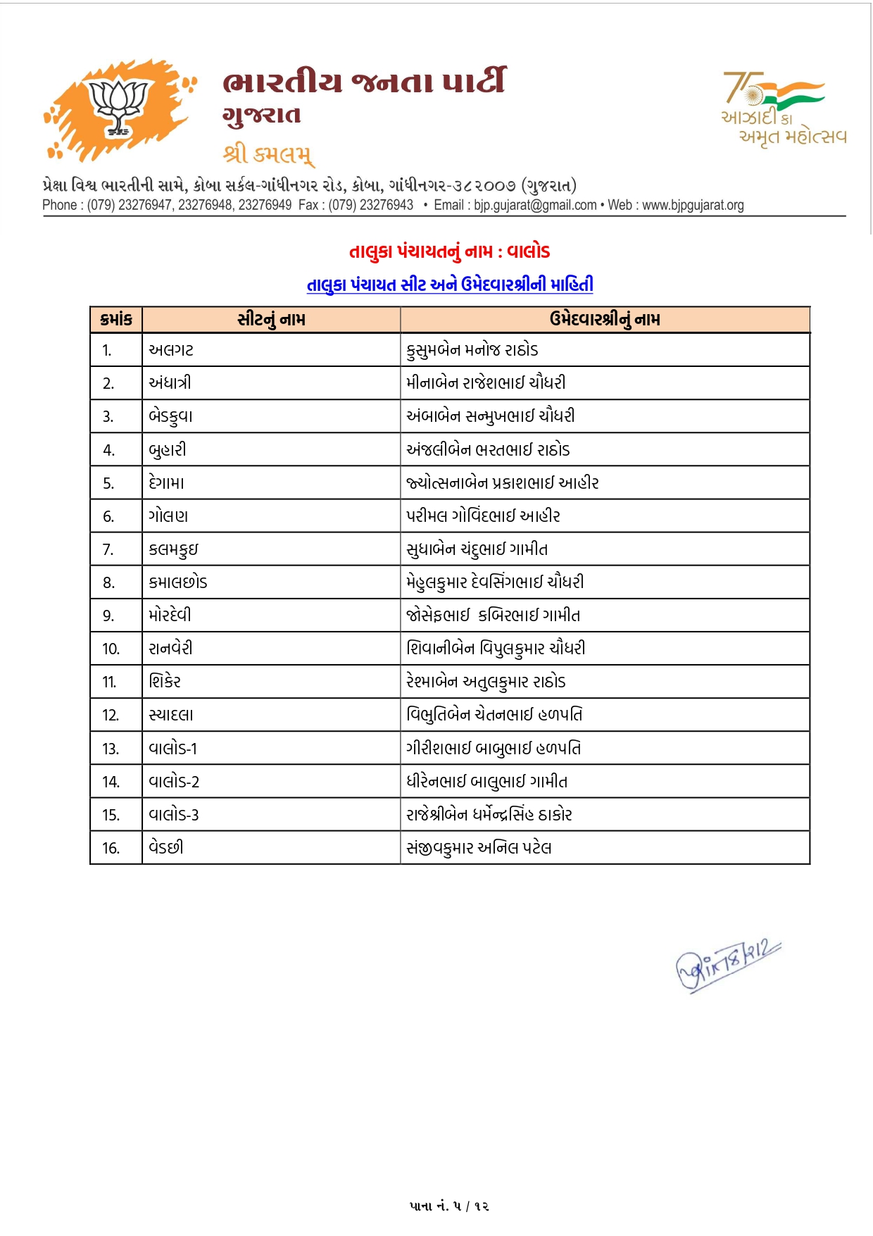 પંચમહાલમાં ભાજપના ઉમેદવારોનું લિસ્ટ