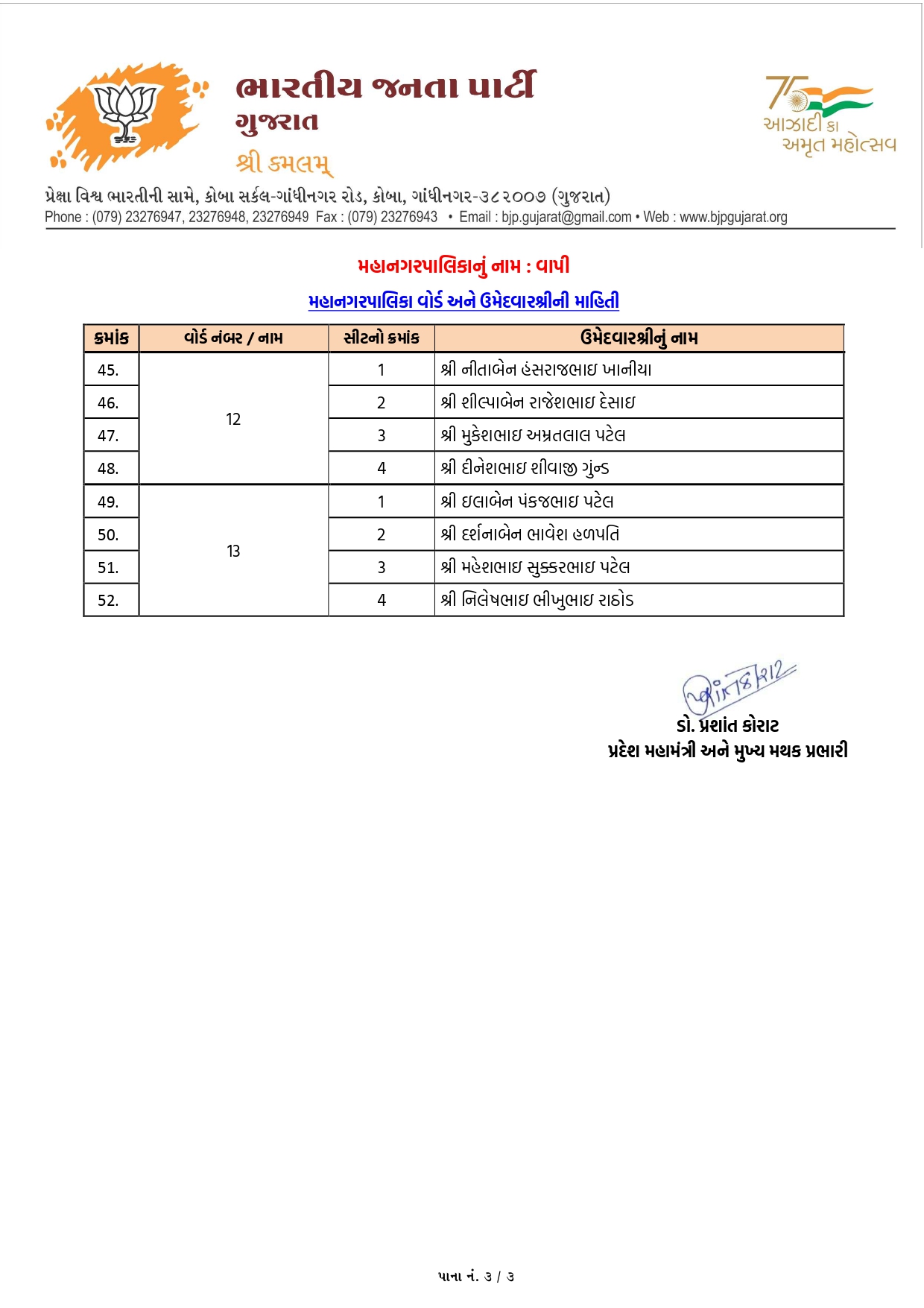 વાપી મહાનગરપાલિકાની ભાજપની યાદી જાહેર