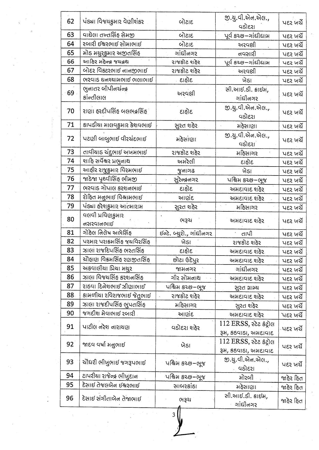 ૩ ચાવડા ભરતસિંહ રમાભાઈ ડાંગ-આહવાથી અમદાવાદ શહેર ખાતે બદલી કરાઈ