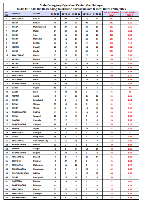 સ્ટેટ ઇમરજન્સી ઓપરેશન સેન્ટર, ગાંધીનગરના અહેવાલ મુજબ, ખેડાના માતર તાલુકામાં 7 ઇંચ કરતાં વધુ તેમજ વસો, મહુધા અને કઠલાલ તાલુકામાં 5 ઇંચ કરતા વધુ વરસાદ નોંધાયો છે. આ ઉપરાંત આણંદના ઉમરેઠ અને ખેડા તાલુકામાં 4-4 ઇંચ જેટલો વરસાદ વરસ્યો છે.