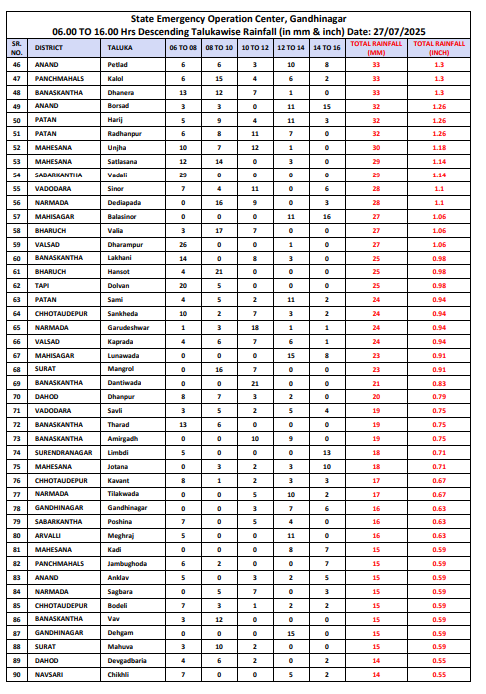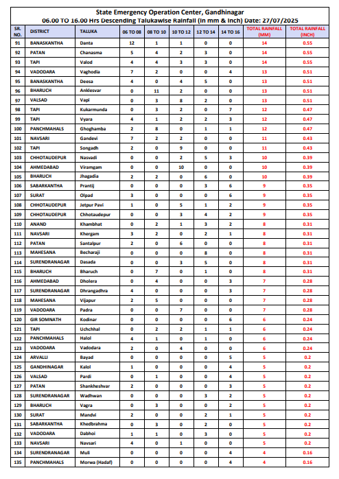 રાજ્યના 8 તાલુકામાં 3 ઇંચ કરતા વધુ વરસાદ, 18 તાલુકામાં 2 ઇંચથી વધુ, 30 તાલુકામાં એક ઈંચથી વધુ જ્યારે, કુલ 112 તાલુકામાં એક ઇંચ કરતા ઓછો વરસાદ નોંધાયો છે. અત્રે ઉલ્લેખનીય છે કે, આજે તા. 27 જુલાઈ, 2025ના રોજ સવારે 6:00 કલાક સુધીમાં રાજ્યમાં મોસમનો કુલ સરેરાશ વરસાદ 58 ટકા નોંધાયો છે, જેમાં સૌથી વધુ કચ્છ વિસ્તારમાં 64 ટકા અને સૌથી ઓછો સૌરાષ્ટ્ર વિસ્તારમાં 54 ટકા જેટલો નોંધાયો છે.