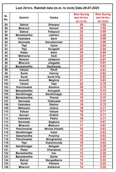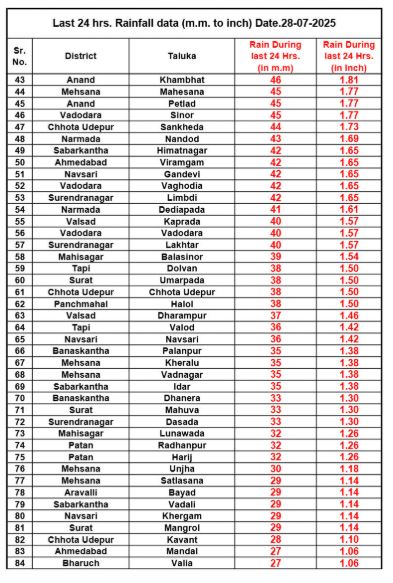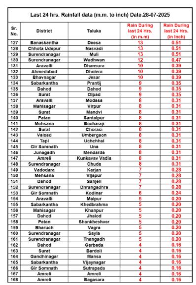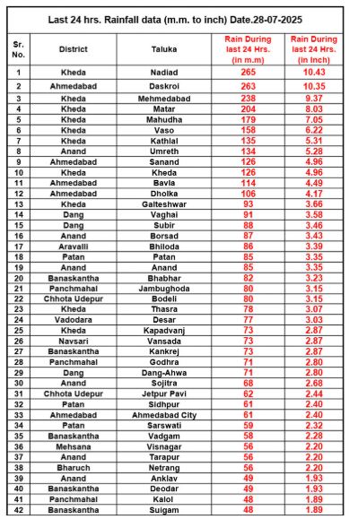 અમદાવાદ જિલ્લાના દસ્ક્રોઈમાં 10.35 ઇંચ અને મહેમદાદમાં 9.37 ઇંચ વરસાદ પડ્યો છે. આ ઉપરાંત માતરમાં 8.03 ઇંચ, મહુધામાં 7.05 ઇંચ, વસો ખાતે 6.22 ઇંચ, કઠલાલમાં 5.31 ઇંચ, ઉમરેઠમાં 5.28 ઇંચ, સાણંદમાં 4.96 ઇંચ તથા ખેડા તાલુકામાં પણ 4.96 ઇંચ વરસાદ નોંધાયો છે. રાજ્યના કુલ 24 તાલુકાઓમાં 3 ઇંચથી વધુ વરસાદ નોંધાયો છે.